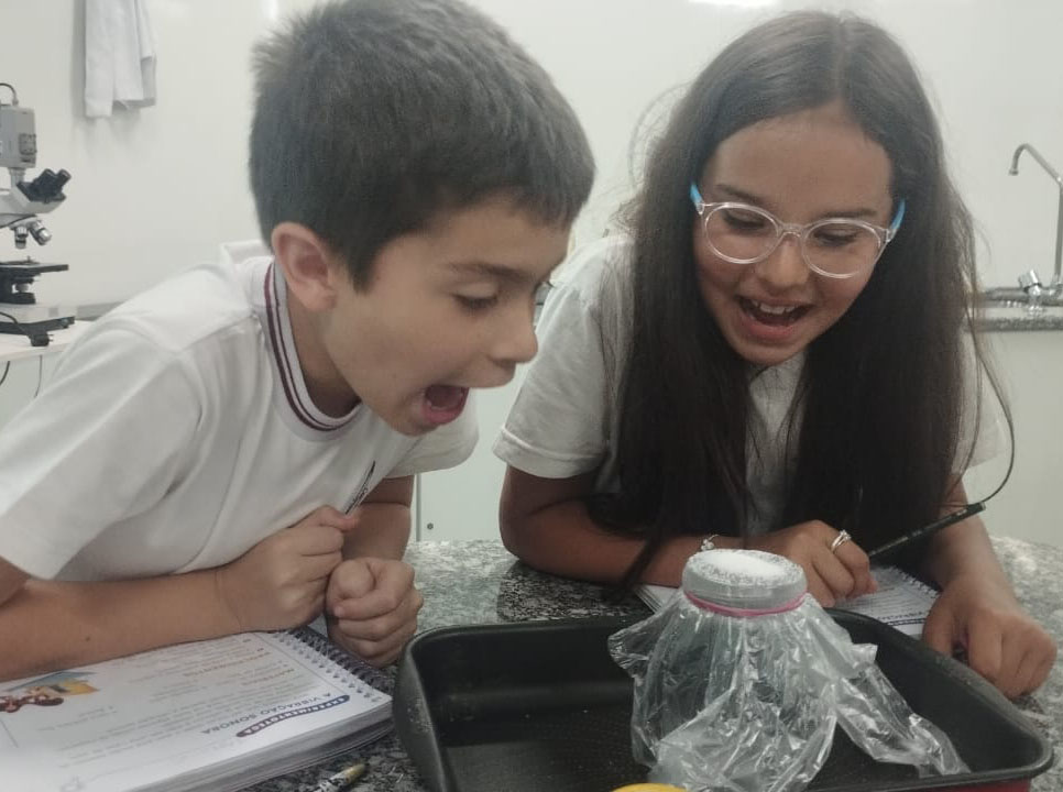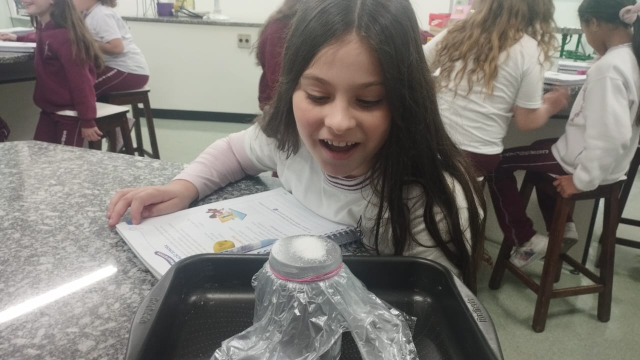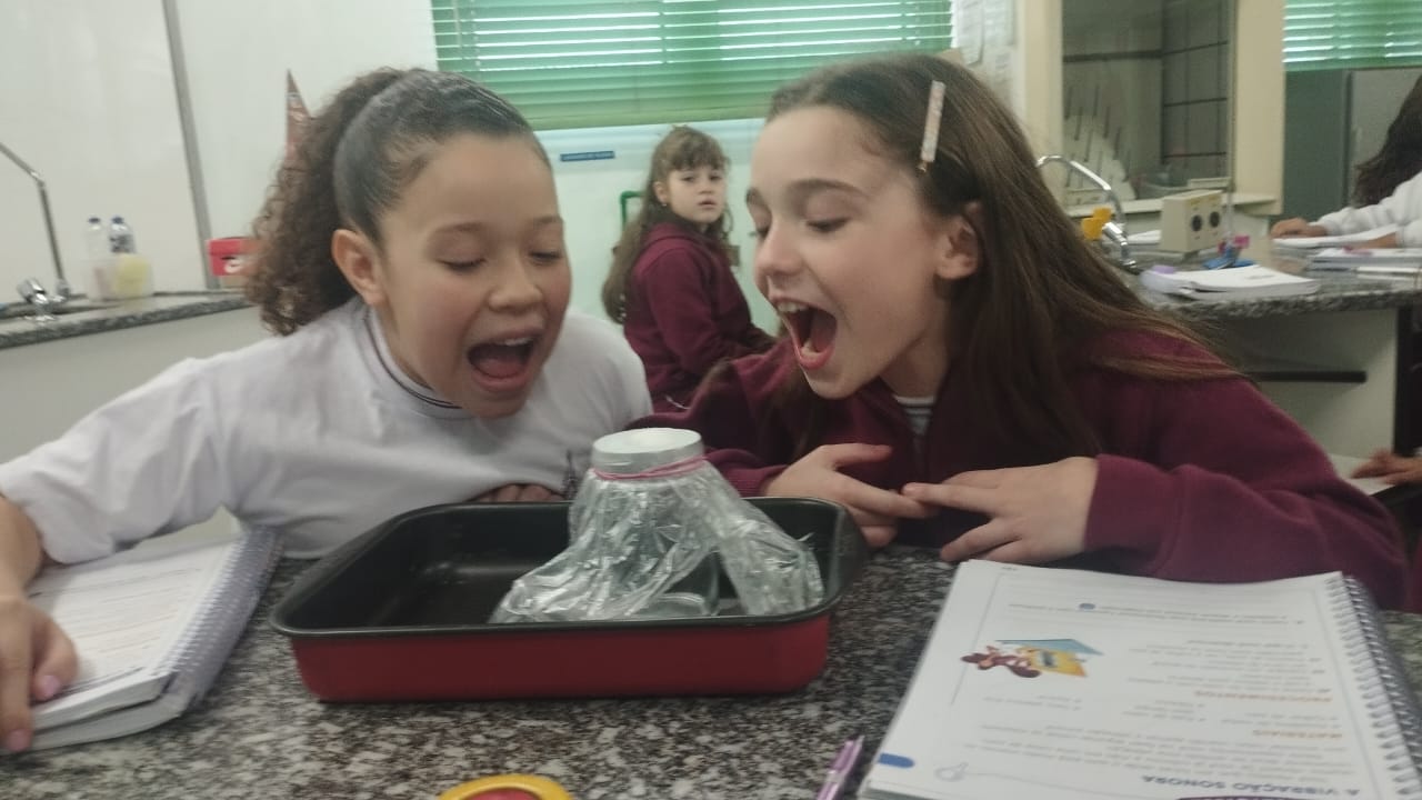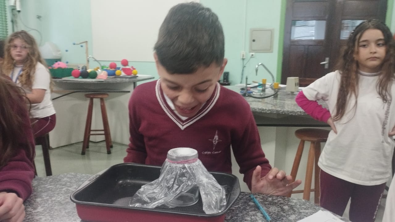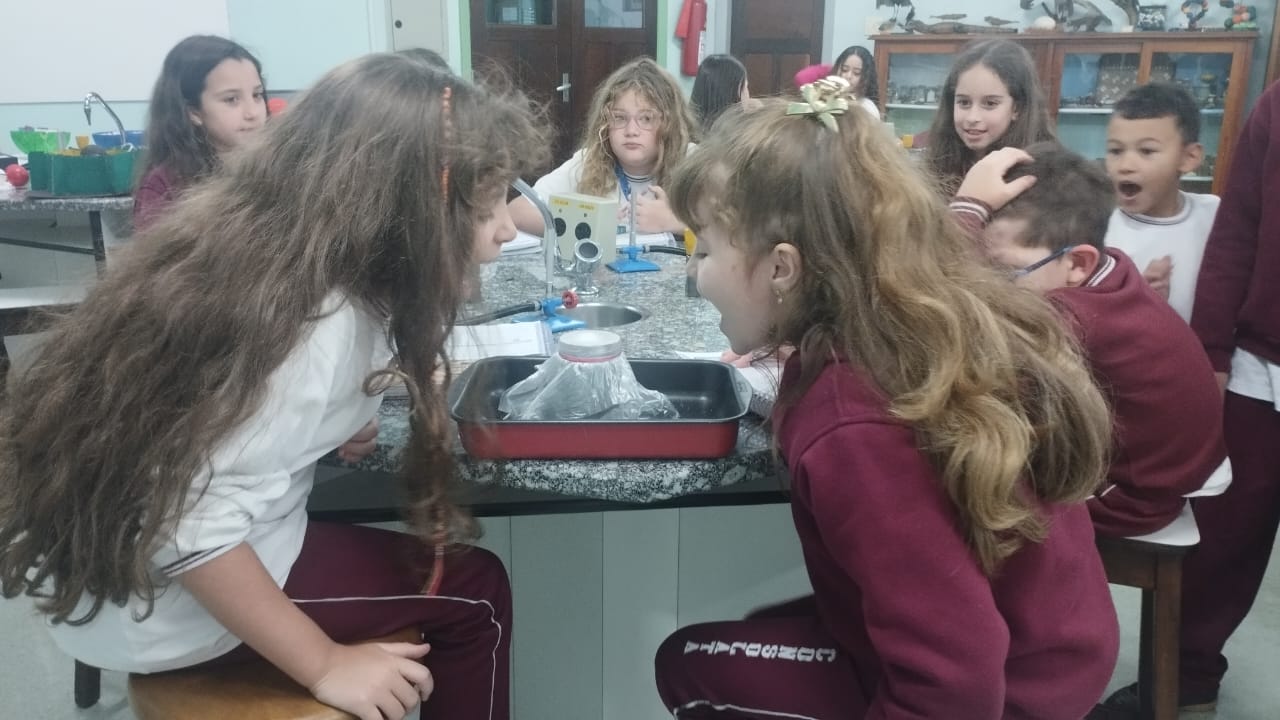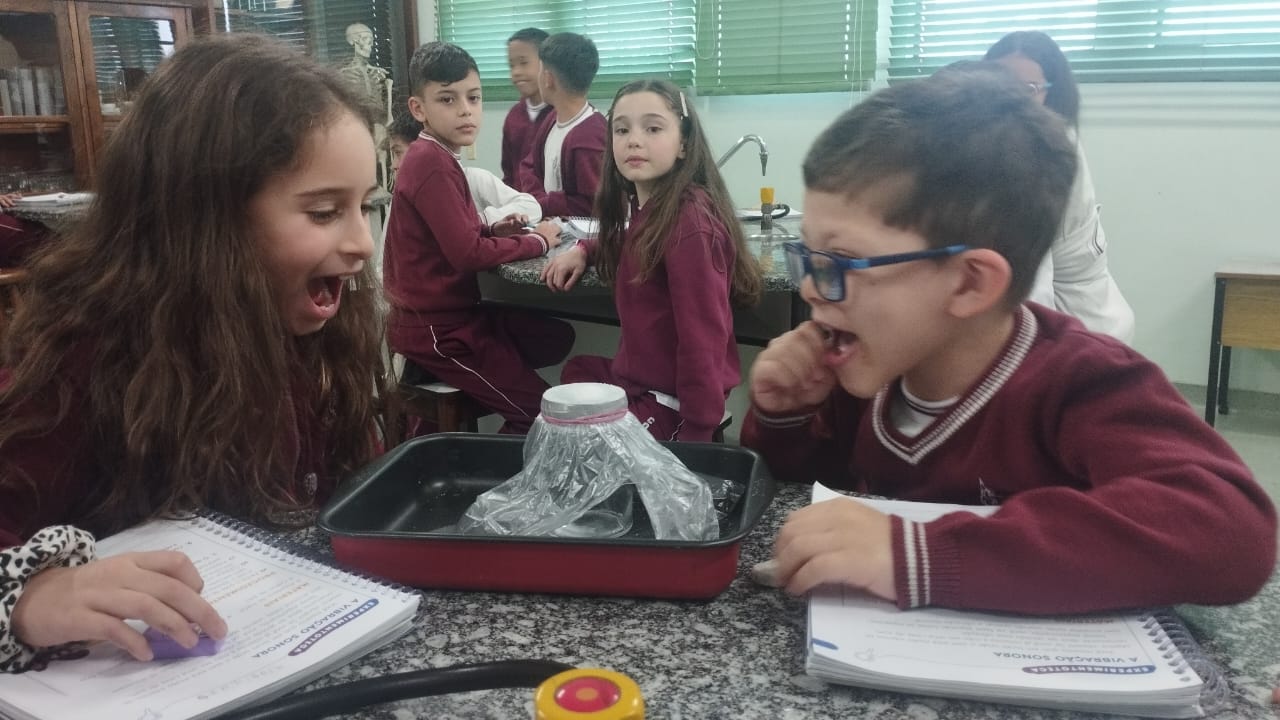 O 3º ano visitou o laboratório de ciências para a experiência de ver o açúcar vibrar com o som produzido com a voz. O efeito da vibração sonora ocorre próximo a um som muito intenso.