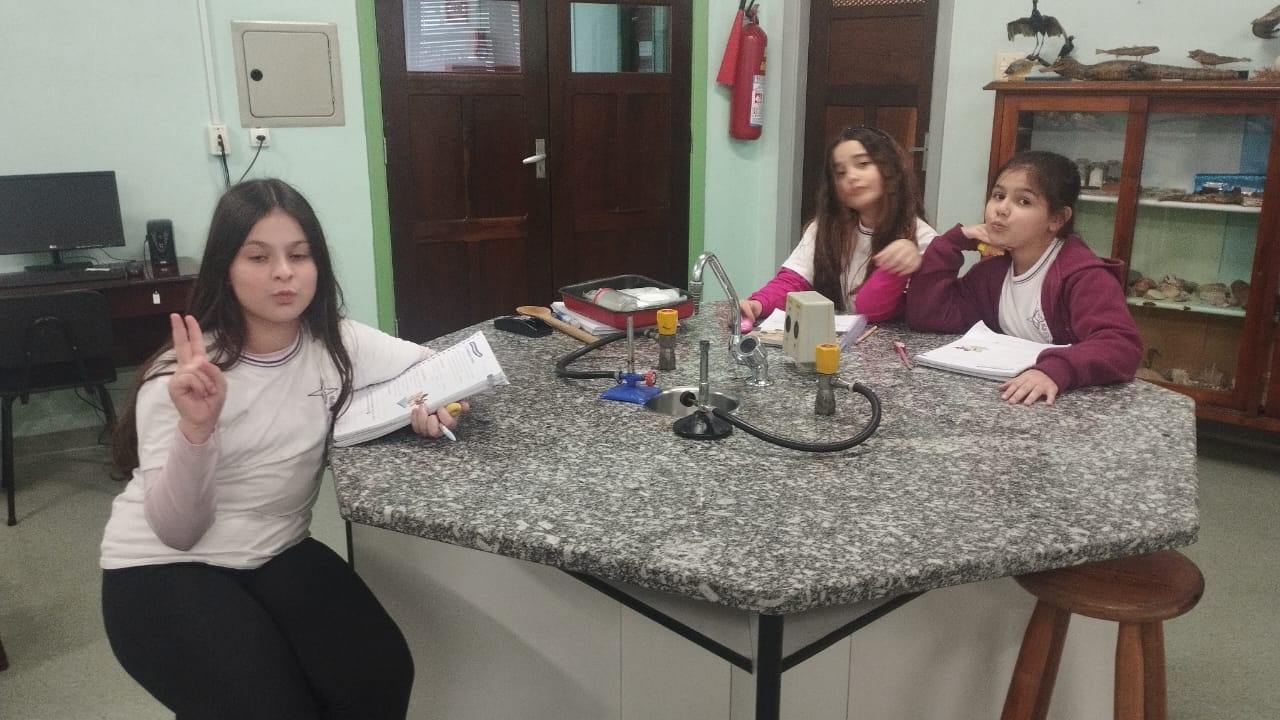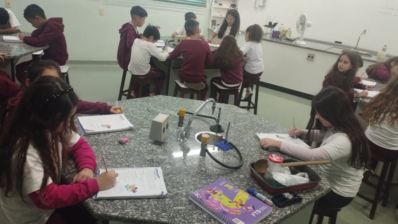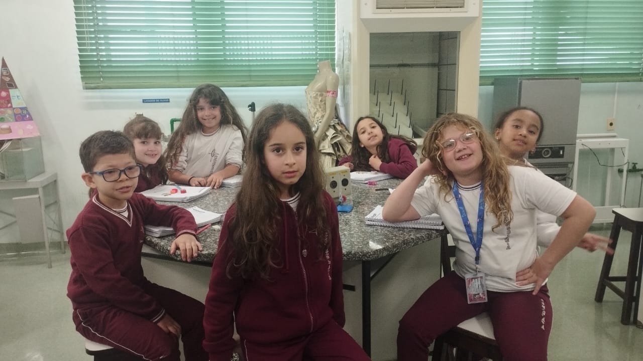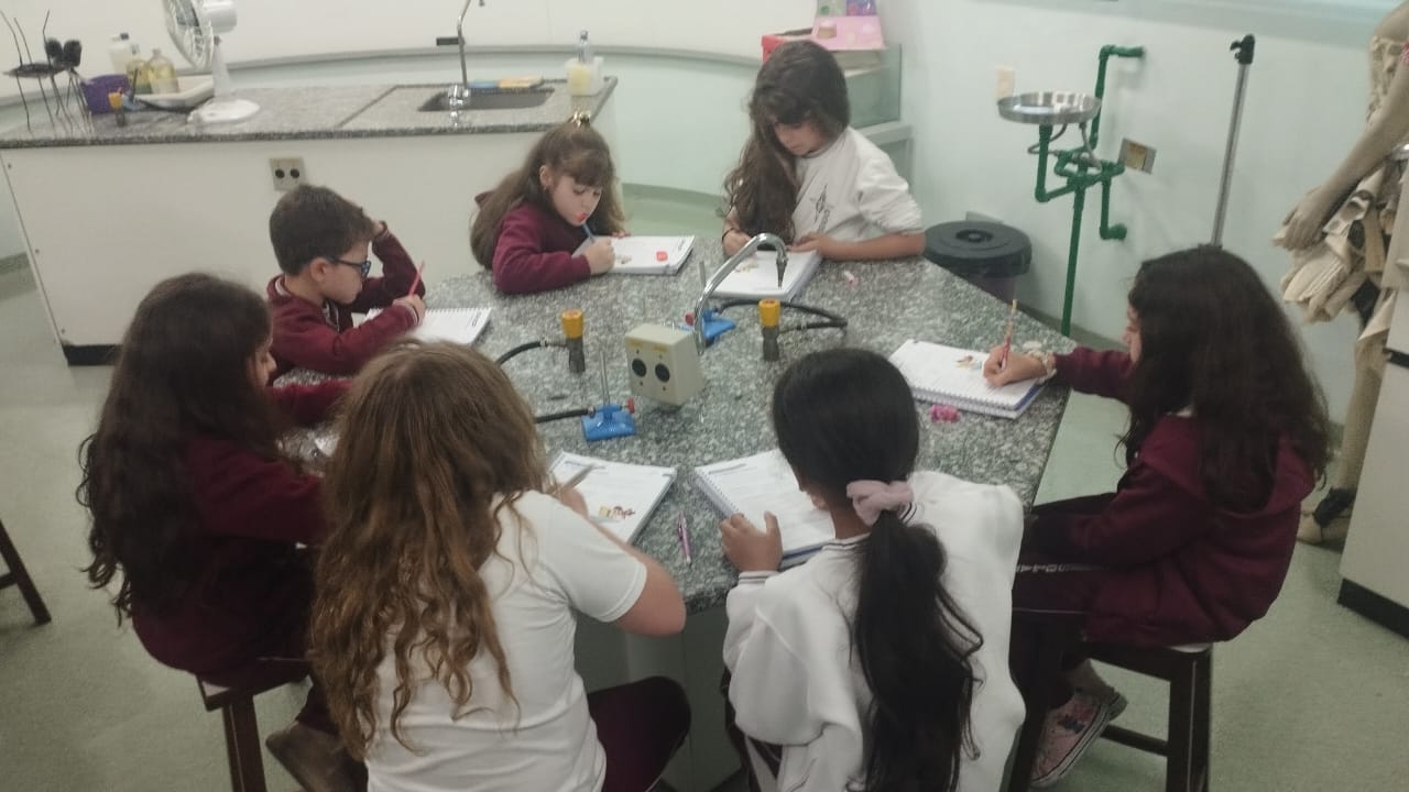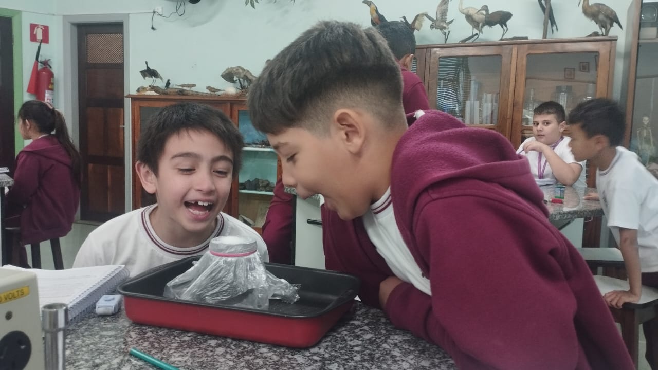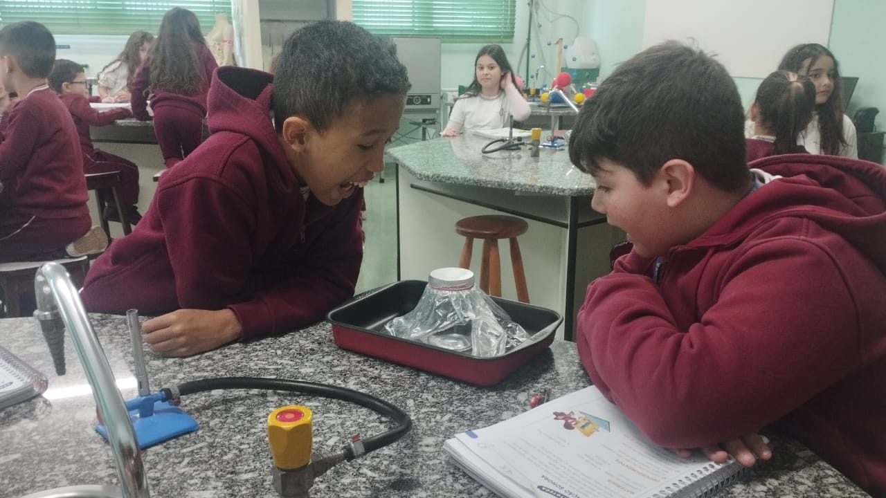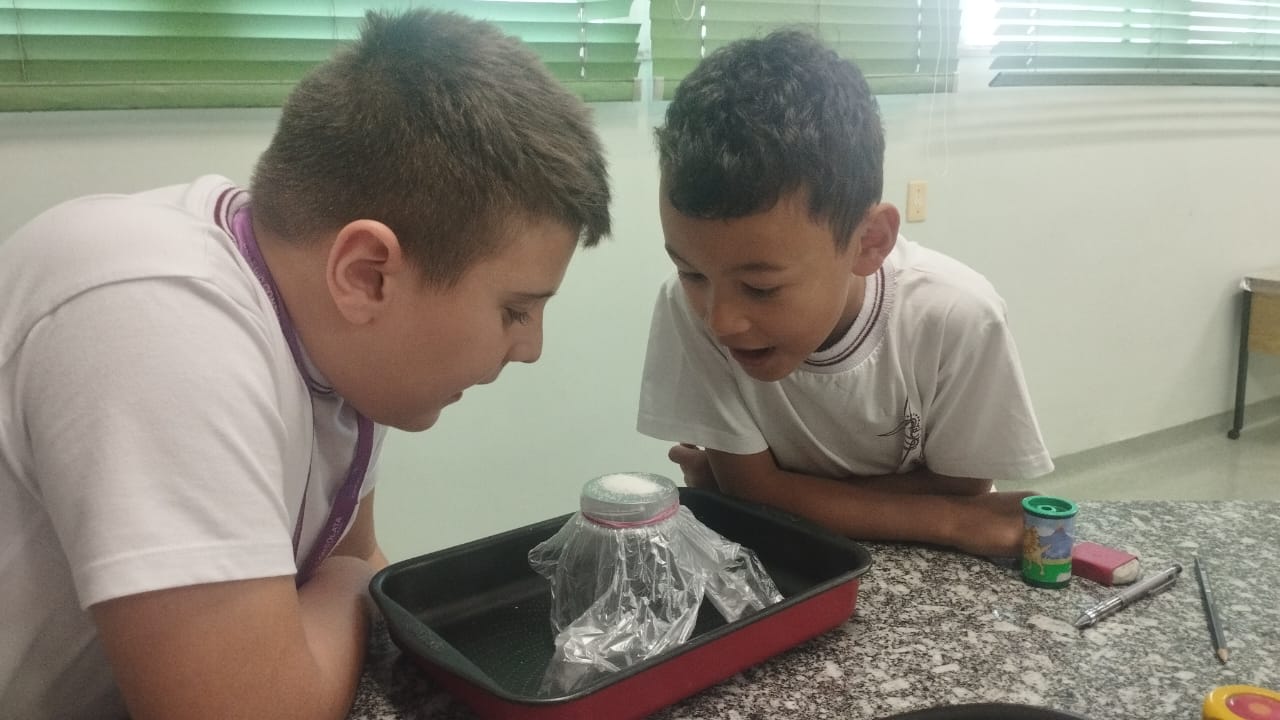 O 3º ano visitou o laboratório de ciências para a experiência de ver o açúcar vibrar com o som produzido com a voz. O efeito da vibração sonora ocorre próximo a um som muito intenso.