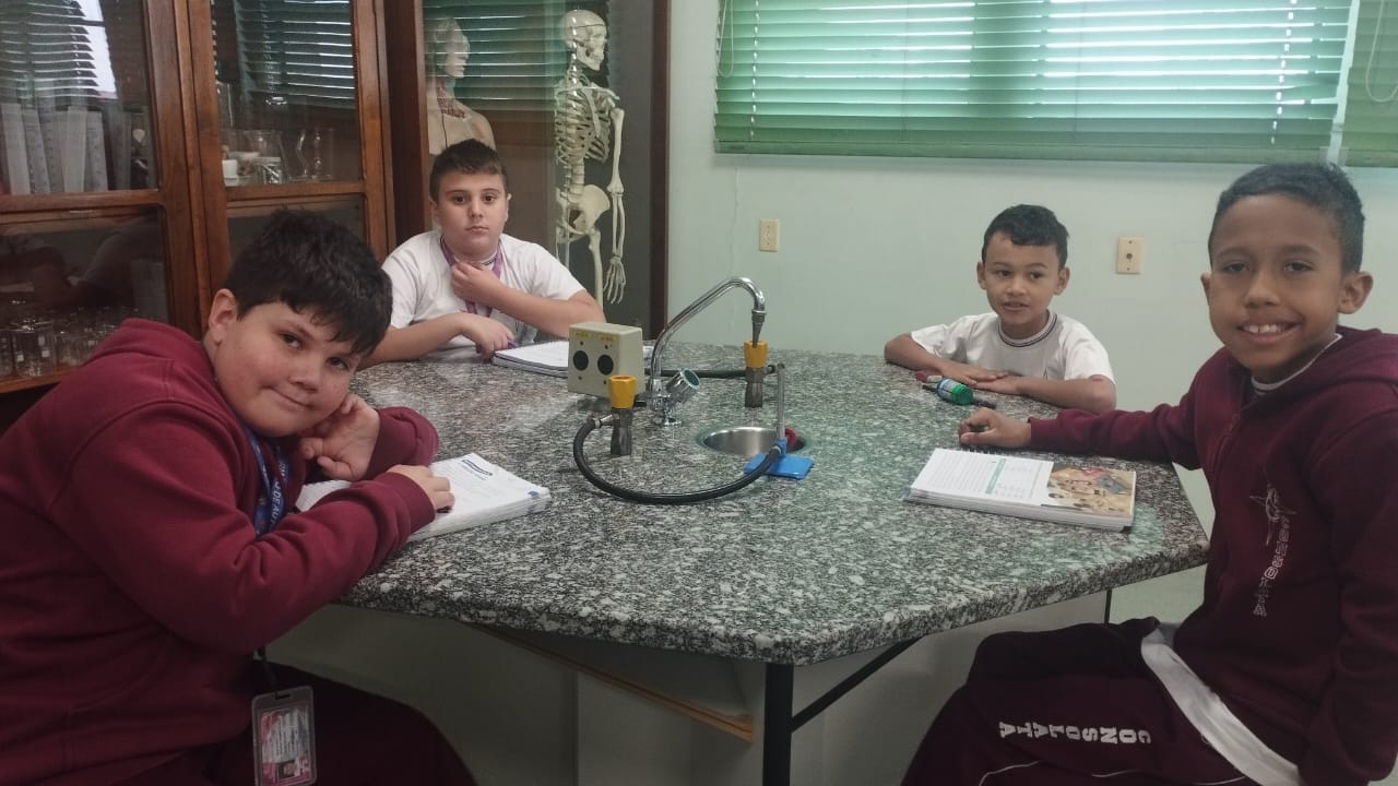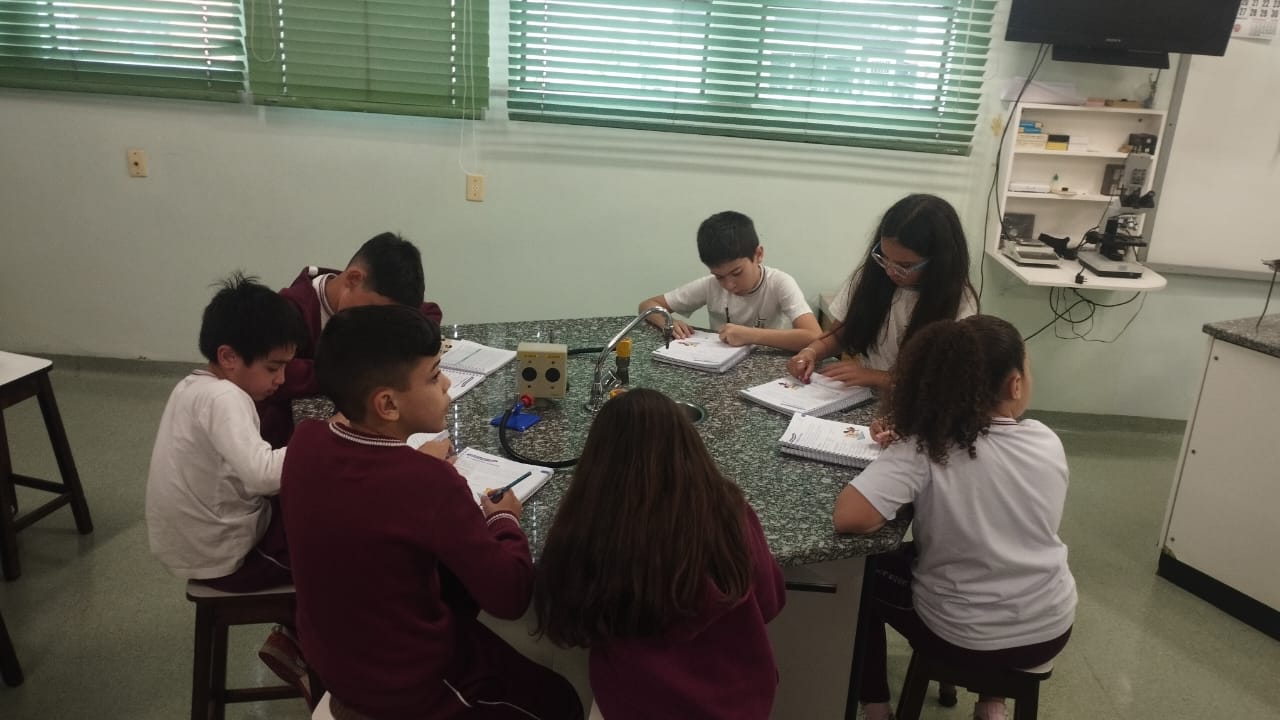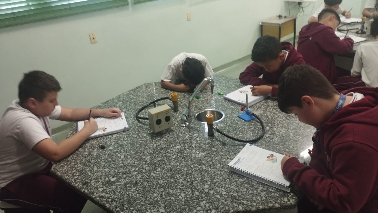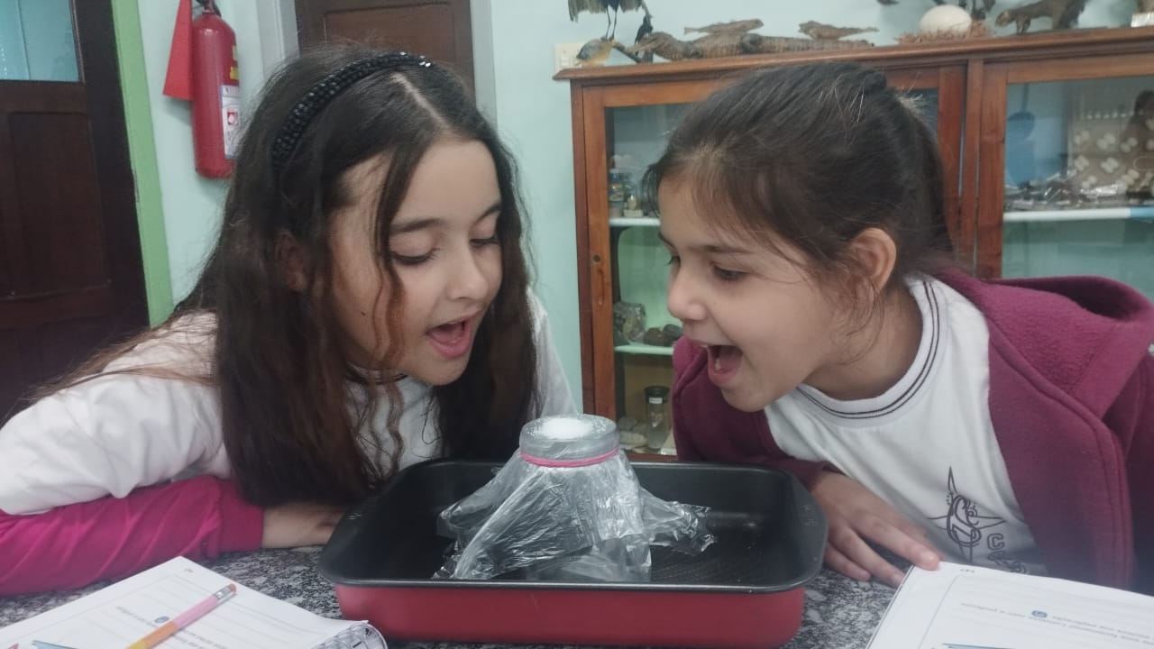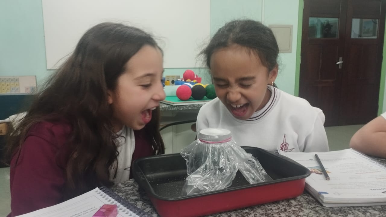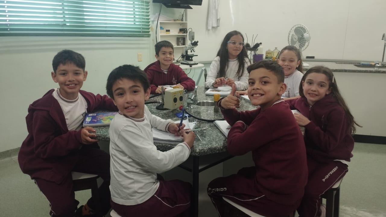 O 3º ano visitou o laboratório de ciências para a experiência de ver o açúcar vibrar com o som produzido com a voz. O efeito da vibração sonora ocorre próximo a um som muito intenso.