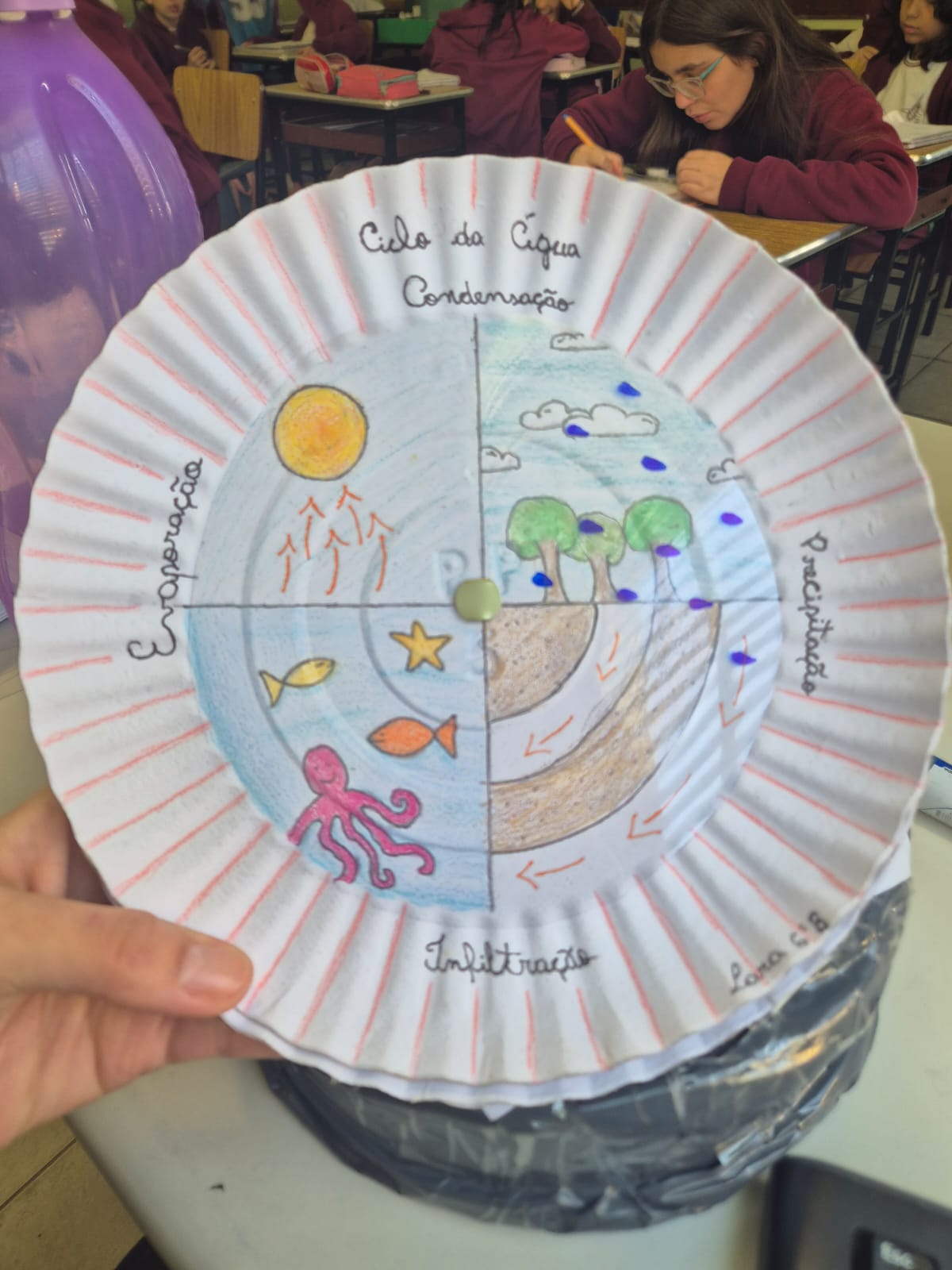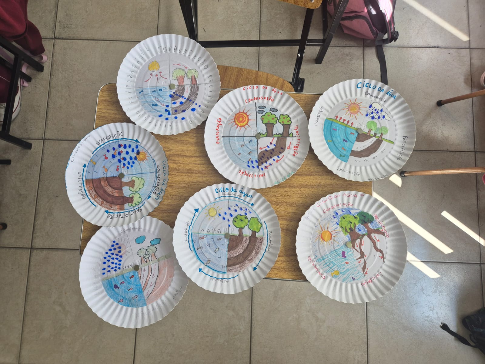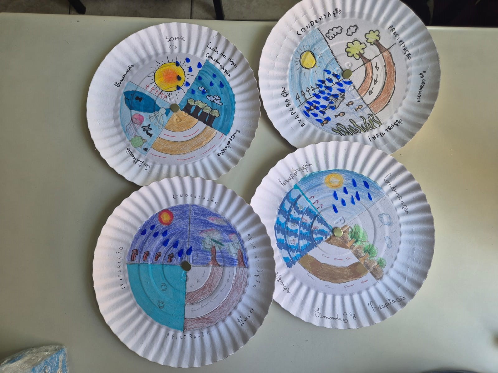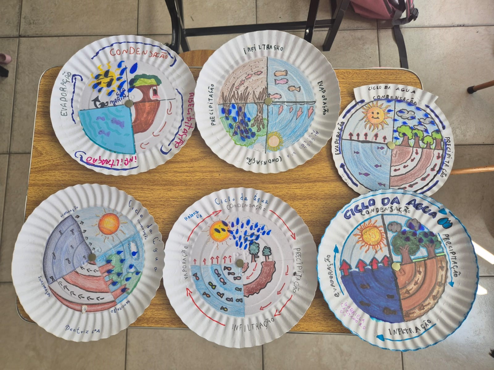A proposta foi mostrar como a água está sempre em movimento na natureza, passando por diferentes fases — evaporação, condensação, precipitação e infiltração — e ocupando lugares variados ao longo desse processo, como nuvens, rios, solos e até seres vivos.