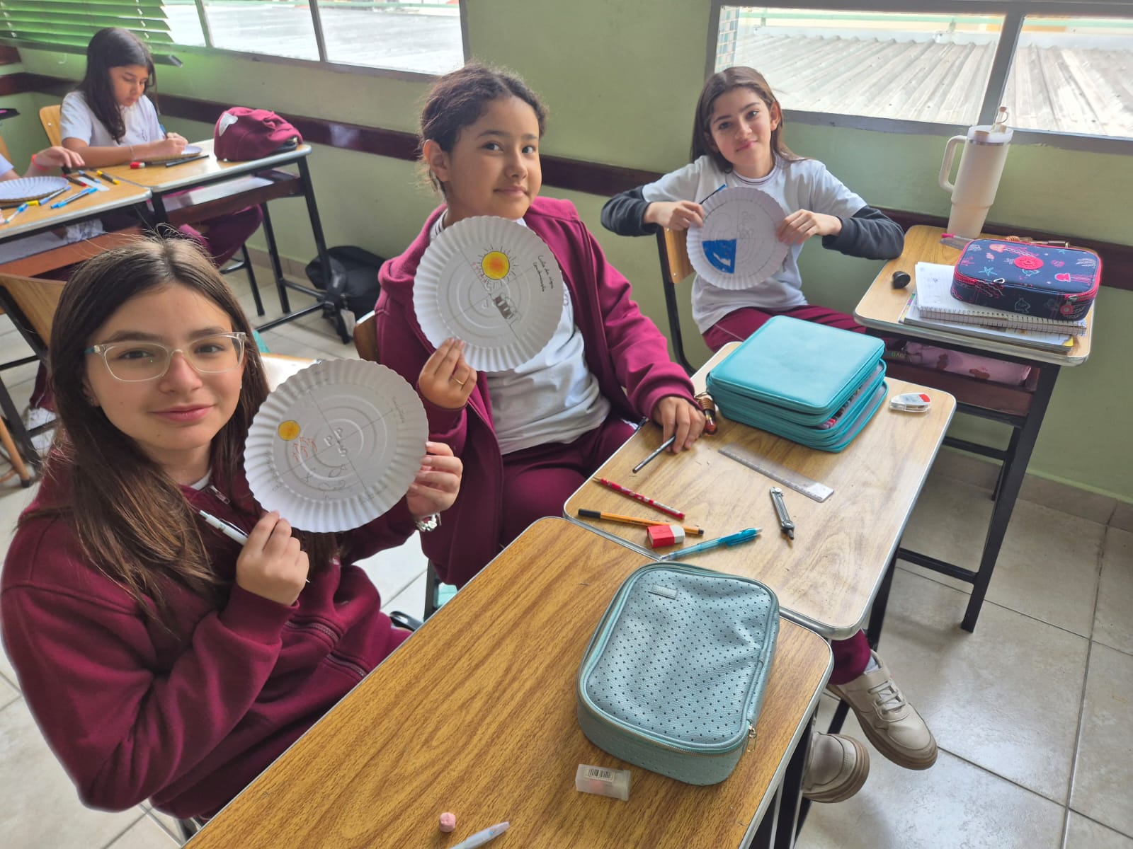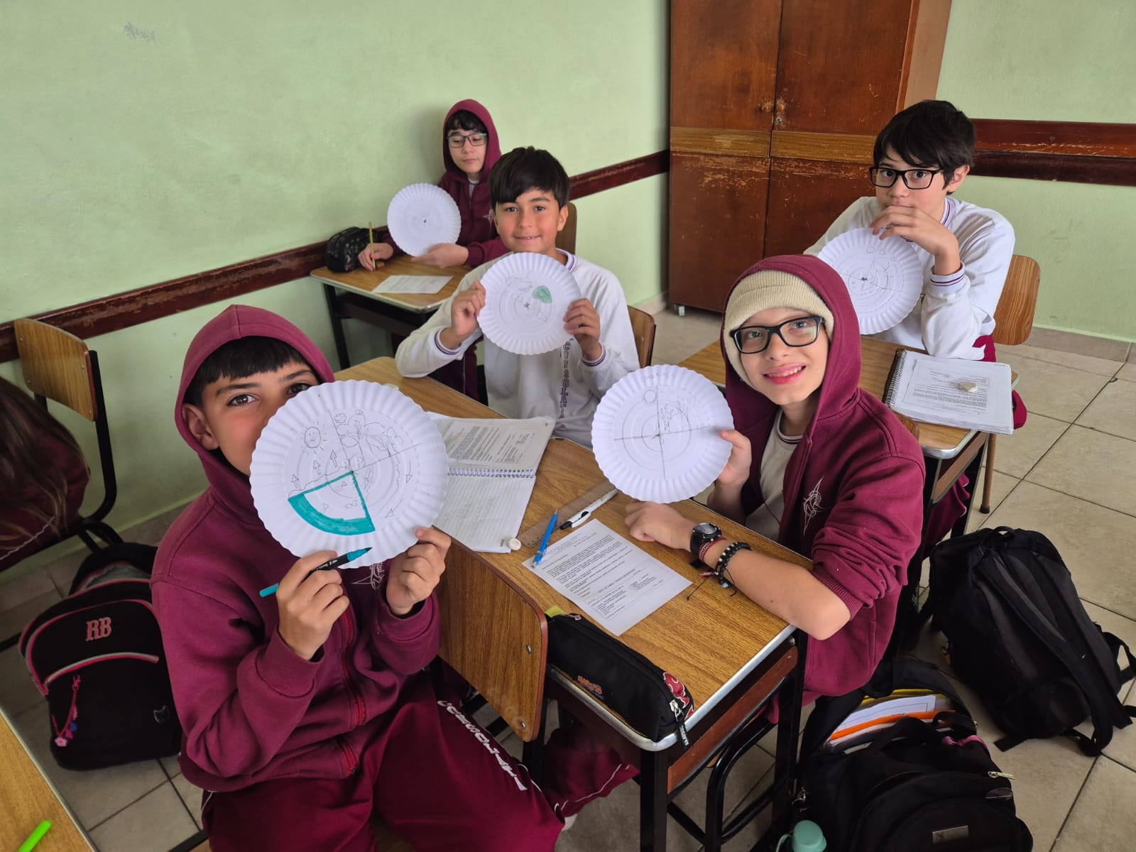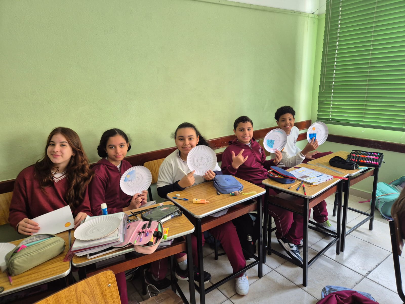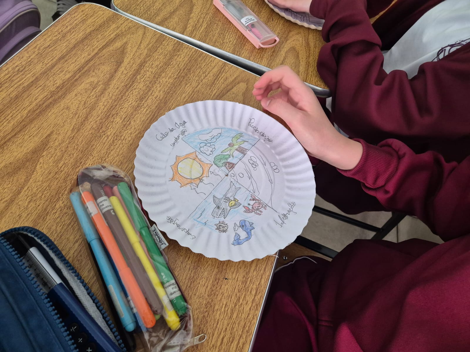 Para visualizar esse ciclo, os estudantes utilizaram um prato com água e uma lâmina de acetato que se movia. Esse experimento simples permitiu observar como as "gotas" se deslocam e mudam de lugar, simulando os caminhos que a água percorre na natureza. O movimento do acetato representava as transformações e os deslocamentos da água ao longo do ciclo. A proposta reforçou o entendimento dos conteúdos científicos e mostrou que aprender pode ser também um momento de descobertas e diversão.