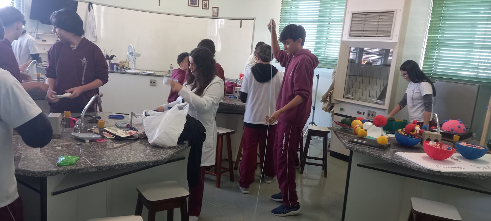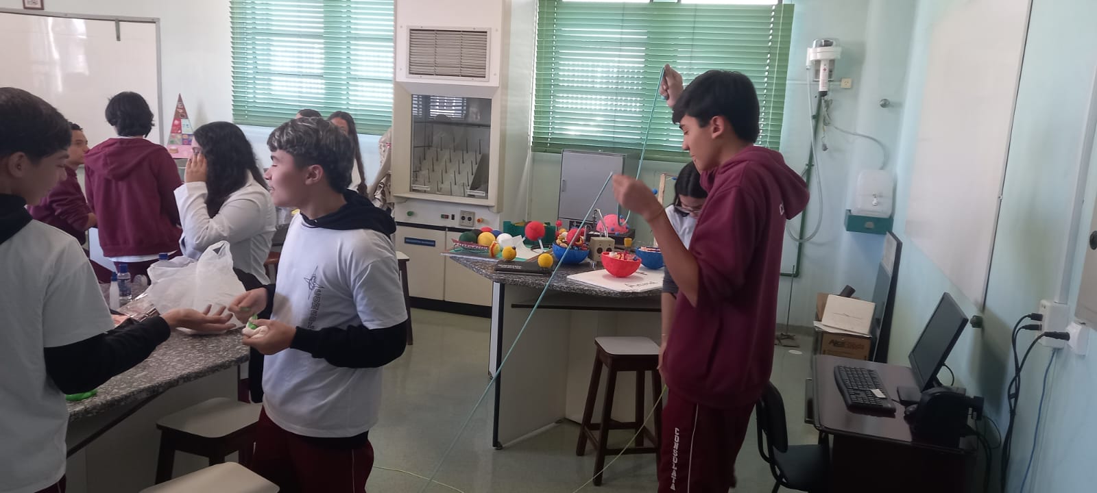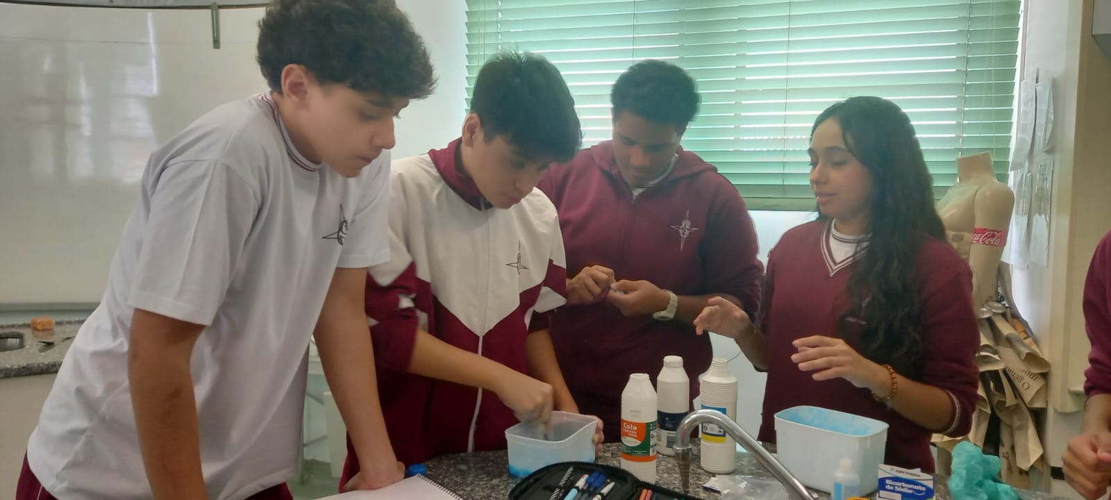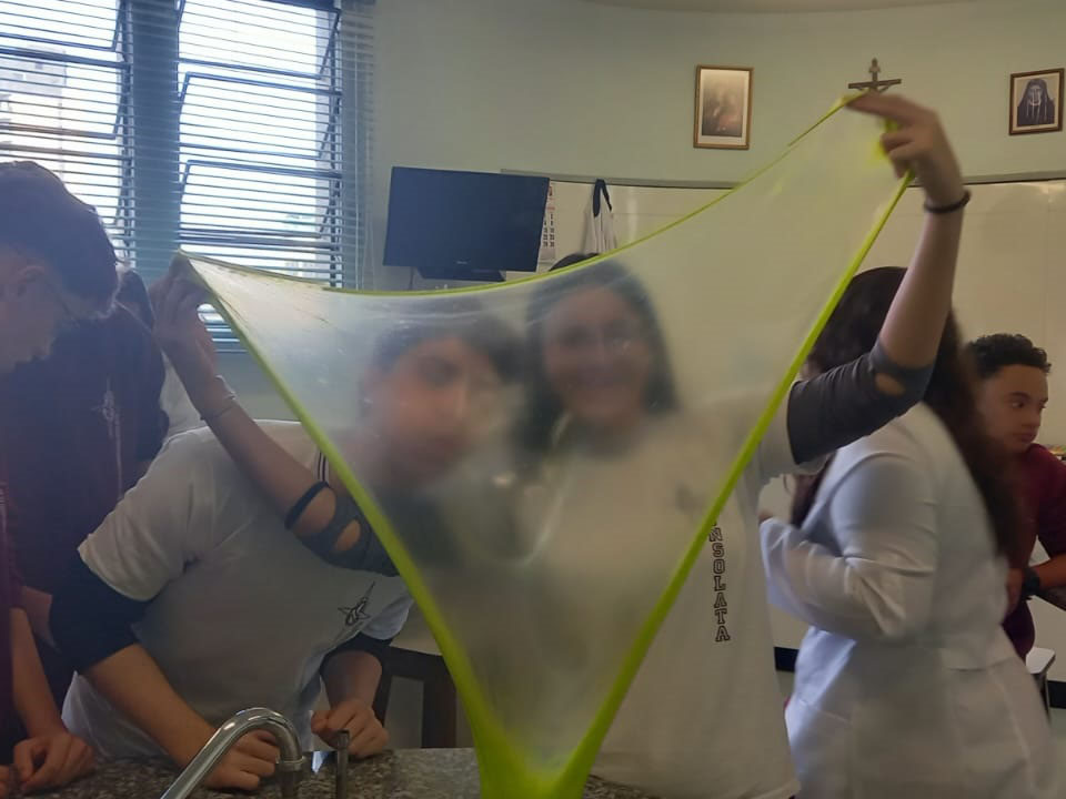 A atividade foi marcada por muita criatividade, explorando de forma prática como acontecem as reações químicas, sempre estimulando o trabalho em equipe e a socialização entre os colegas.
