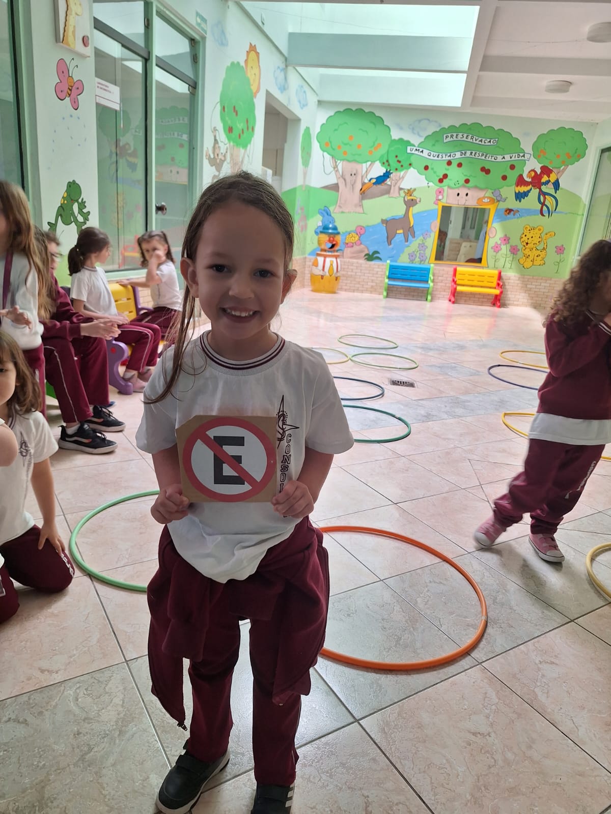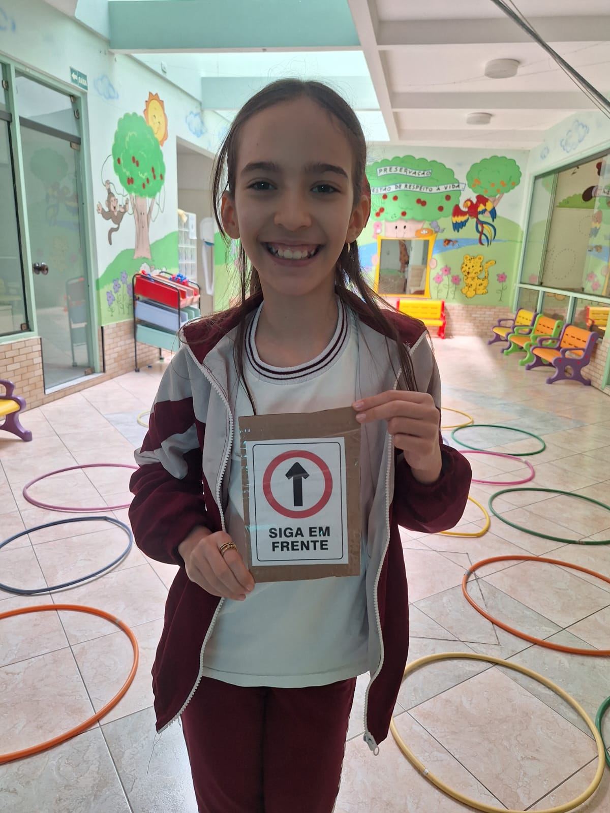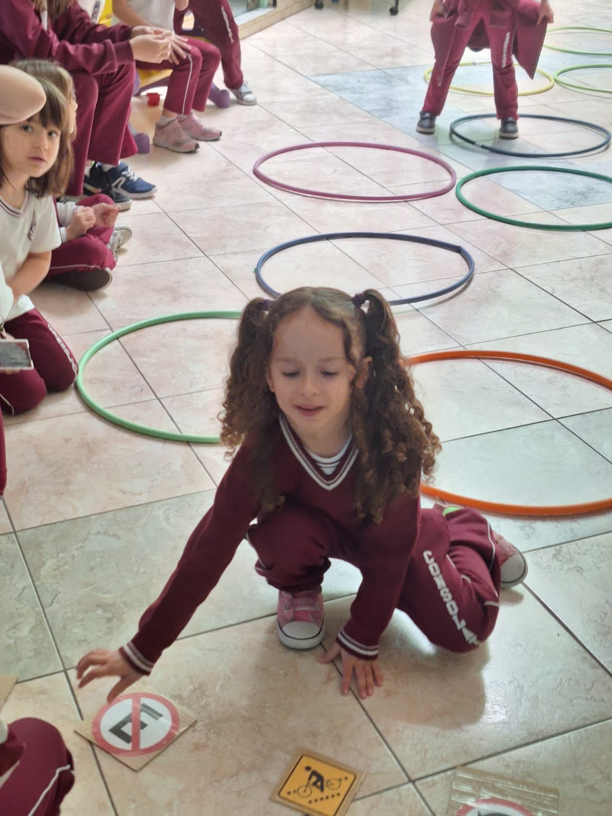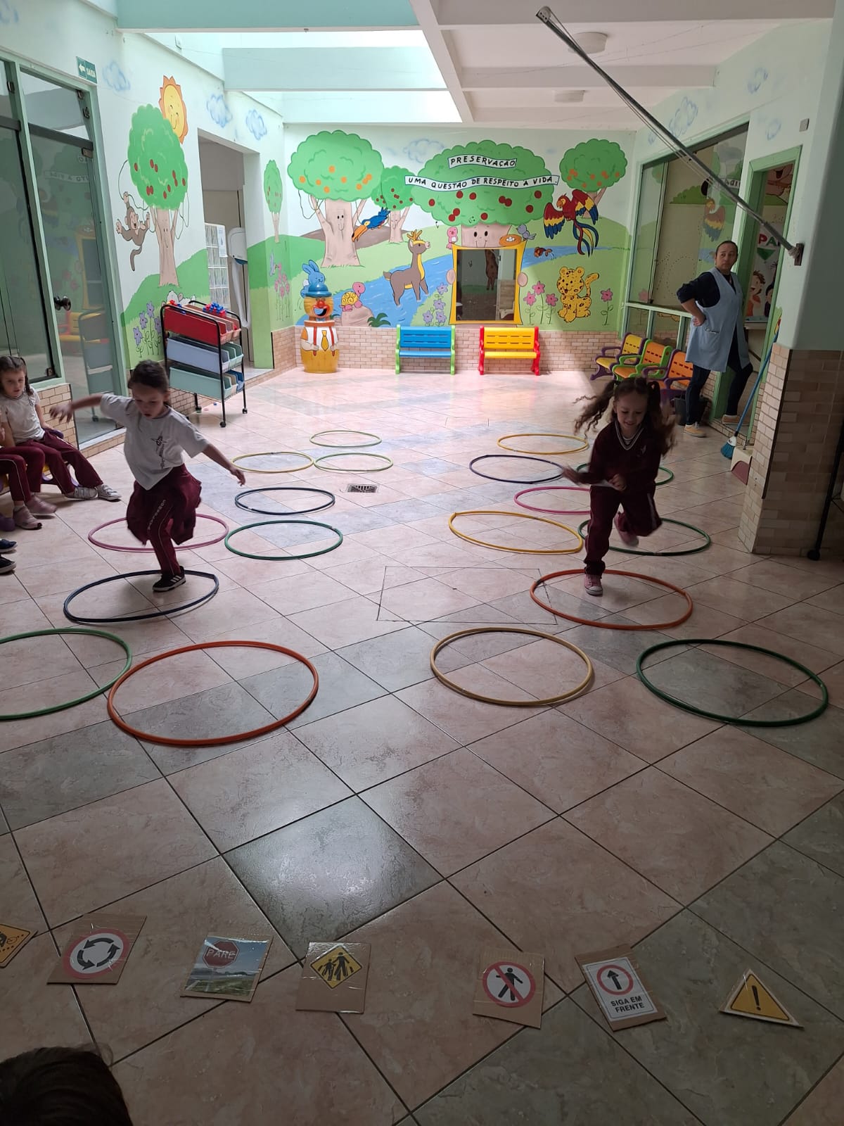 No Período Adicional, nossos alunos participaram de uma atividade especial sobre educação no trânsito, utilizando bambolês e sinalizações para simular ruas, faixas de pedestres e semáforos.