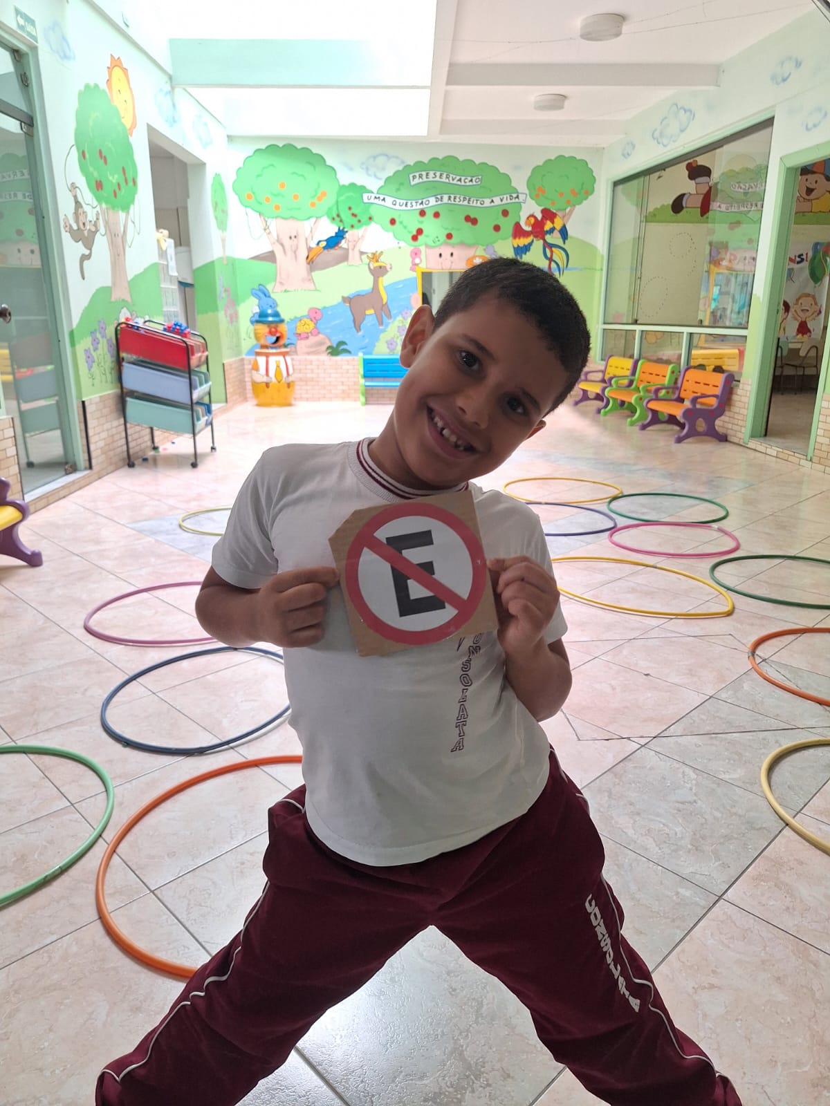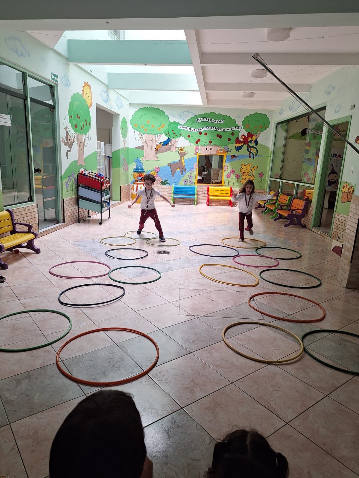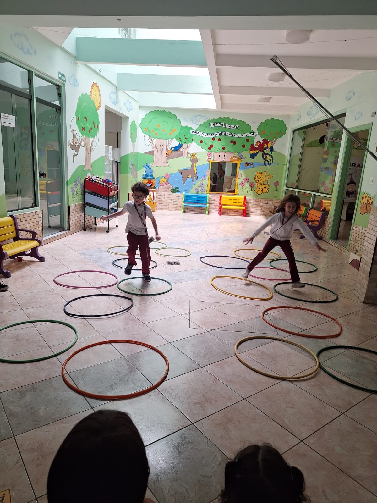 No Período Adicional, nossos alunos participaram de uma atividade especial sobre educação no trânsito, utilizando bambolês e sinalizações para simular ruas, faixas de pedestres e semáforos.