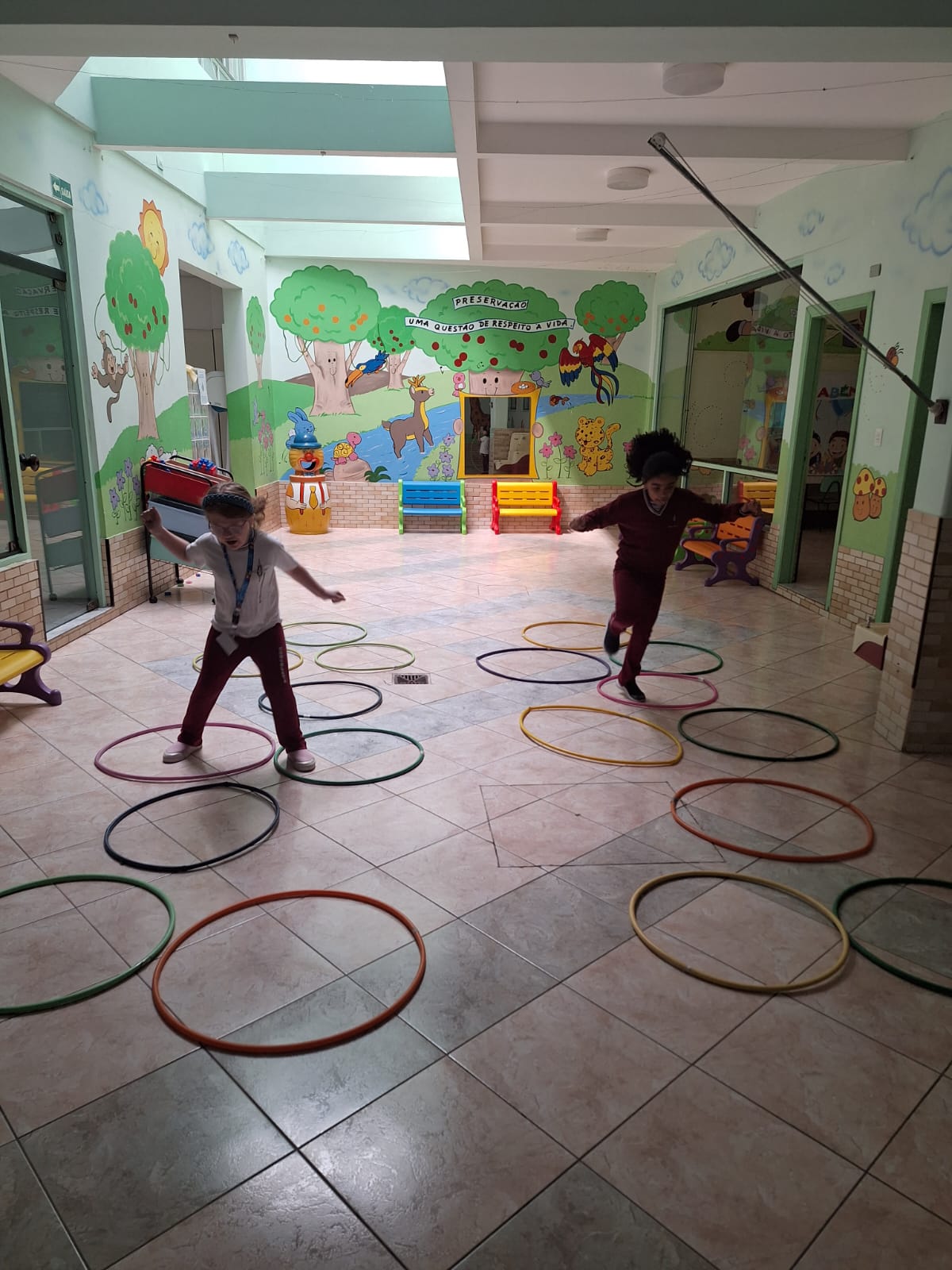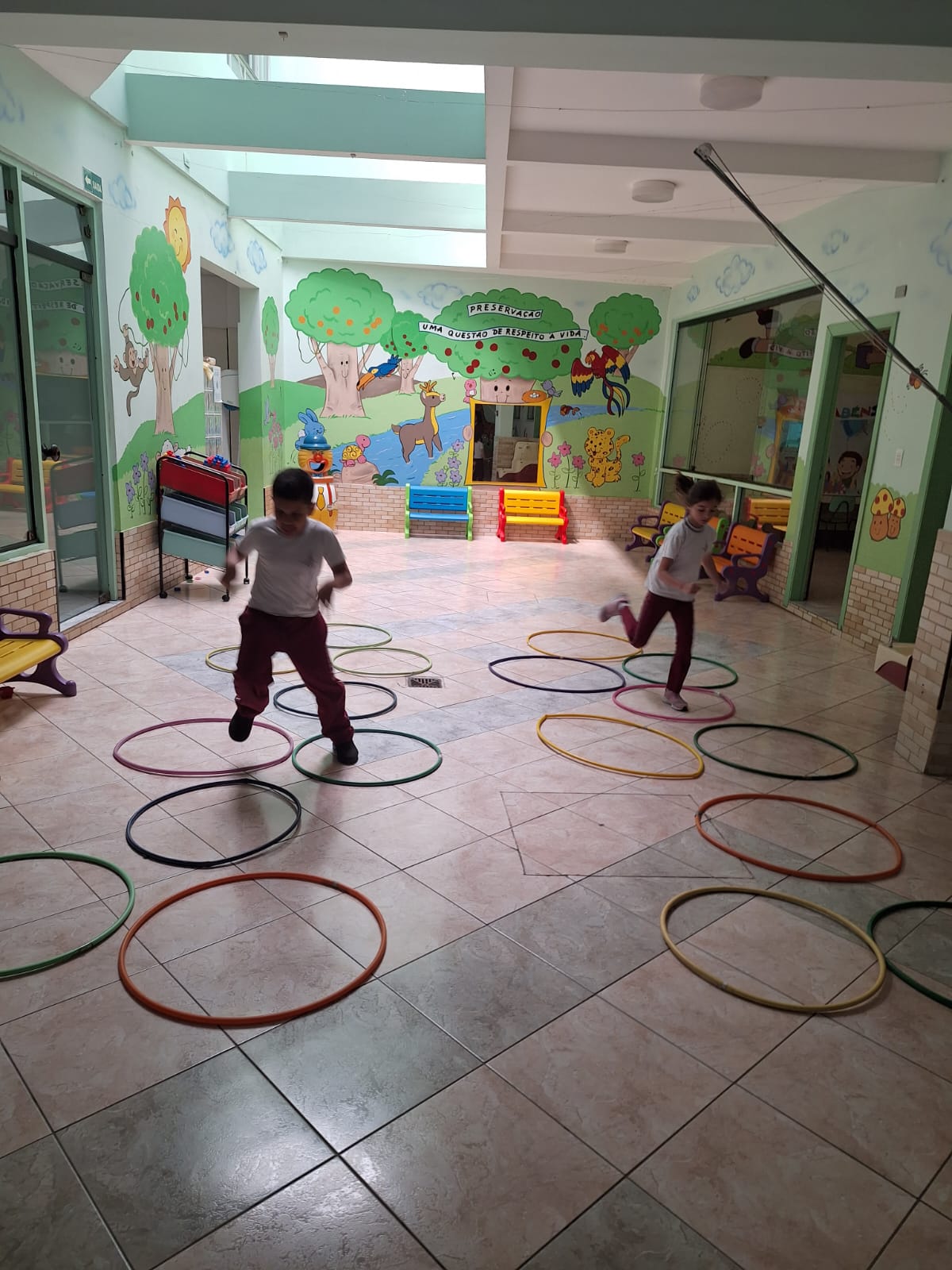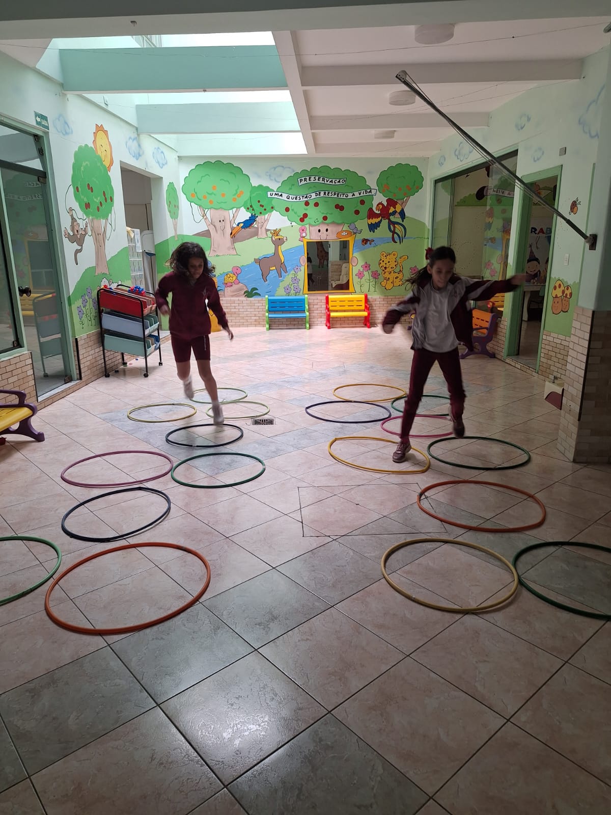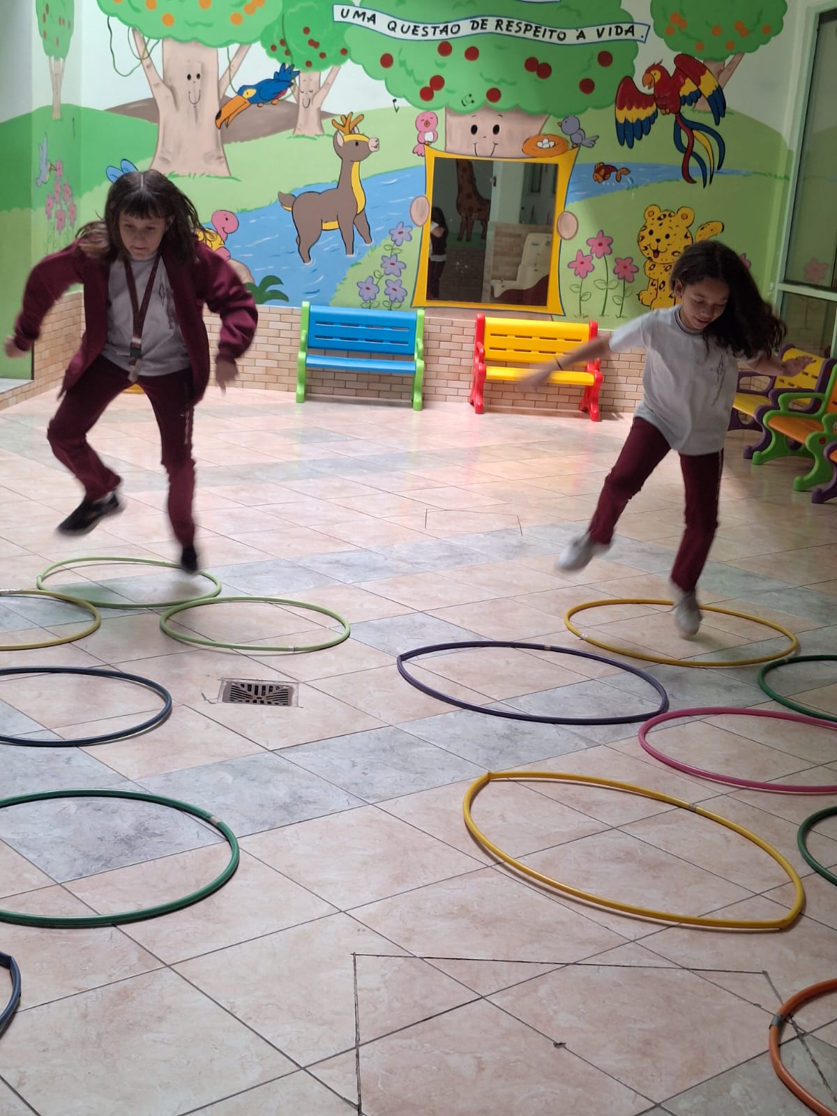 No Período Adicional, nossos alunos participaram de uma atividade especial sobre educação no trânsito, utilizando bambolês e sinalizações para simular ruas, faixas de pedestres e semáforos.