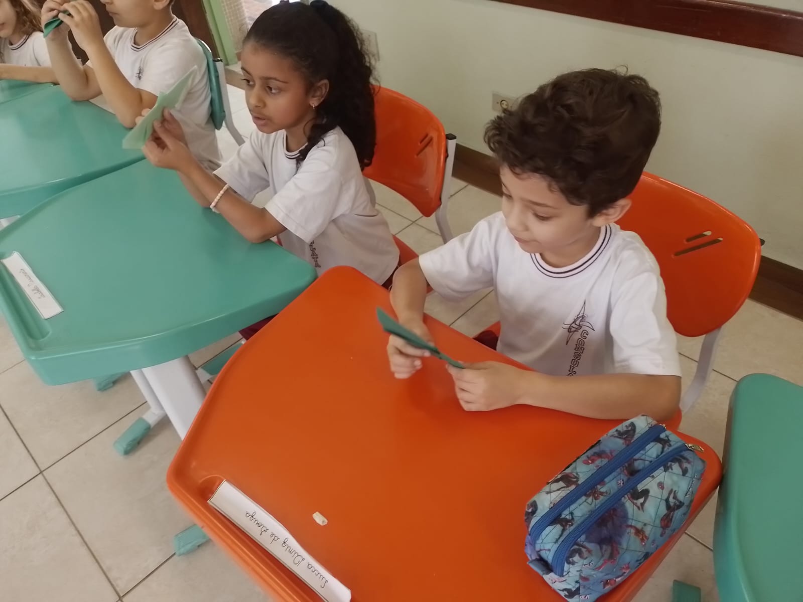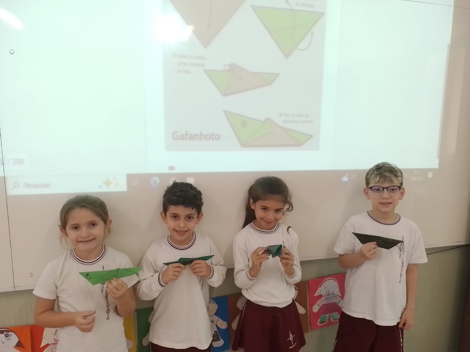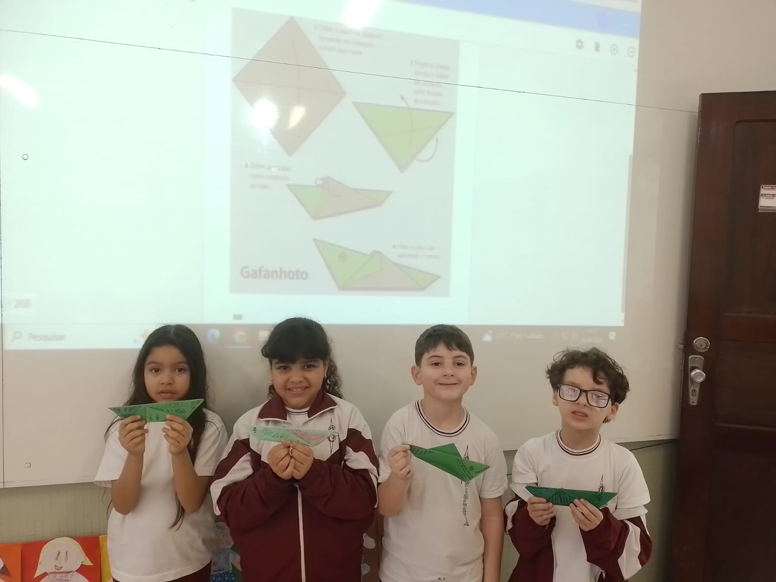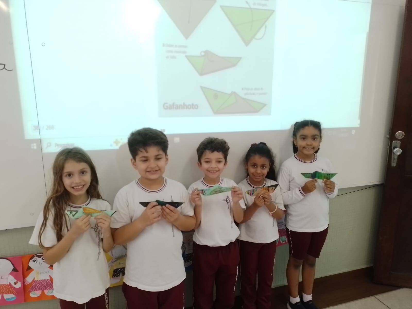 Após a análise e interpretação da história, confeccionaram a dobradura do personagem principal: o gafanhoto.