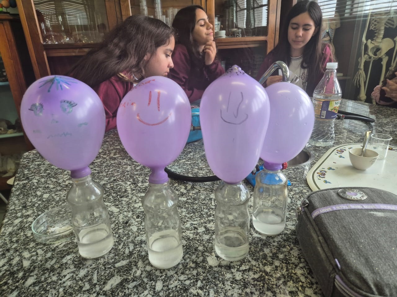Durante a atividade, os estudantes realizaram dois experimentos simples, mas muito divertidos e educativos. No primeiro, utilizaram bicarbonato de sódio e vinagre, dois materiais comuns do dia a dia, para observar uma reação química em ação. Ao serem misturados, o bicarbonato (uma base) e o vinagre (um ácido) reagem formando dióxido de carbono (um gás). Para visualizar essa liberação de gás, a mistura foi colocada dentro de uma garrafa com uma bexiga presa na boca. Conforme o gás foi se formando, ele encheu a bexiga, deixando todos impressionados com o resultado!