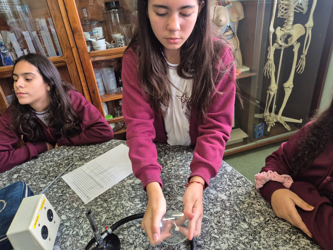 No segundo experimento, os alunos observaram a explosão de uma biribinha, um pequeno artefato que contém pólvora. Ao ser pressionada entre dois vidros de relógio (vidraria específica de laboratório) ele estoura, liberando som e calor, o que também é uma reação química: a combustão da pólvora. Este momento ajudou a ilustrar como algumas reações liberam energia de forma rápida e intensa, despertando a curiosidade dos alunos sobre o funcionamento de explosivos e fogos de artifício.