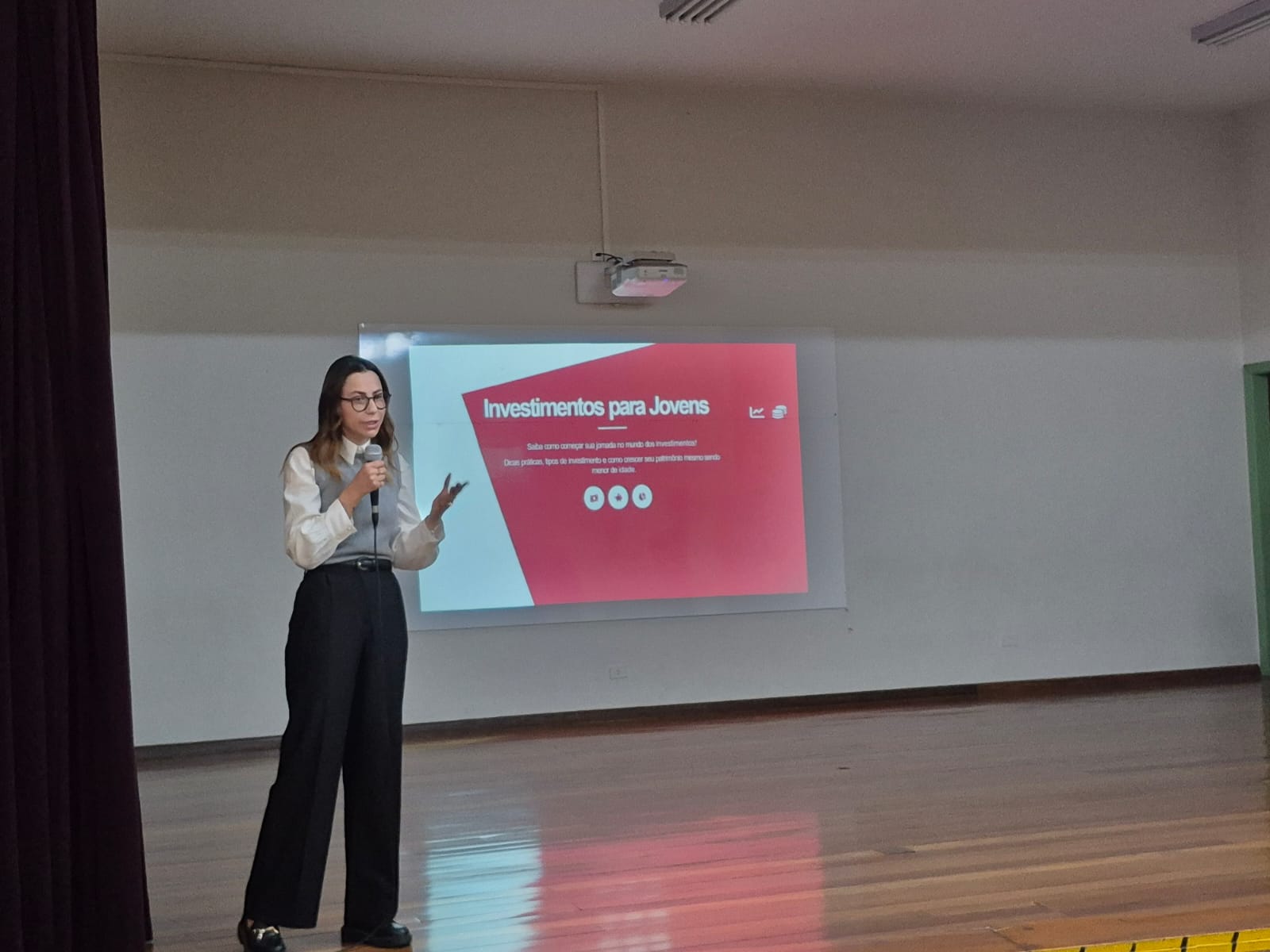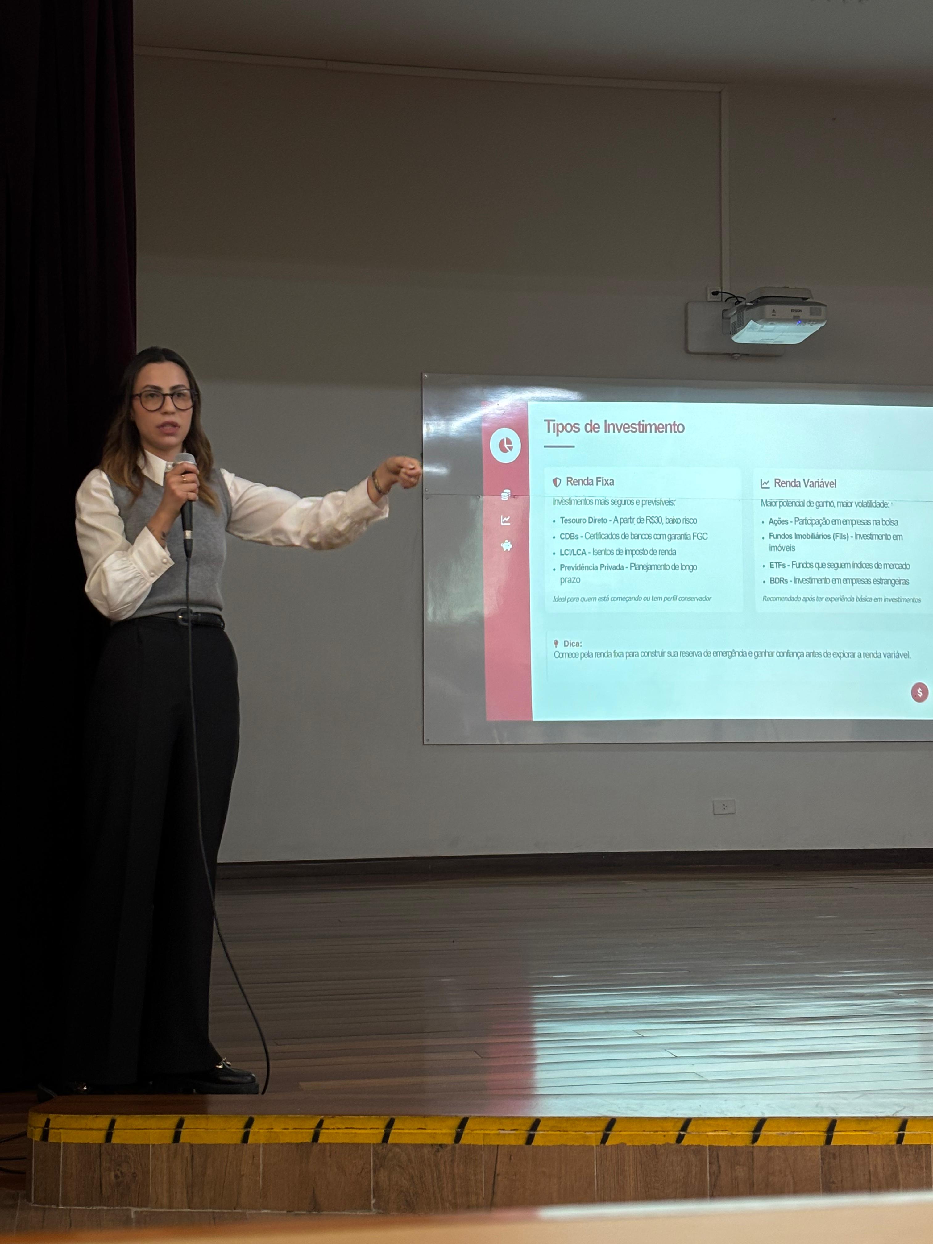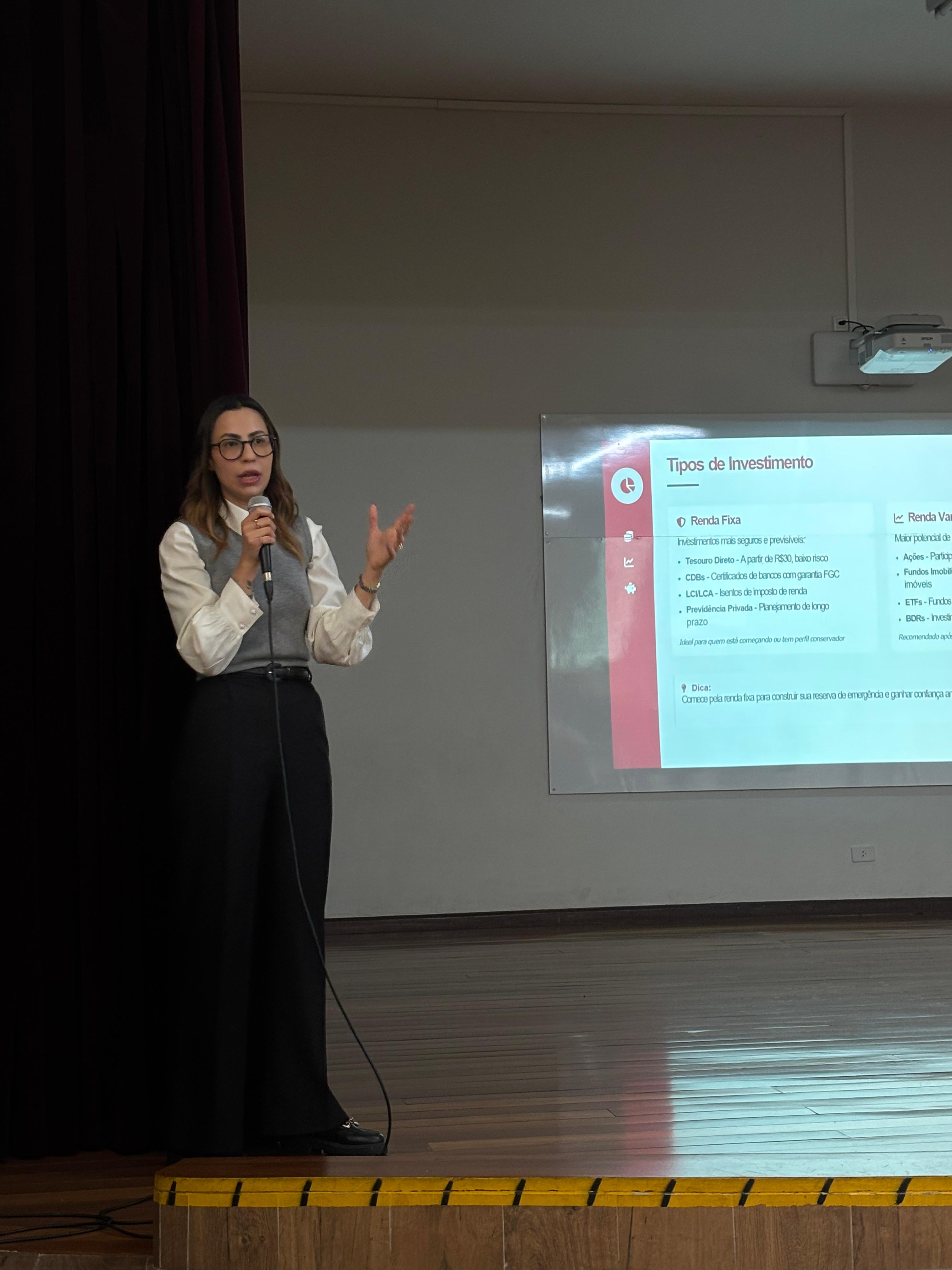 Com muito entusiasmo, ela compartilhou sua trajetória profissional, destacou a importância dos estudos e mostrou que é possível começar a investir desde cedo, construindo responsabilidade e visão de futuro.