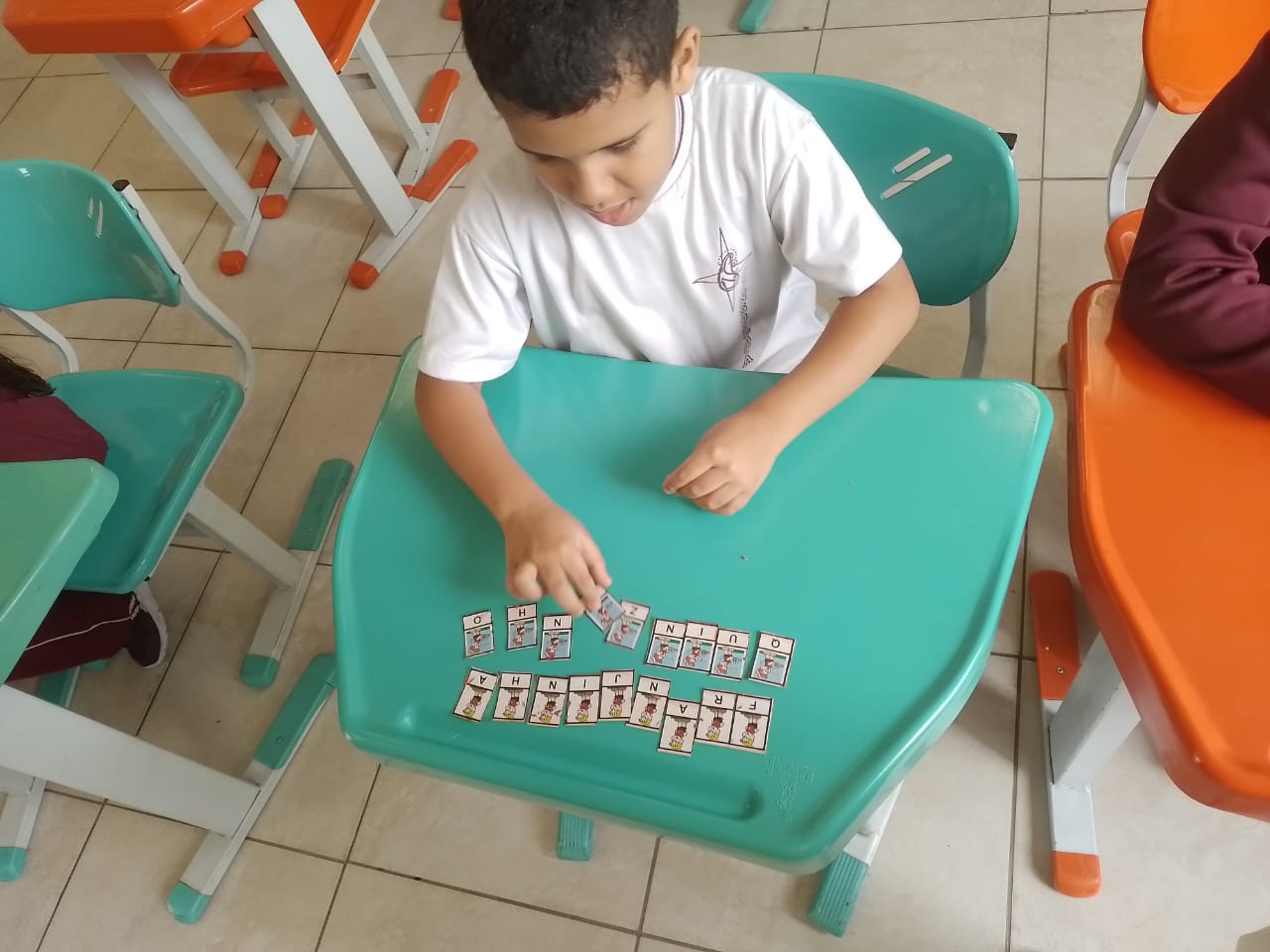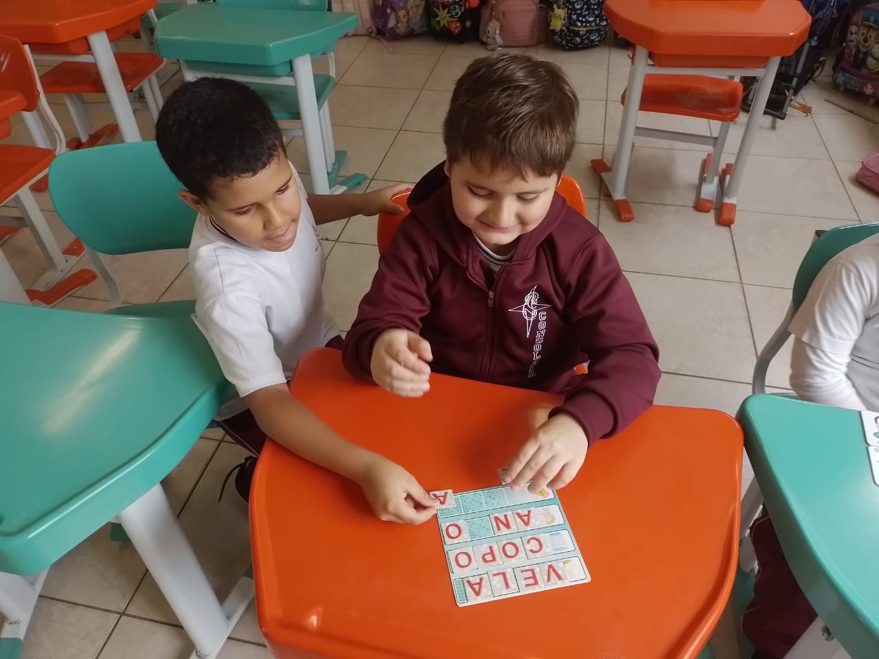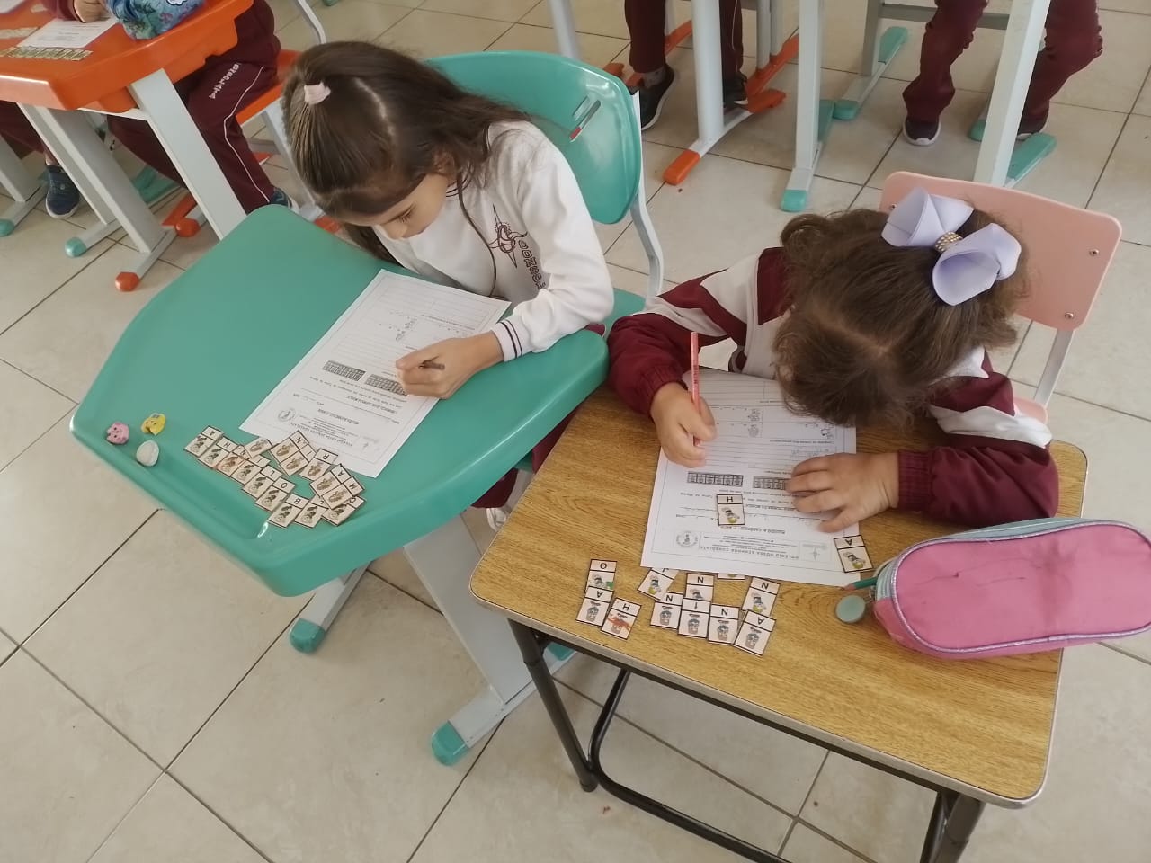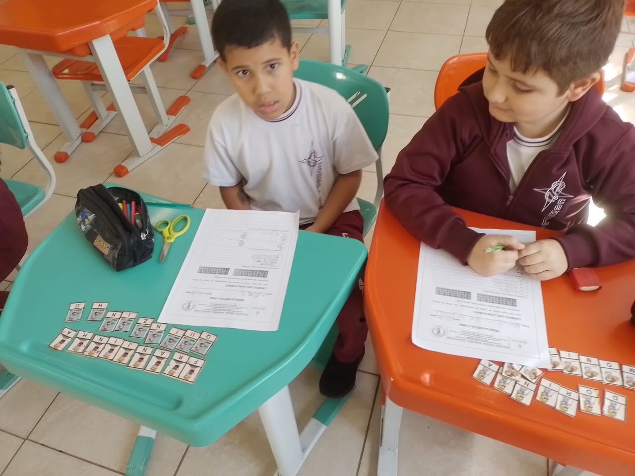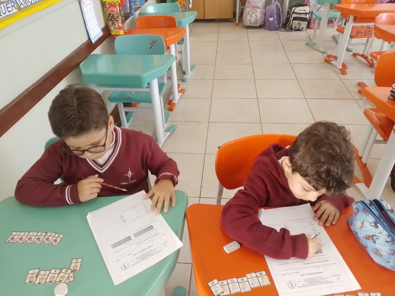 Os alunos dos 1º anos estão participando da atividade nomeada "Rodízio alfabético" que auxilia no processo de alfabetização, onde eles são organizados em grupos baseados em seus níveis de aprendizagem e participam de atividades de leitura e escrita em esquema de rodízio com as professoras da sala.