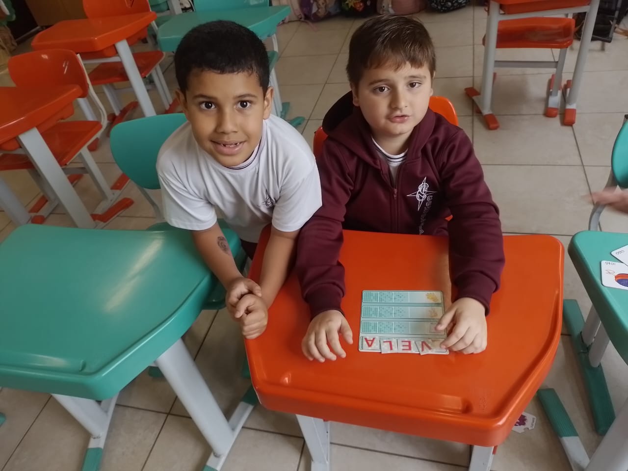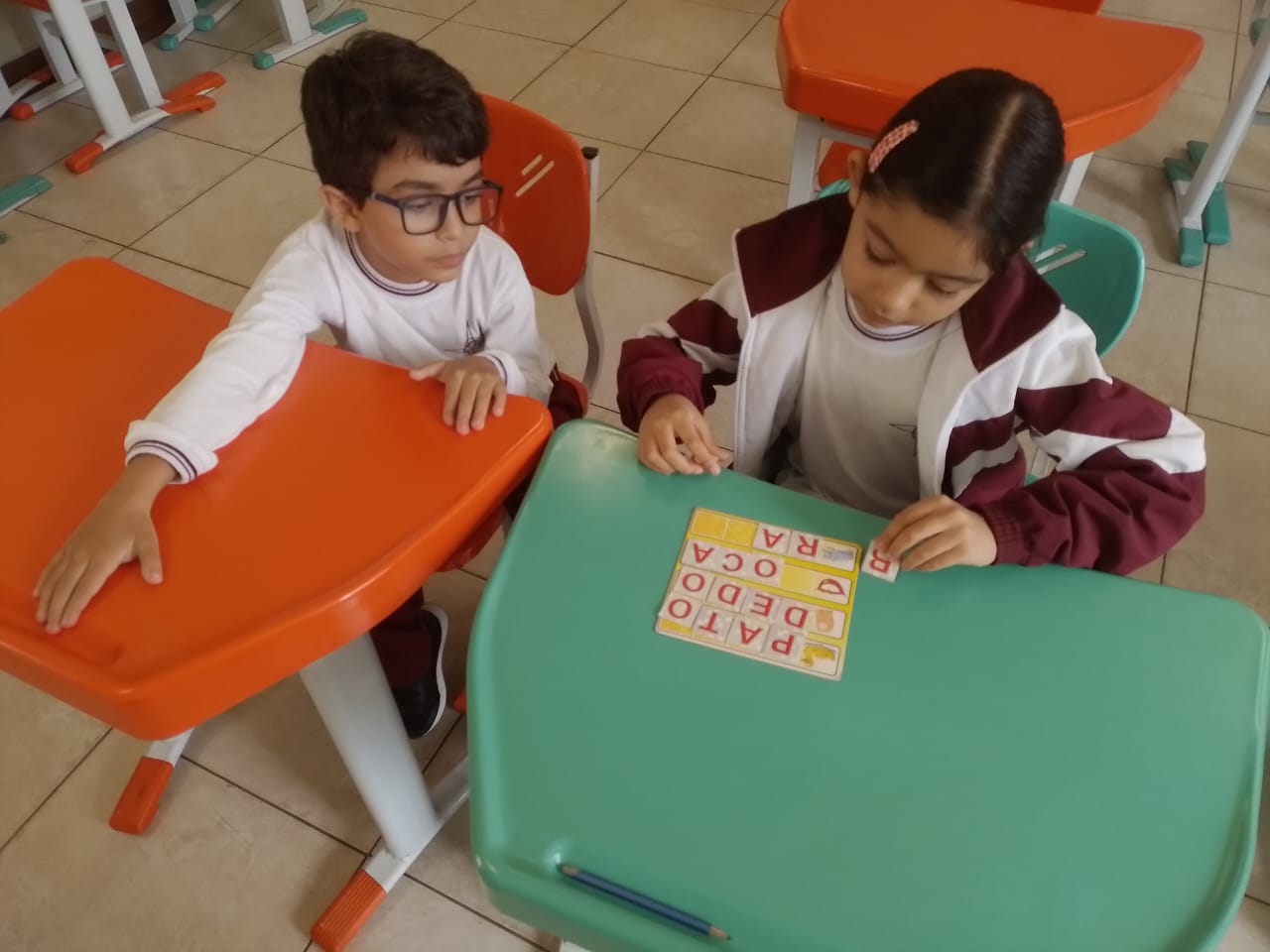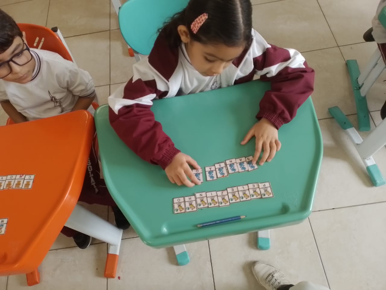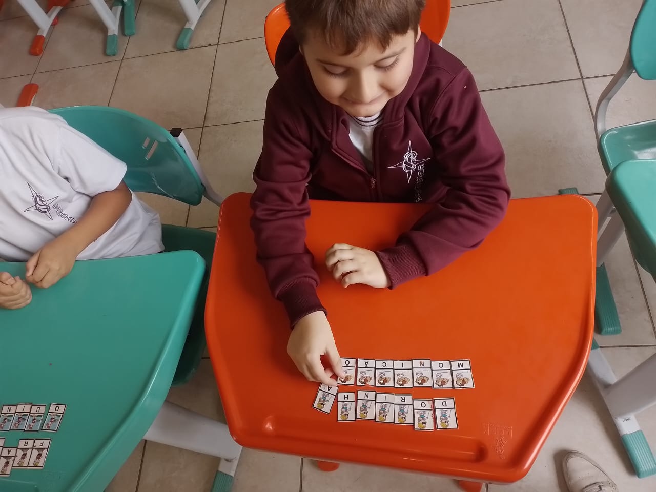 Os alunos dos 1º anos estão participando da atividade nomeada "Rodízio alfabético" que auxilia no processo de alfabetização, onde eles são organizados em grupos baseados em seus níveis de aprendizagem e participam de atividades de leitura e escrita em esquema de rodízio com as professoras da sala.