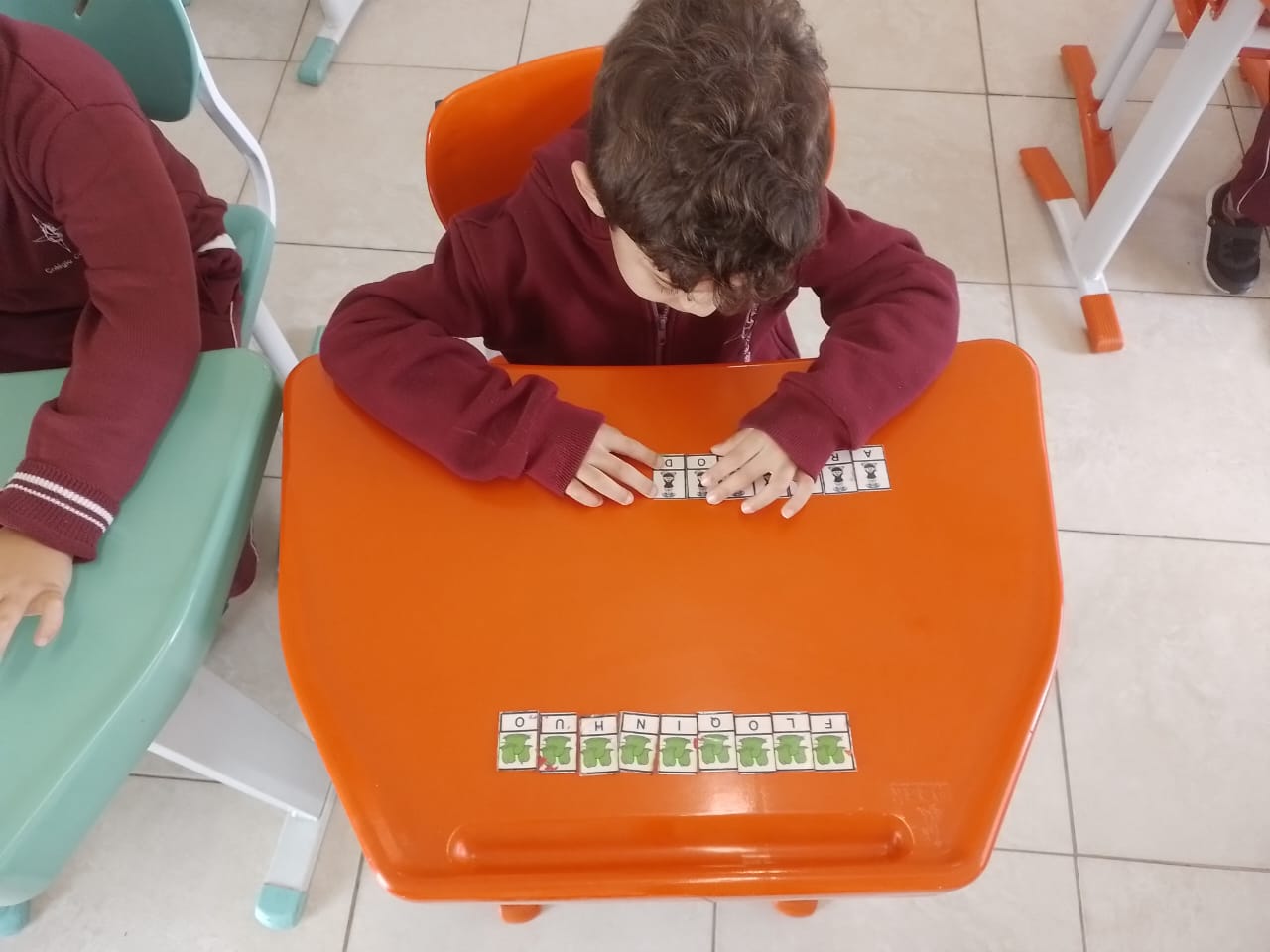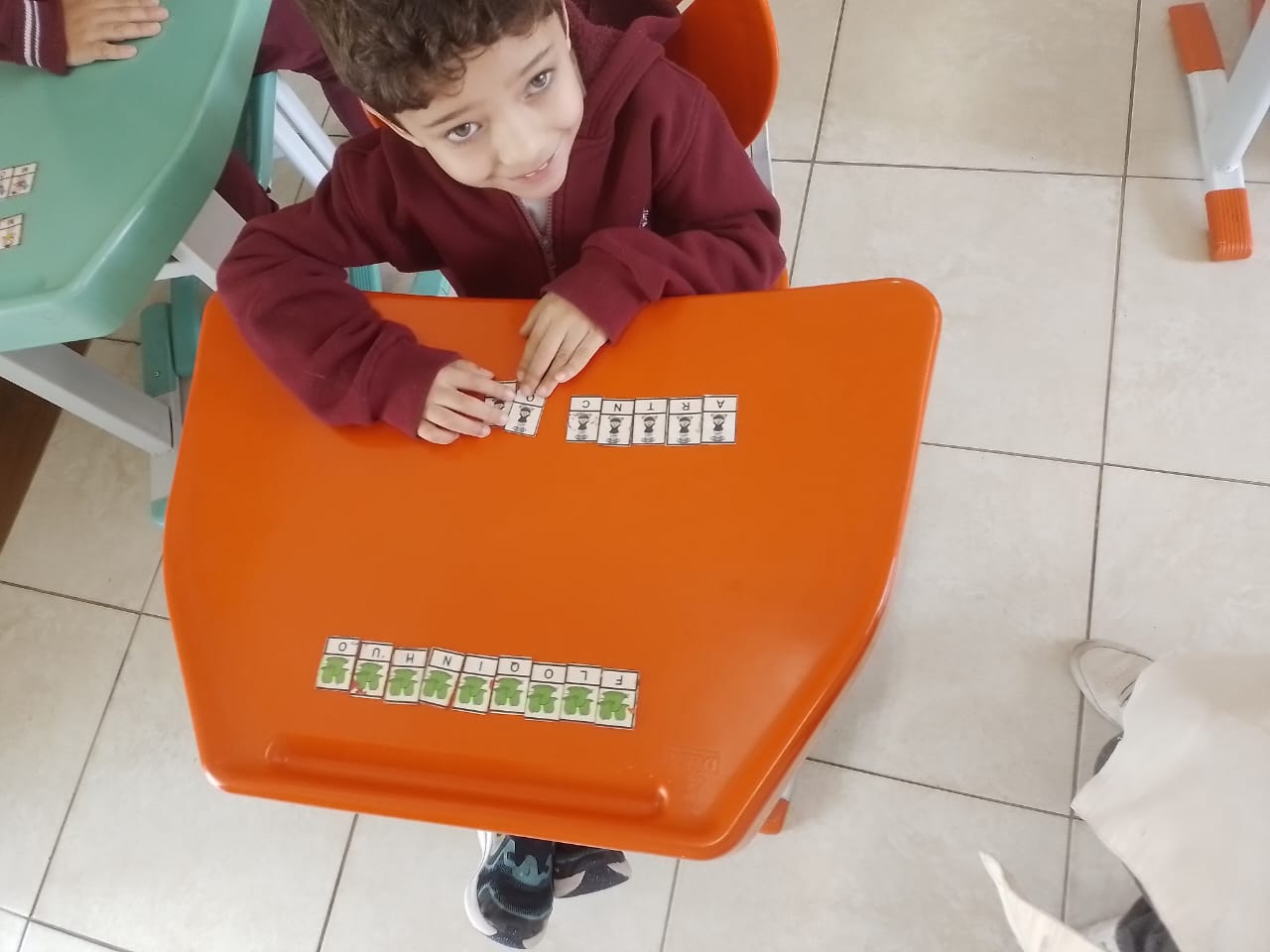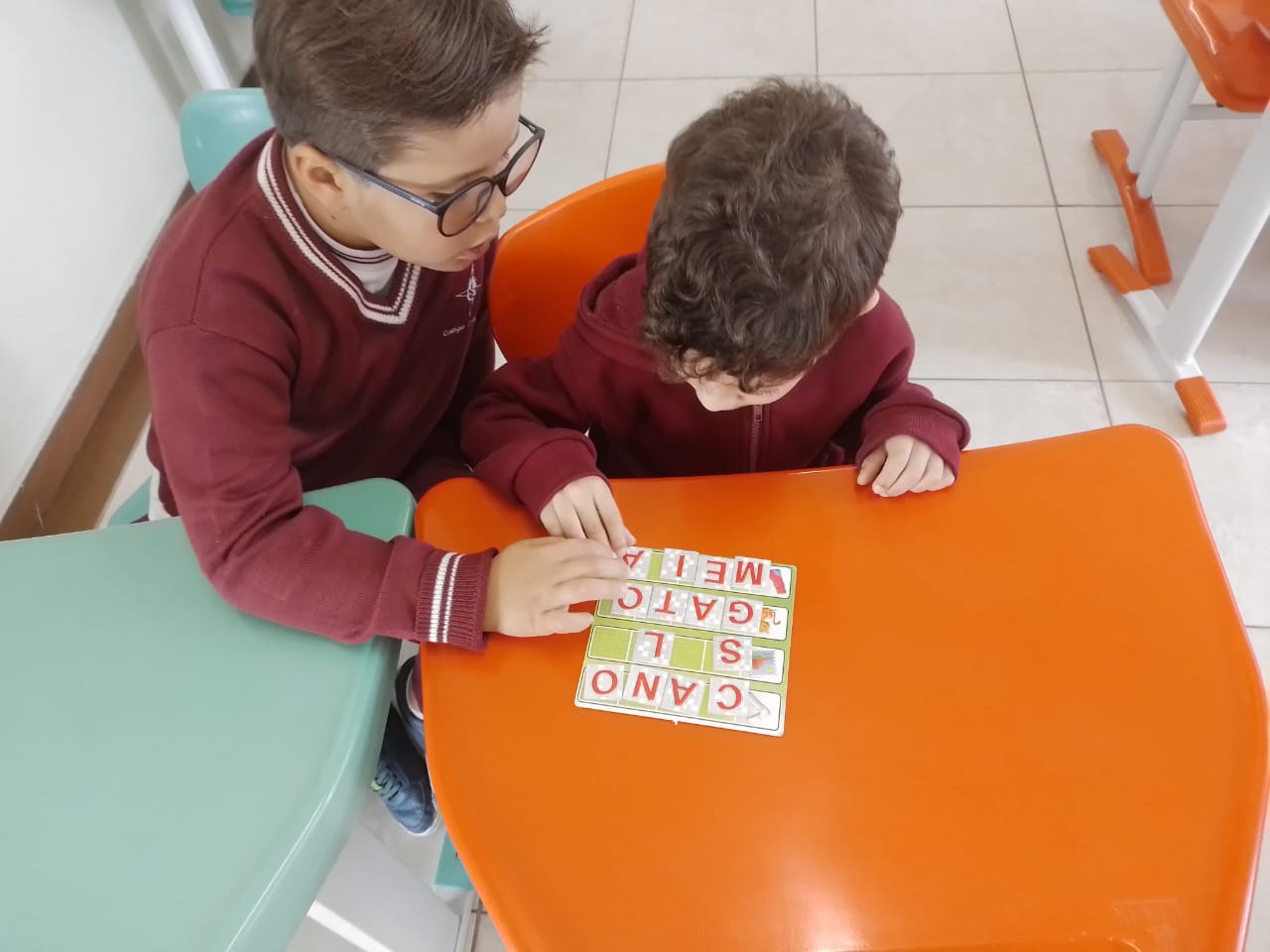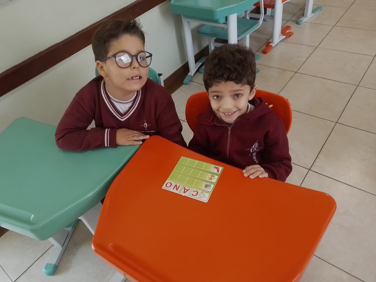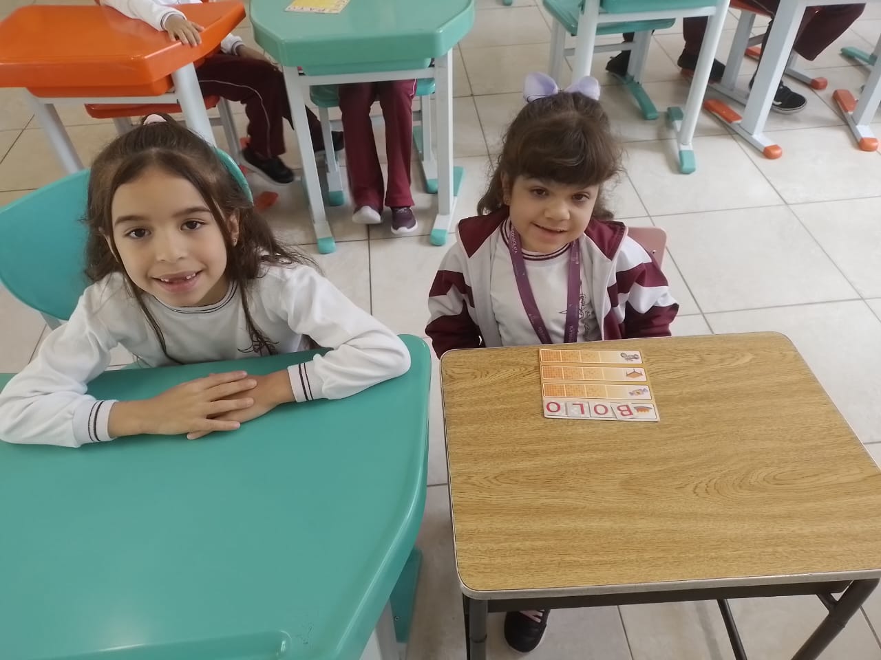 Os alunos dos 1º anos estão participando da atividade nomeada "Rodízio alfabético" que auxilia no processo de alfabetização, onde eles são organizados em grupos baseados em seus níveis de aprendizagem e participam de atividades de leitura e escrita em esquema de rodízio com as professoras da sala.