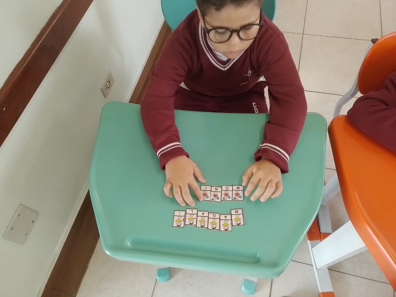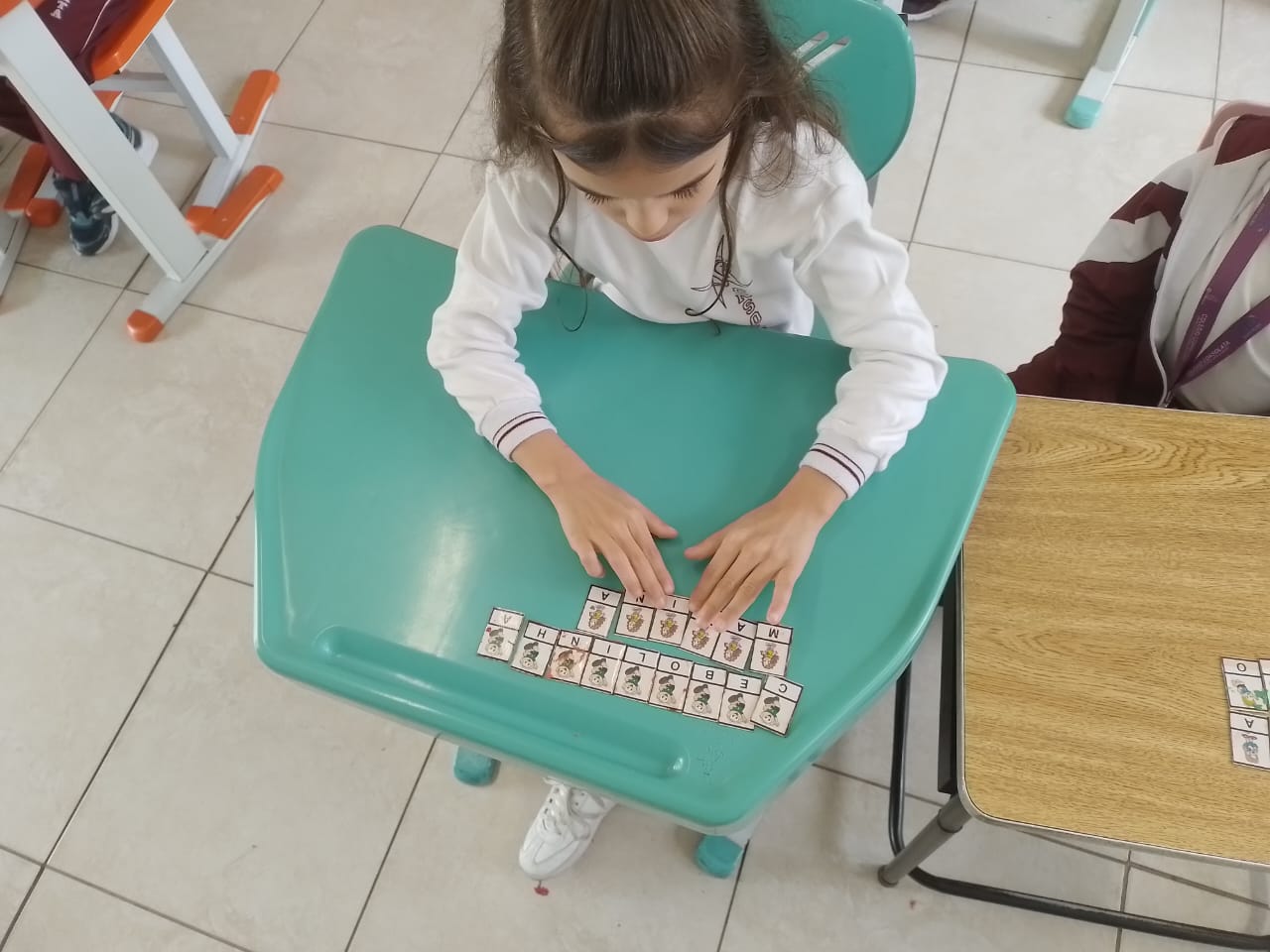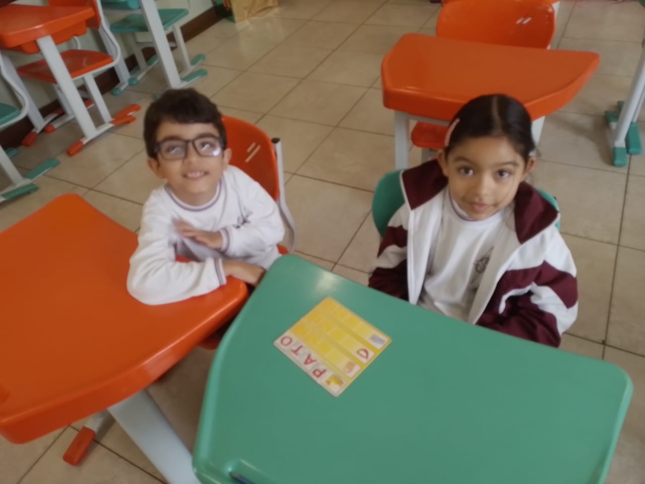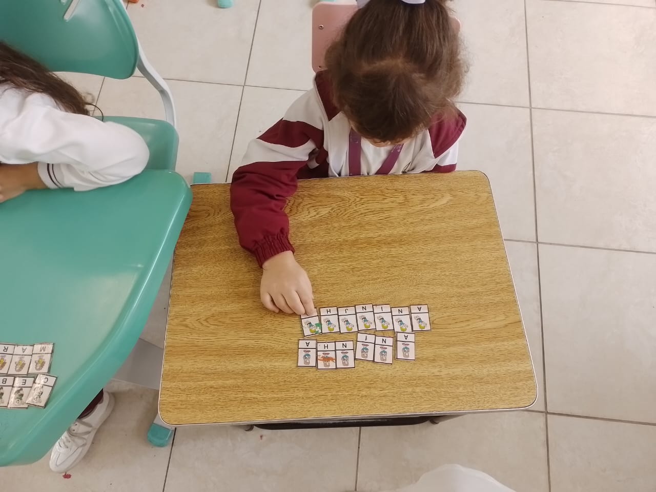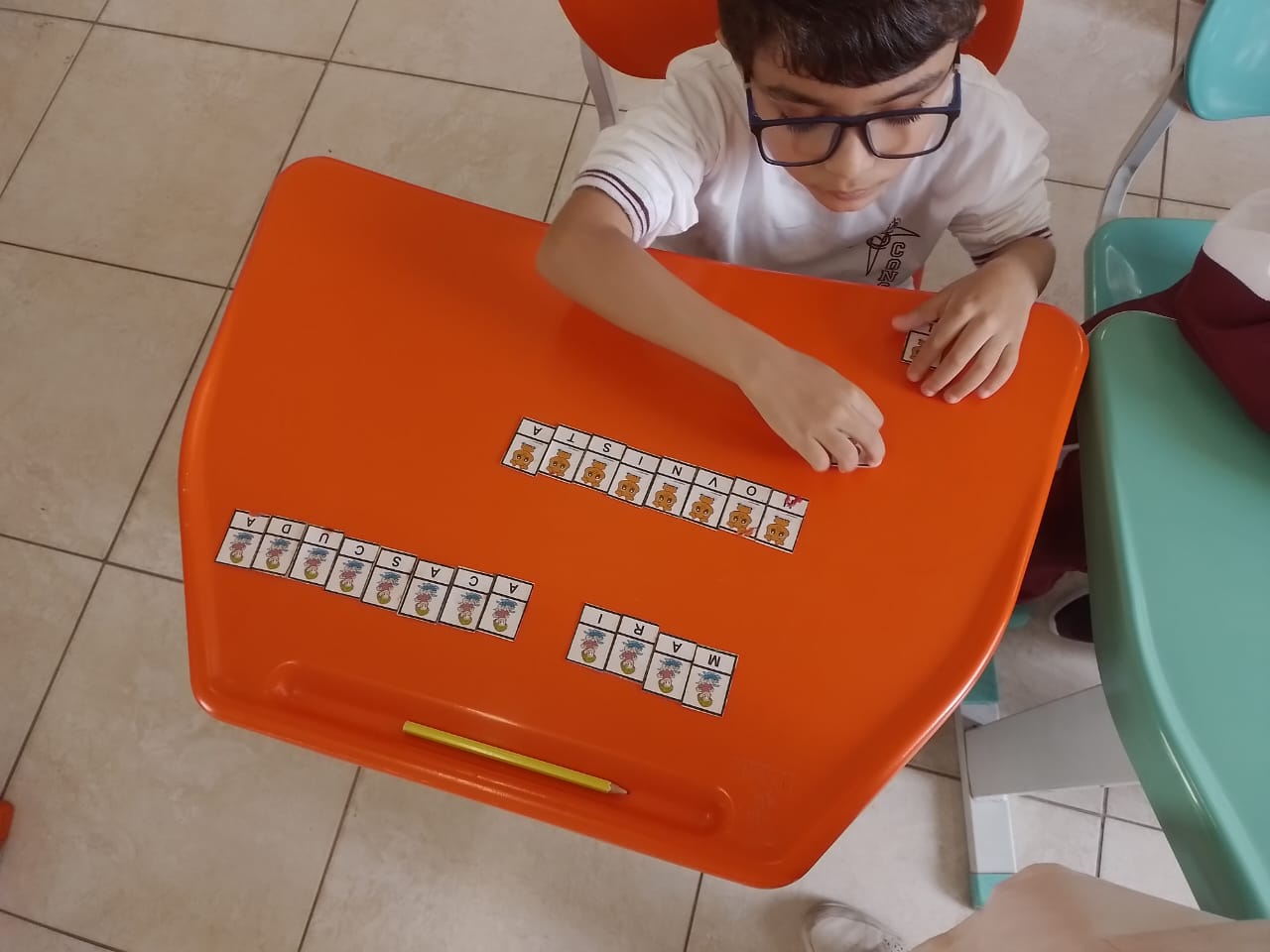 Os alunos dos 1º anos estão participando da atividade nomeada "Rodízio alfabético" que auxilia no processo de alfabetização, onde eles são organizados em grupos baseados em seus níveis de aprendizagem e participam de atividades de leitura e escrita em esquema de rodízio com as professoras da sala.
