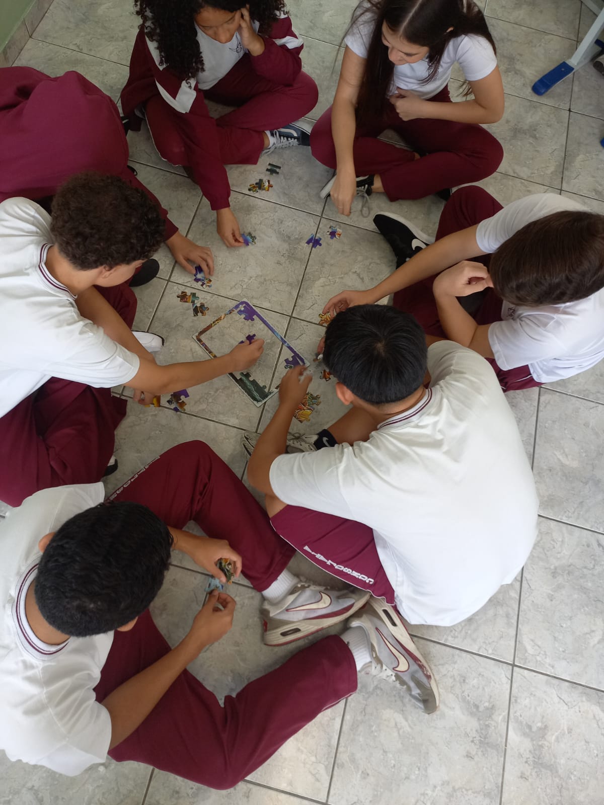 Os alunos participaram de uma dinâmica de montagem de quebra-cabeça, realizada de forma colaborativa, com o objetivo de estimular a cooperação, a comunicação e o respeito entre os colegas.