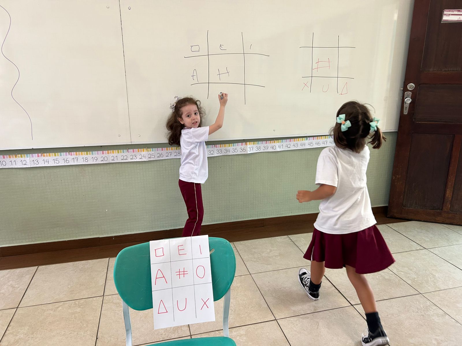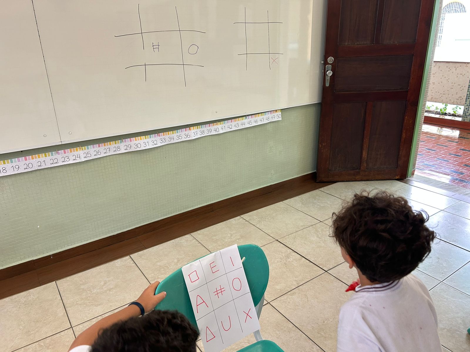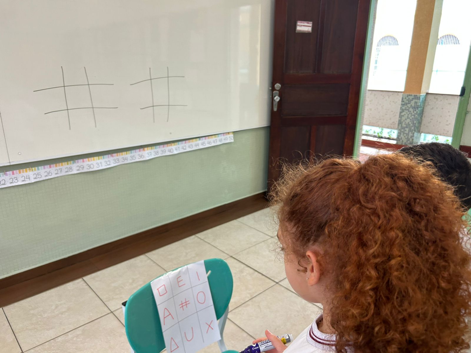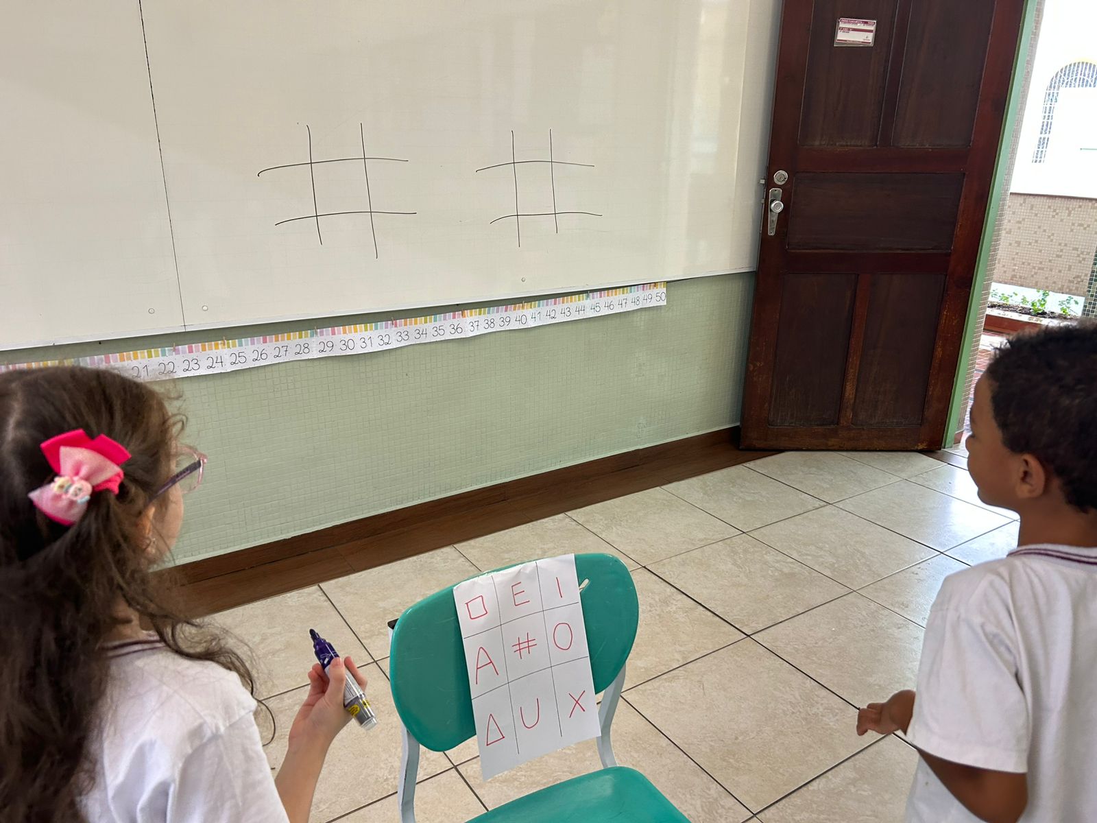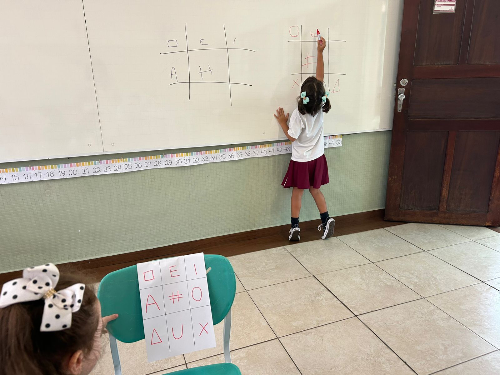Com o jogo de memorização, os alunos do 1º ano A desenvolveram a atenção, o reconhecimento de letras e símbolos, além do raciocínio lógico, de um jeito leve, divertido e cheio de descobertas. A atividade estimulou a concentração, a interação entre os colegas e o prazer em aprender brincando, tornando o processo de aprendizagem ainda mais significativo.