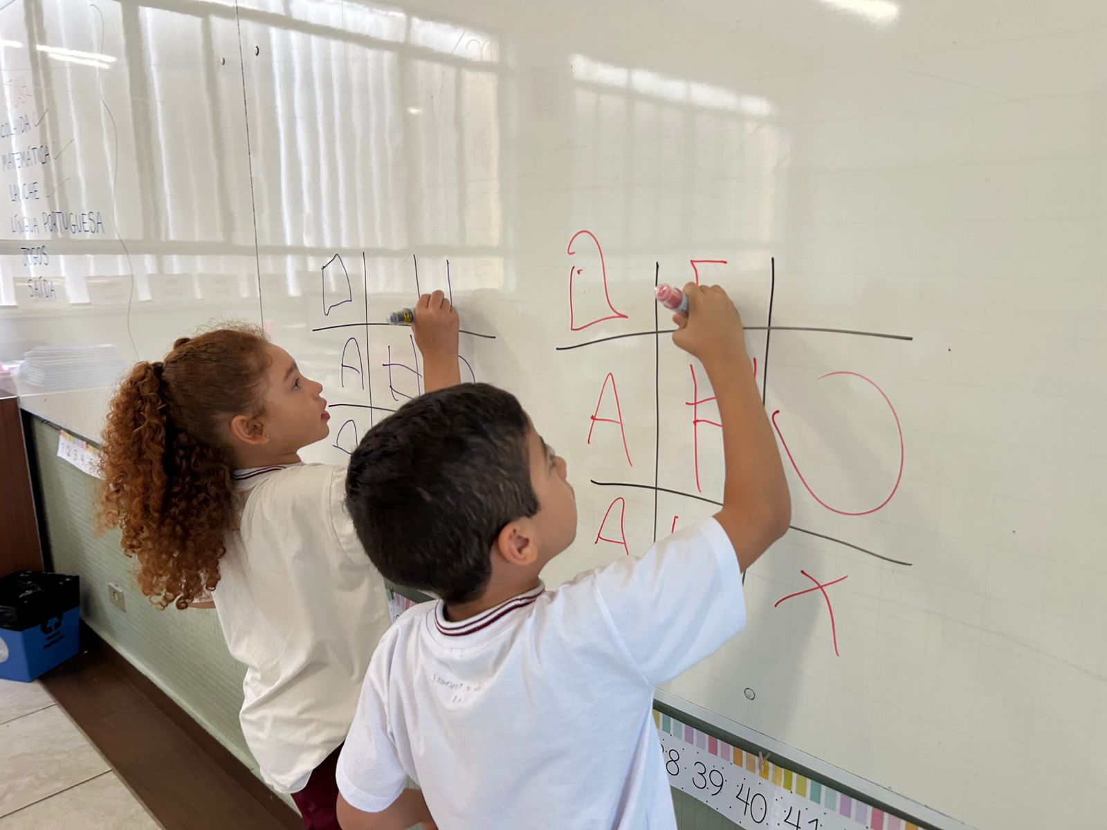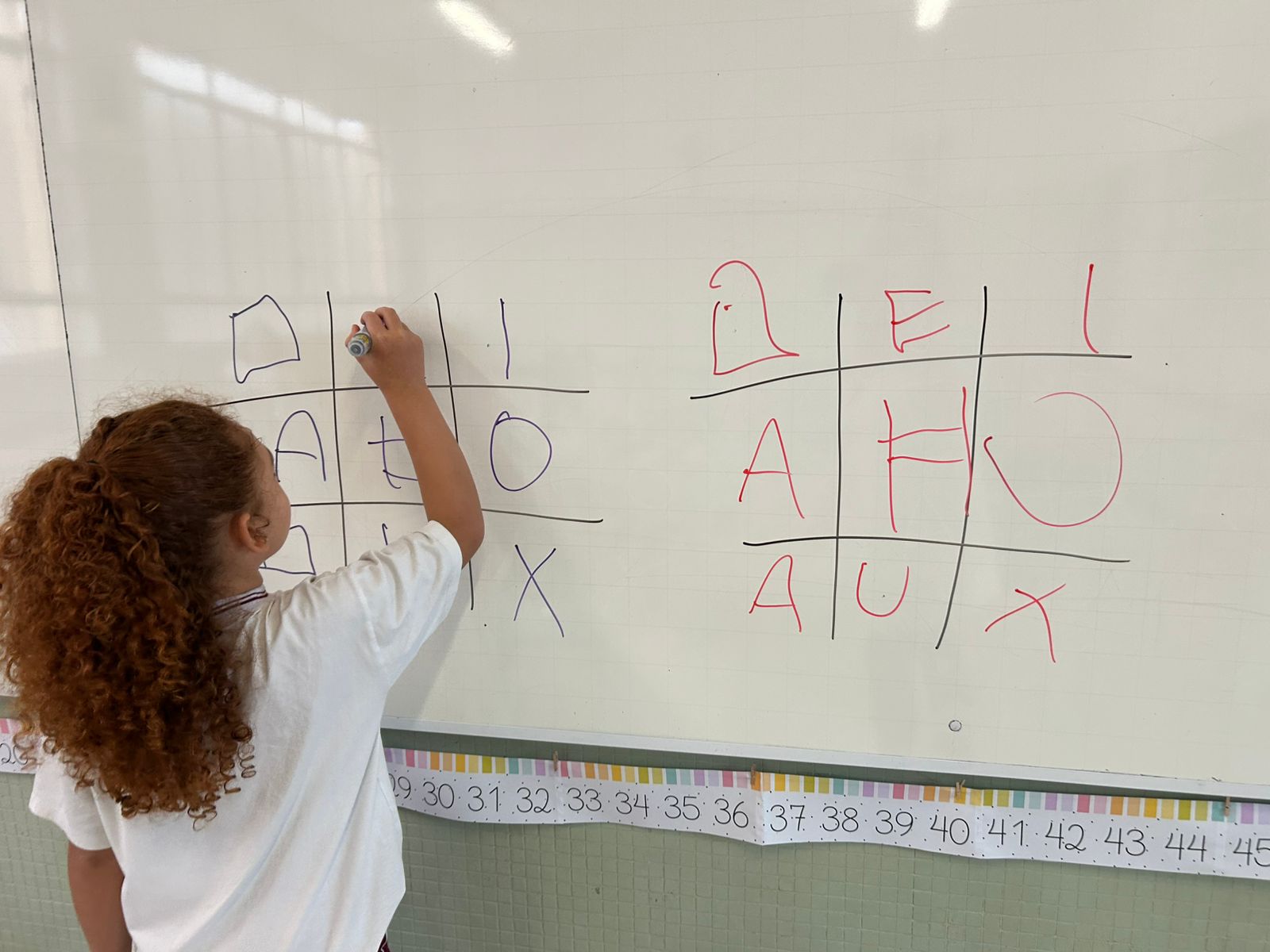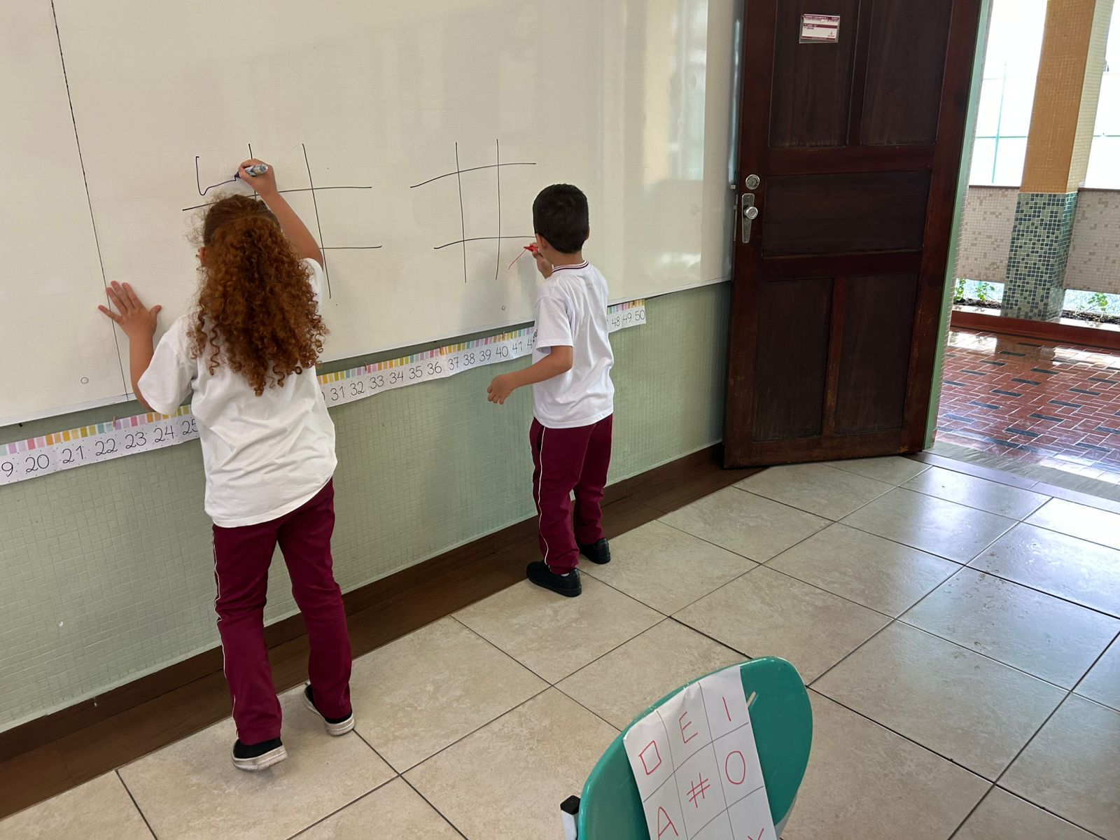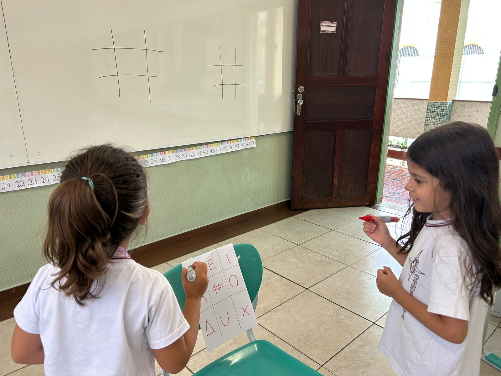 Com o jogo de memorização, os alunos do 1º ano A desenvolveram a atenção, o reconhecimento de letras e símbolos, além do raciocínio lógico, de um jeito leve, divertido e cheio de descobertas. A atividade estimulou a concentração, a interação entre os colegas e o prazer em aprender brincando, tornando o processo de aprendizagem ainda mais significativo.