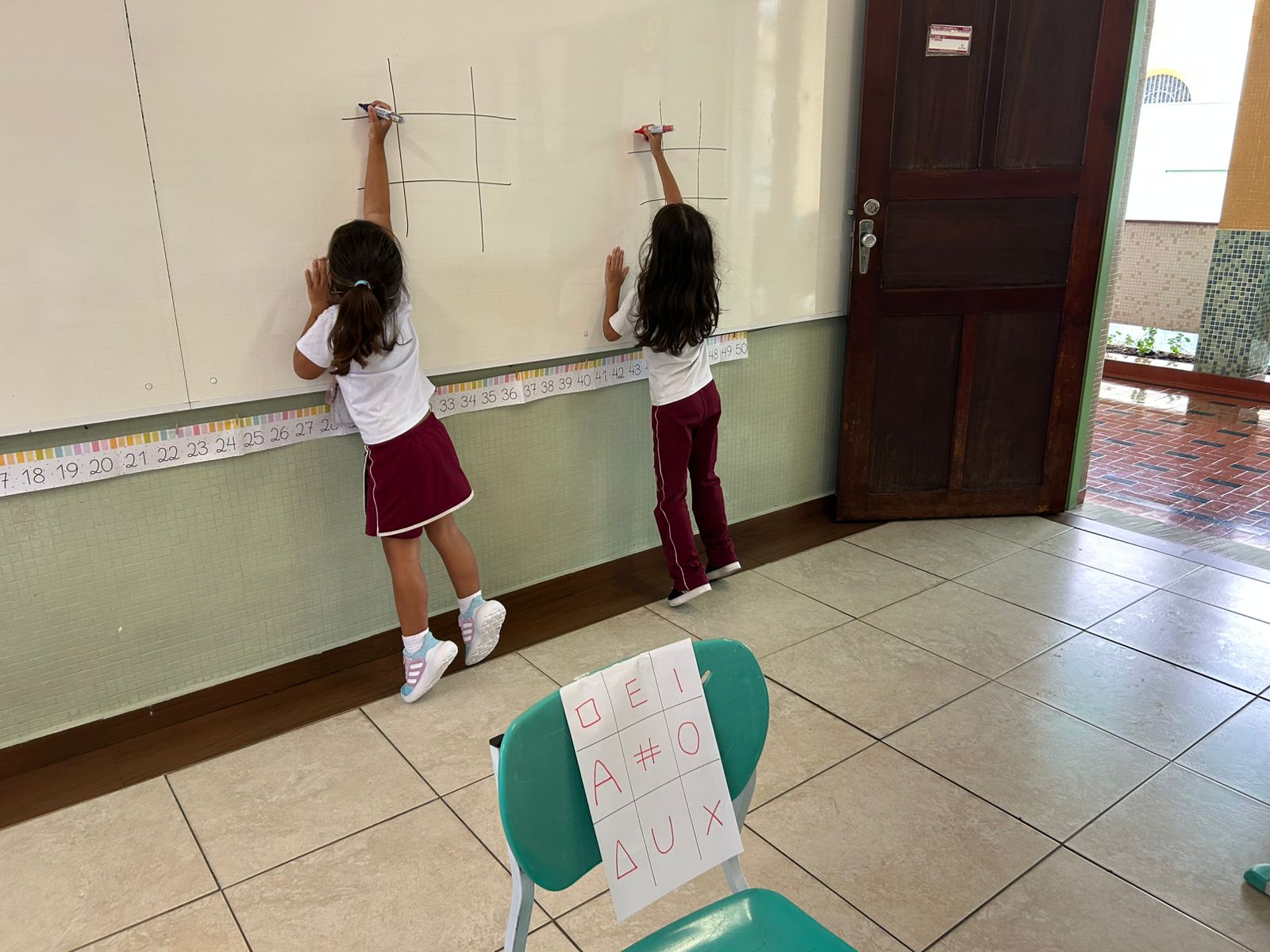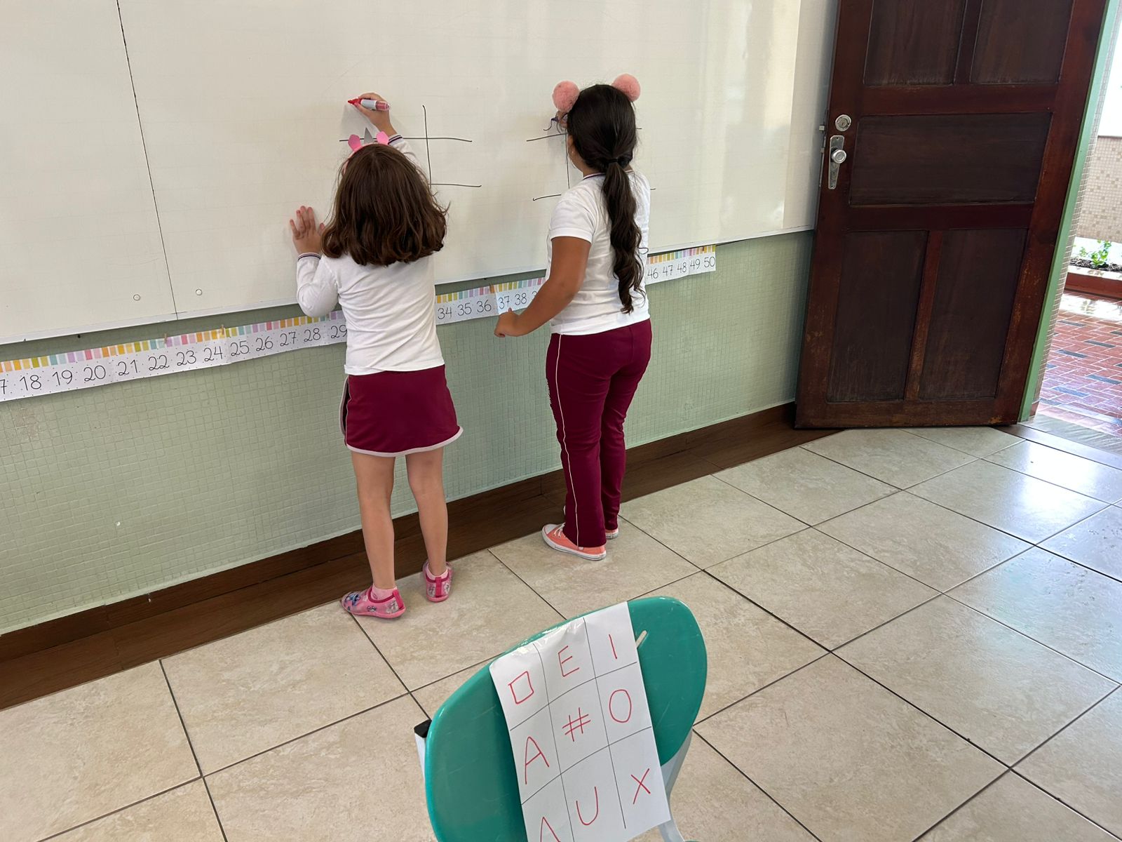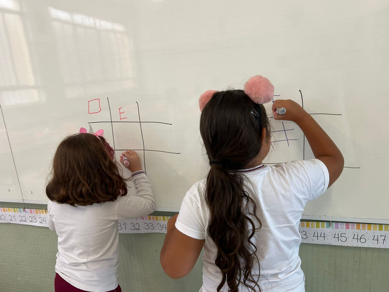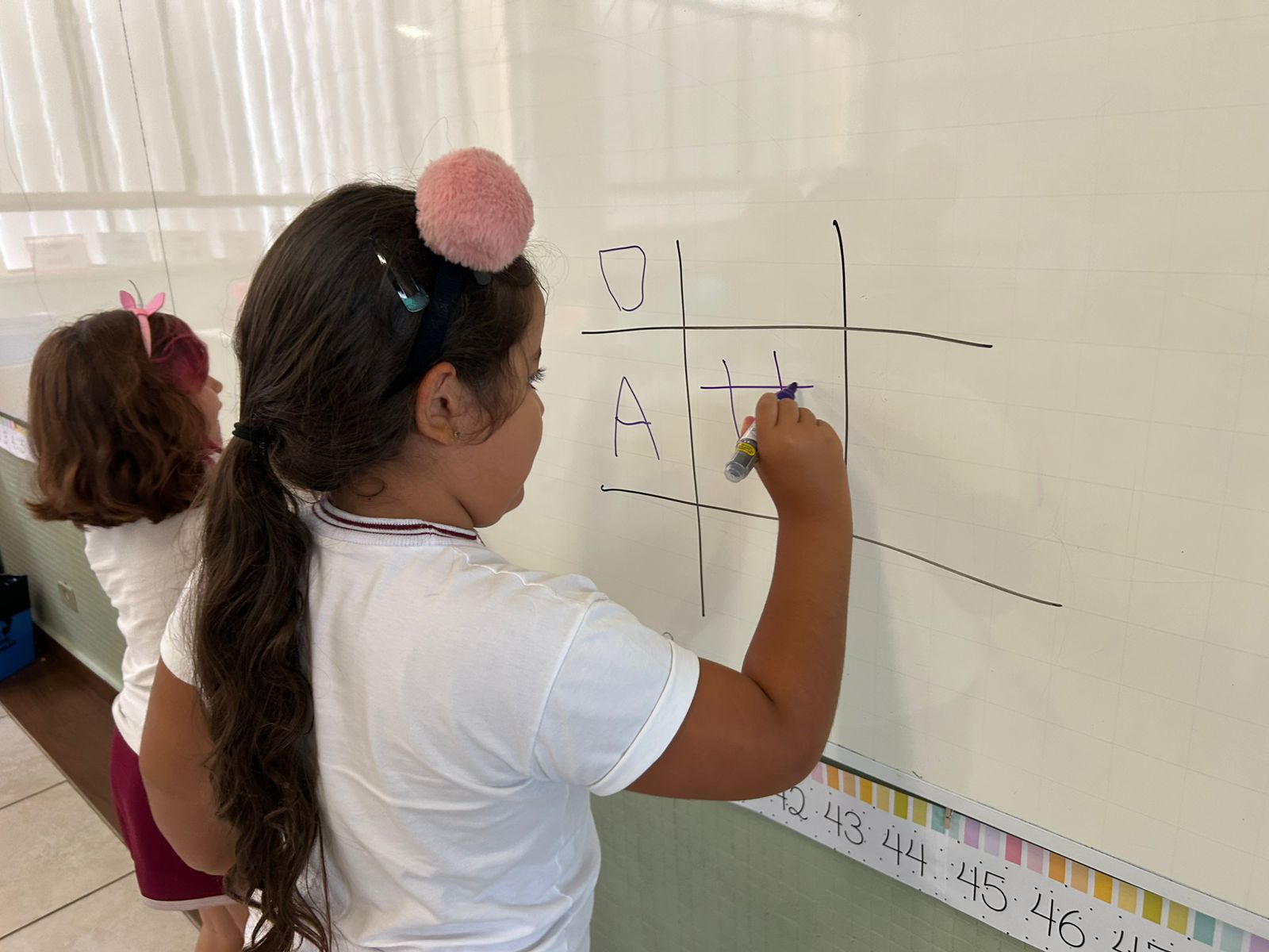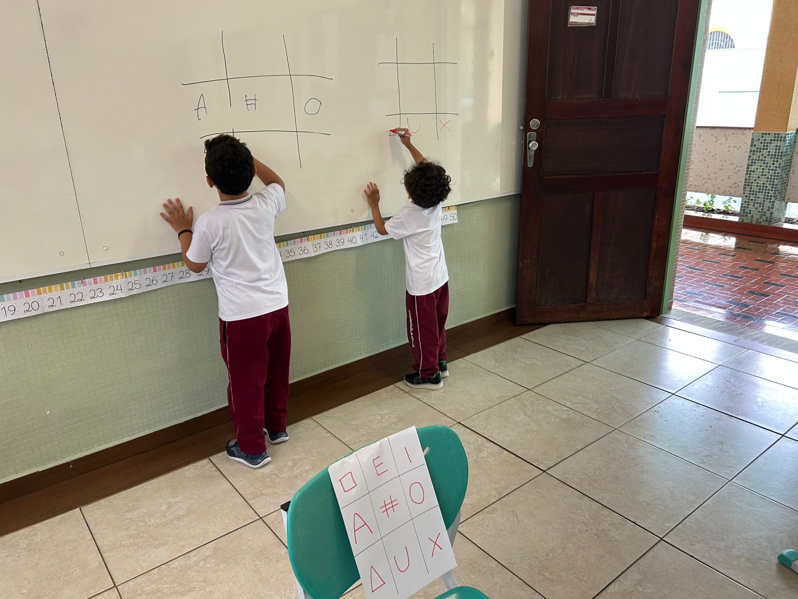 Com o jogo de memorização, os alunos do 1º ano A desenvolveram a atenção, o reconhecimento de letras e símbolos, além do raciocínio lógico, de um jeito leve, divertido e cheio de descobertas. A atividade estimulou a concentração, a interação entre os colegas e o prazer em aprender brincando, tornando o processo de aprendizagem ainda mais significativo.