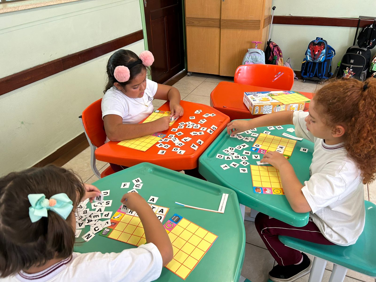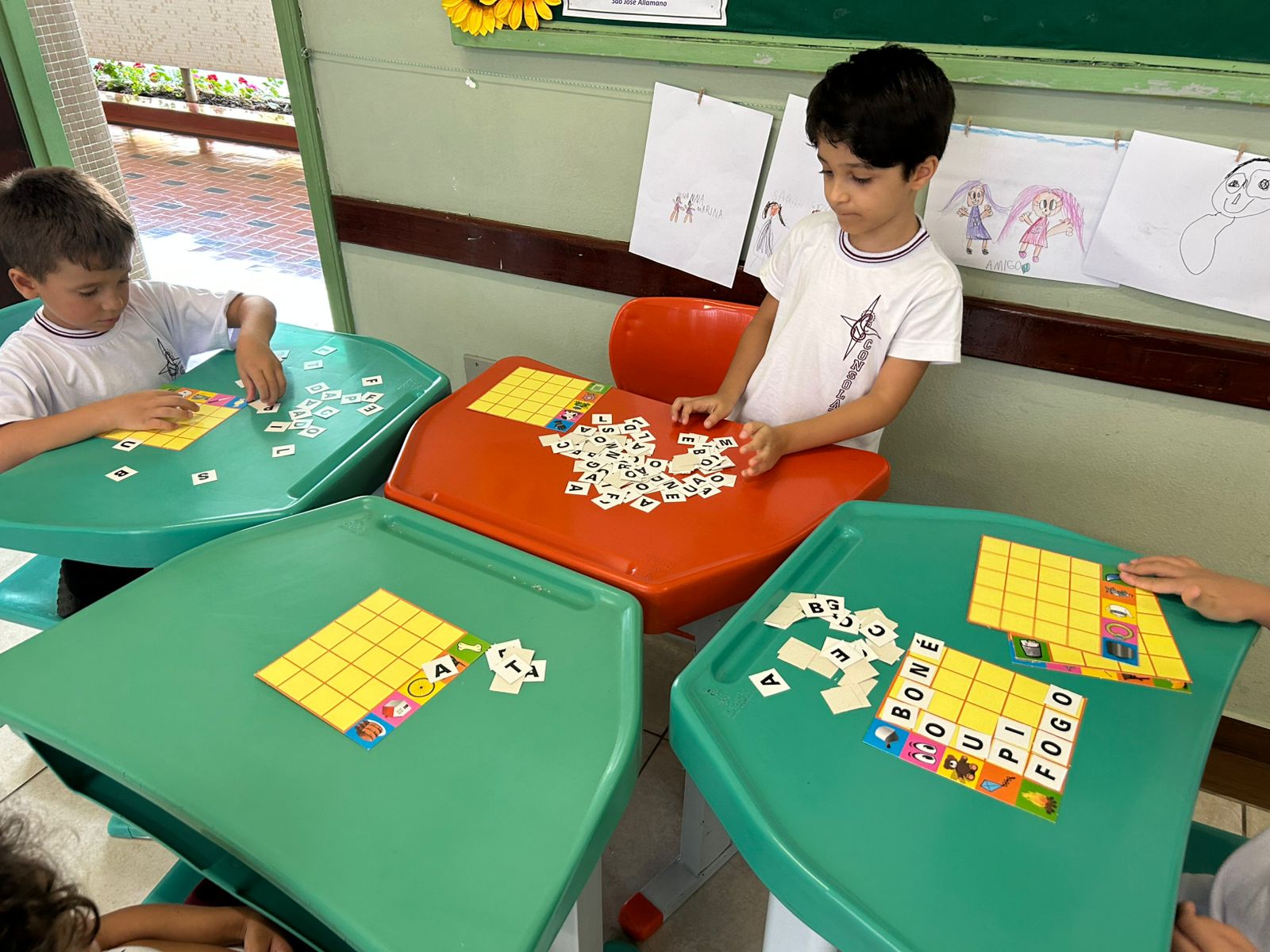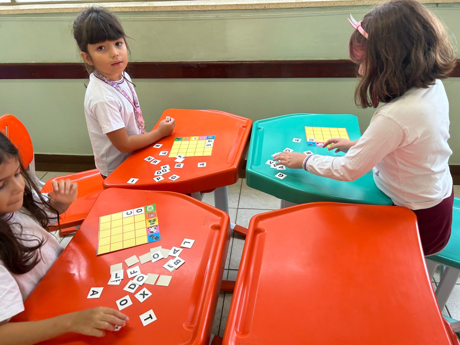 Em grupos, os alunos do 1º ano A, exploraram as letras móveis, montando palavras, trocando ideias e fortalecendo a leitura de forma lúdica e colaborativa.