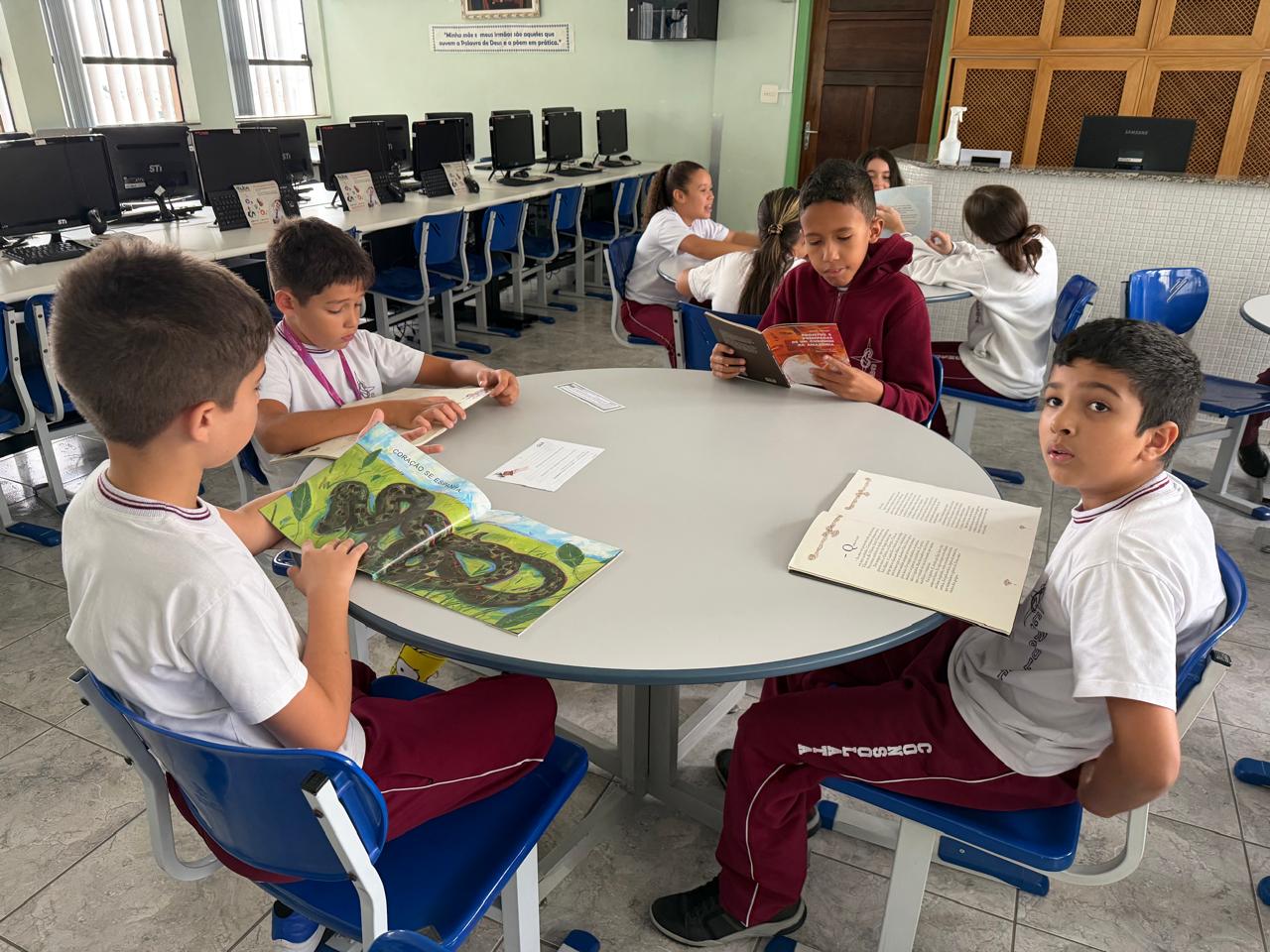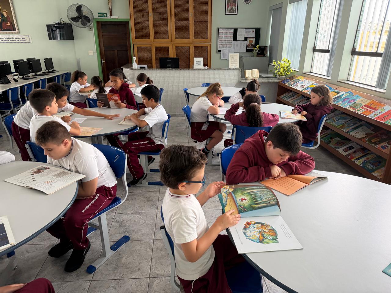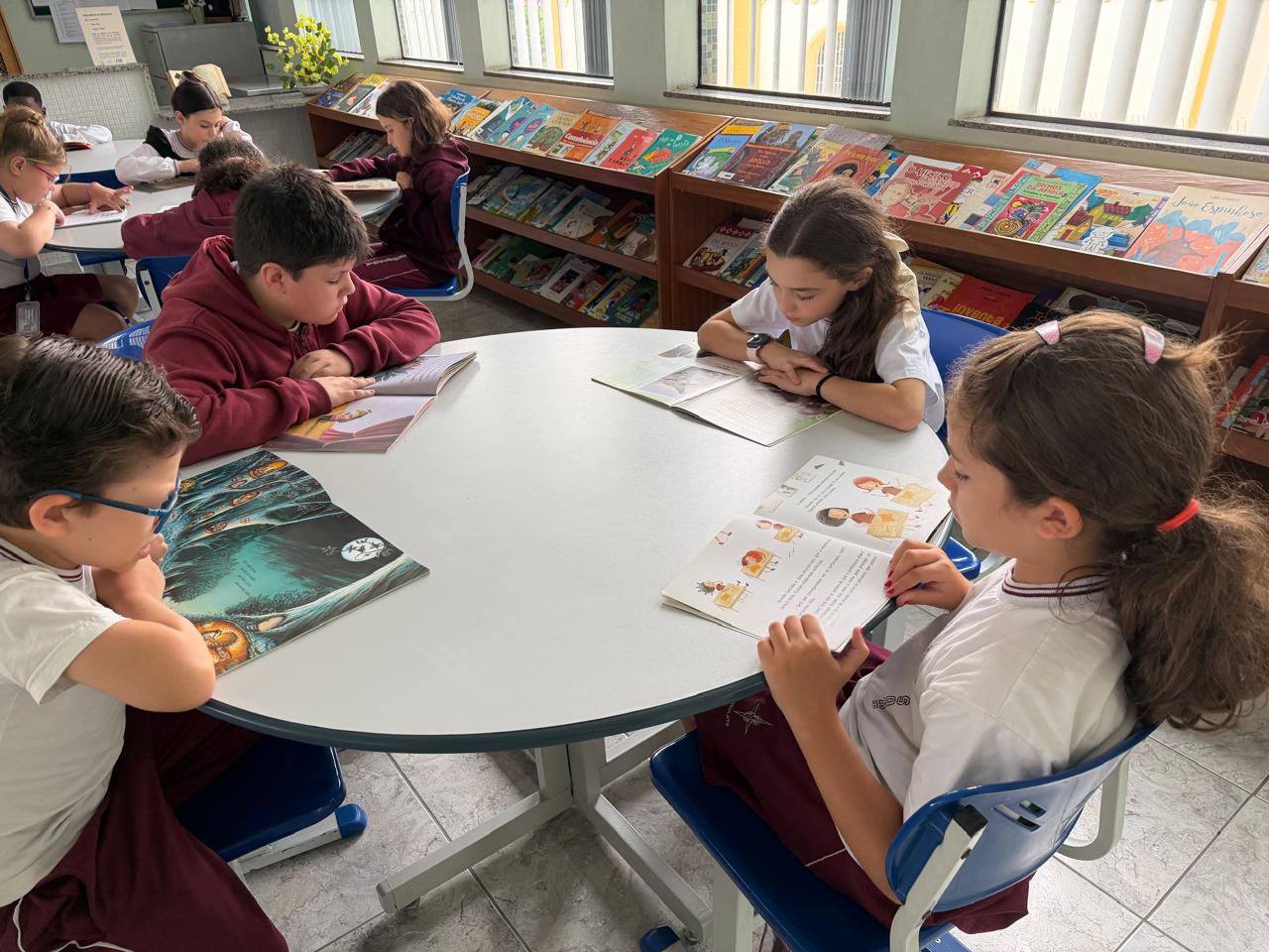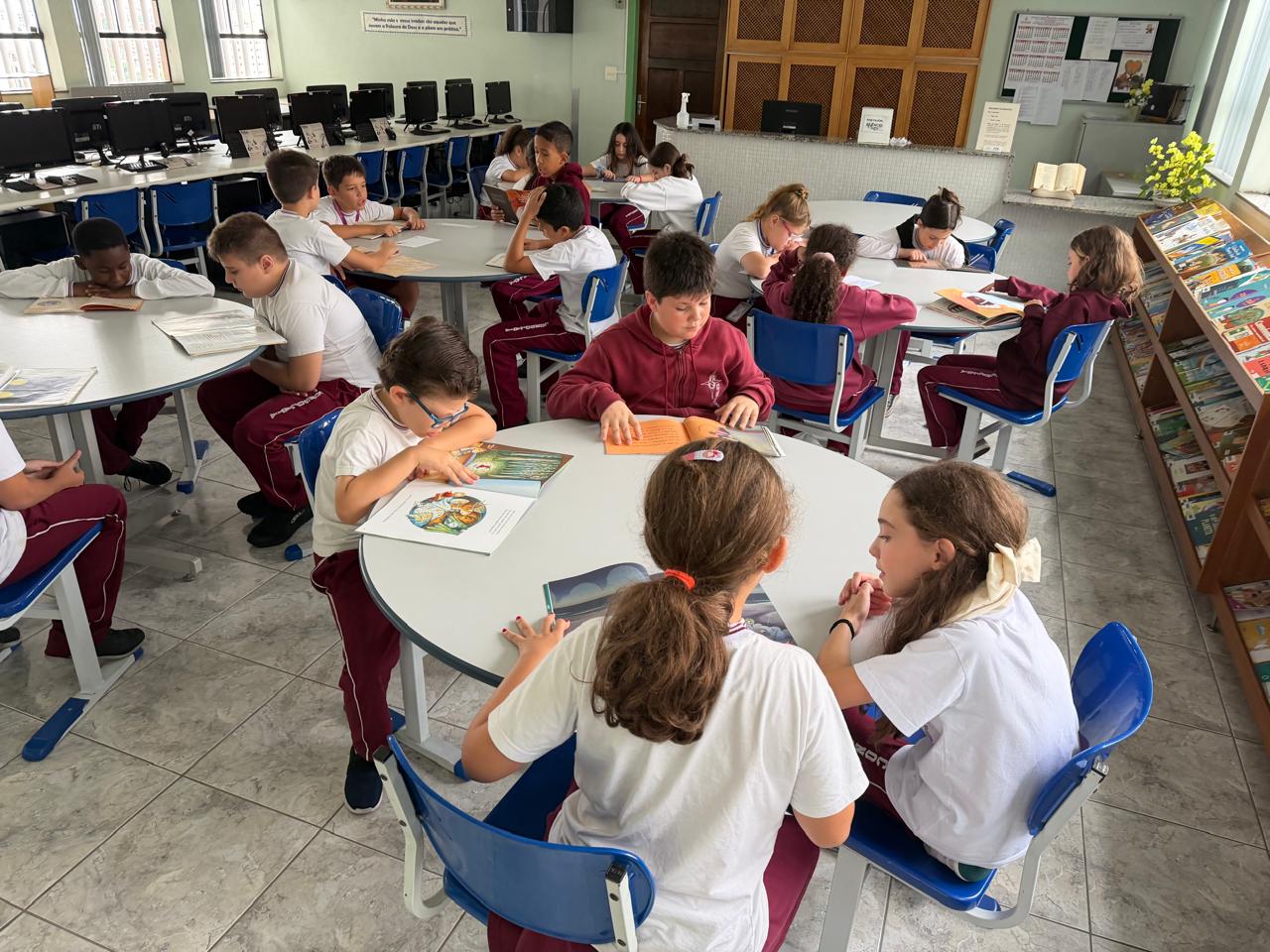 Os alunos do 4º ano A visitaram a biblioteca da escola e participaram de um momento especial de leitura e escuta de histórias.