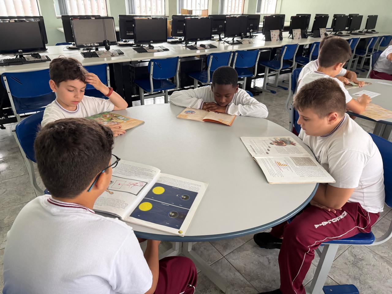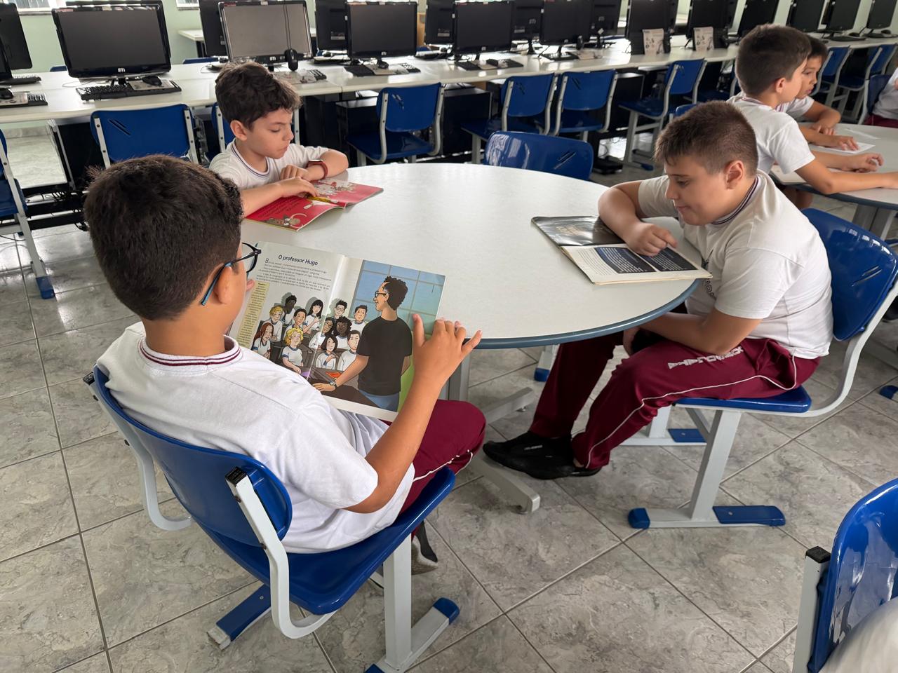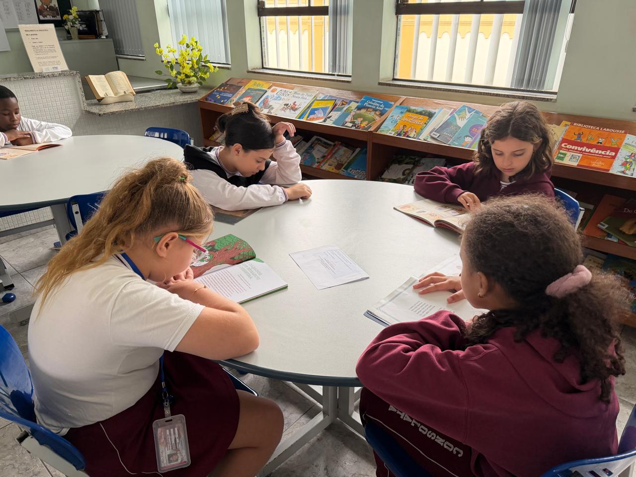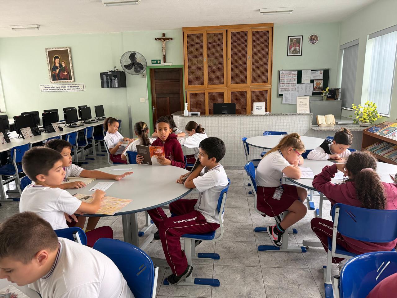 Os alunos do 4º ano A visitaram a biblioteca da escola e participaram de um momento especial de leitura e escuta de histórias.