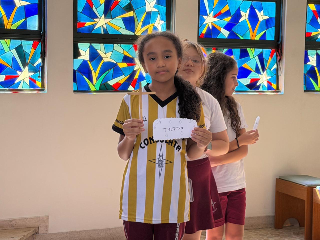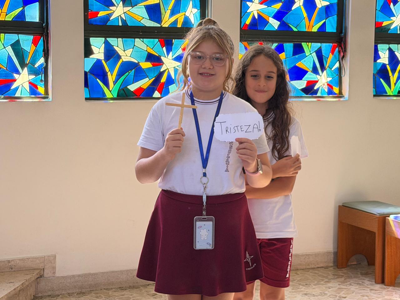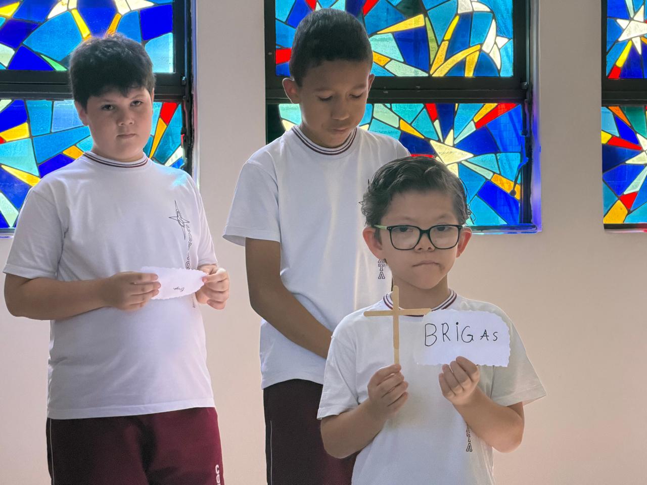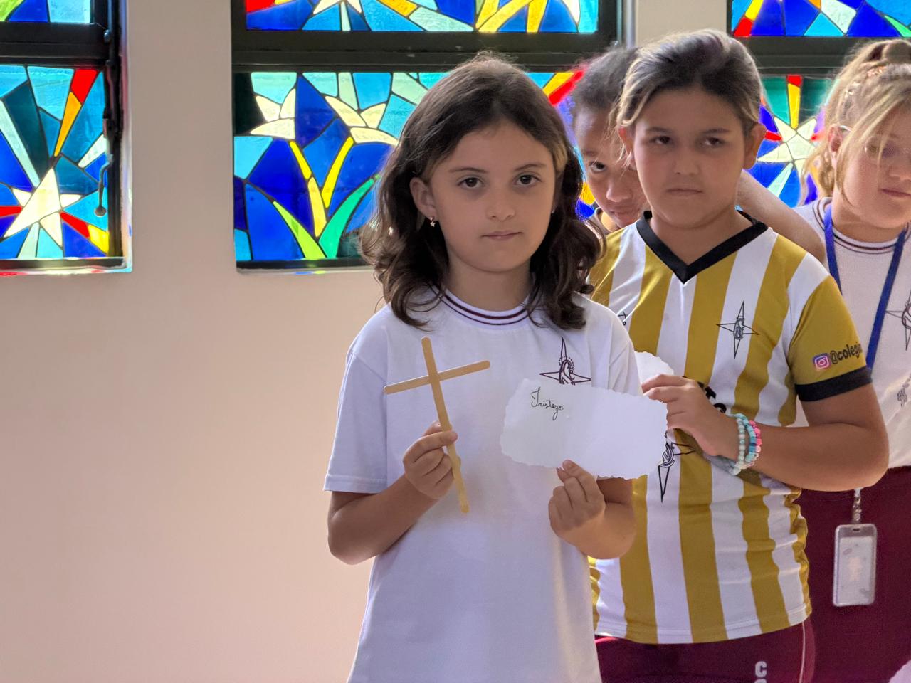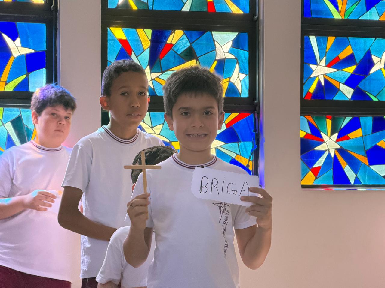 Durante esse momento, cada criança refletiu sobre um sentimento que gostaria que não existisse mais em nossa sociedade, expressando o desejo por uma vida nova, pautada no amor, no respeito e na esperança.