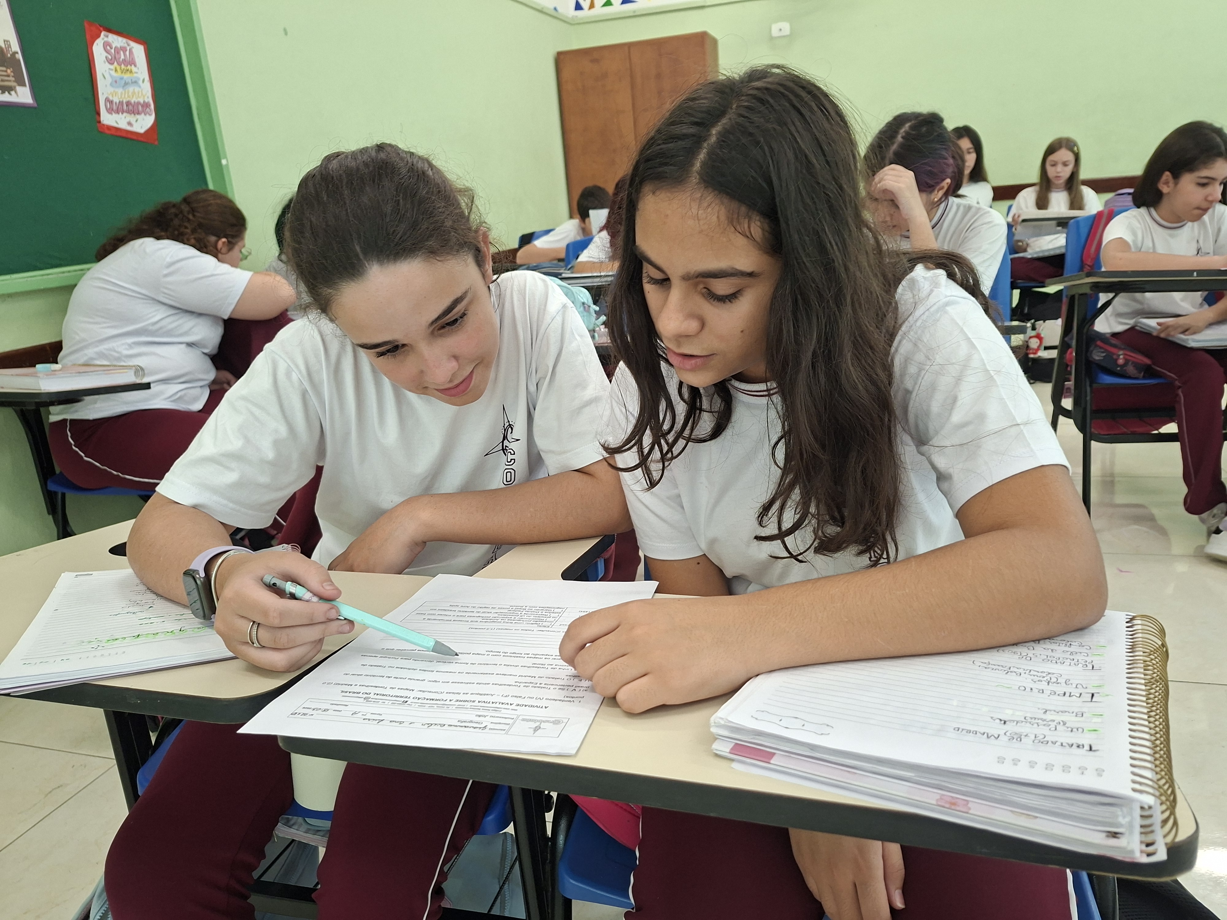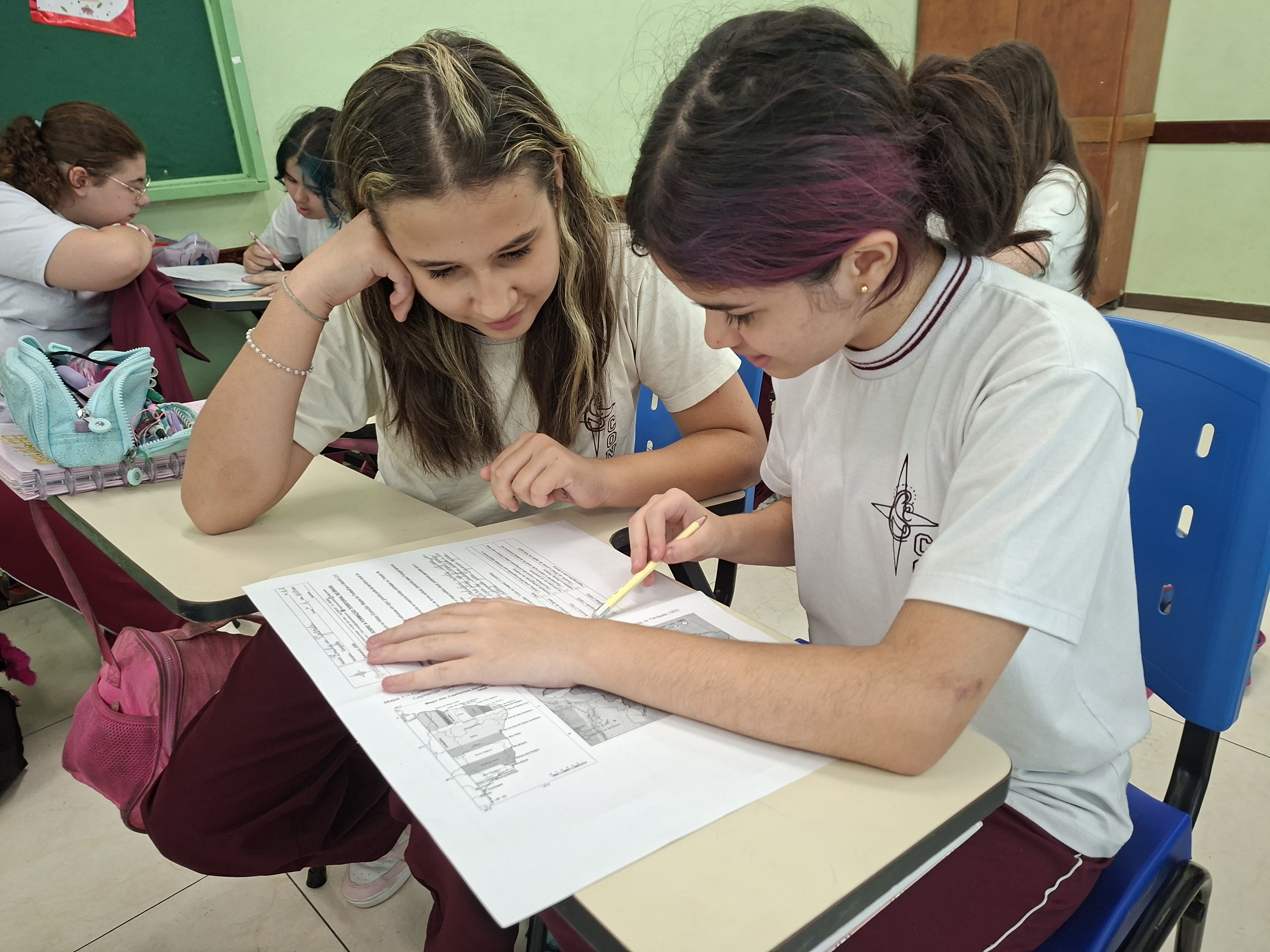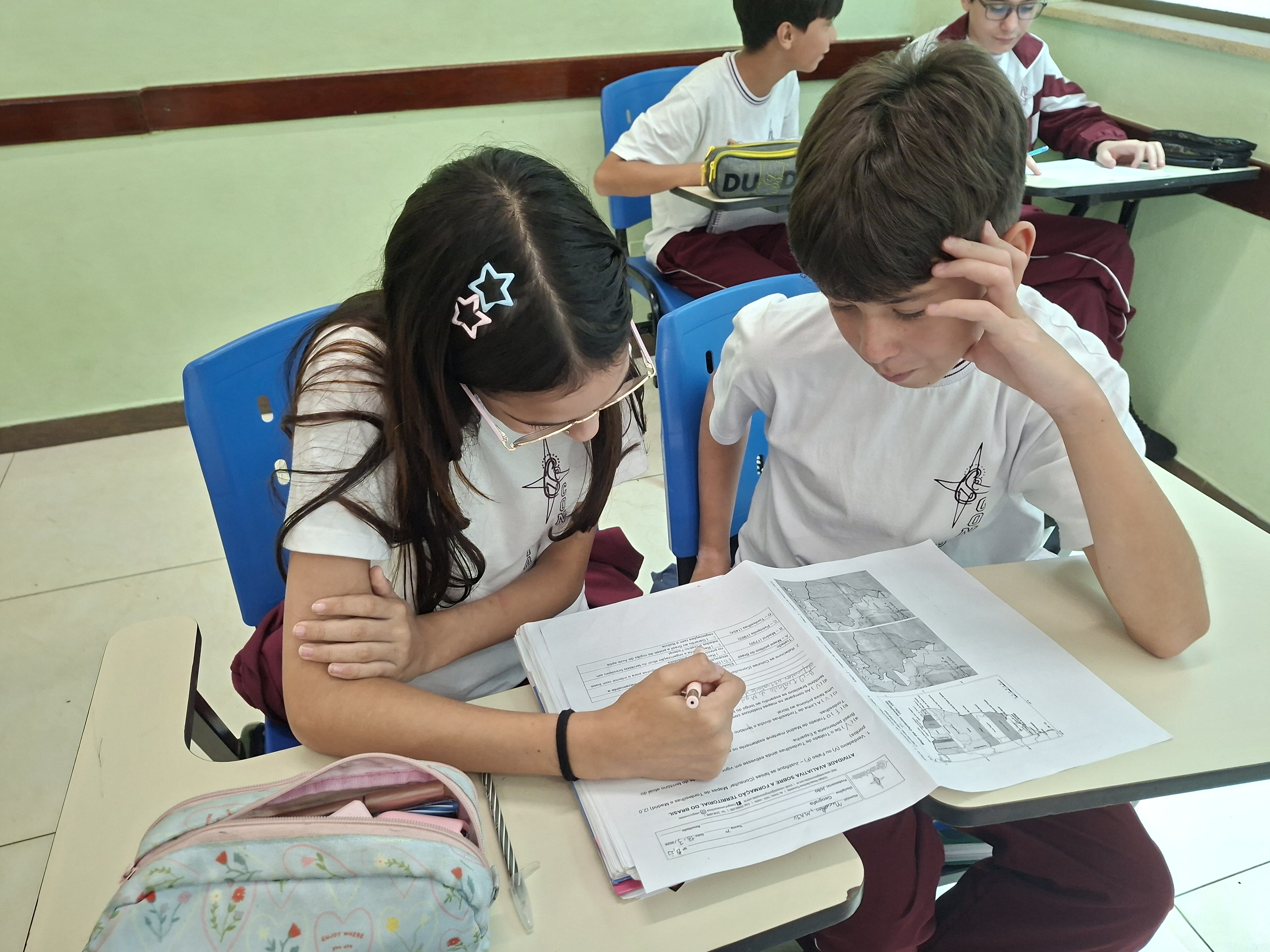 Trabalhando em duplas, nossos alunos se tornaram verdadeiros investigadores das fronteiras. Com o apoio do Professor João (Geografia), eles compararam mapas históricos — desde o Tratado de Tordesilhas até a conquista do Acre — com o nosso mapa político atual projetado na lousa.