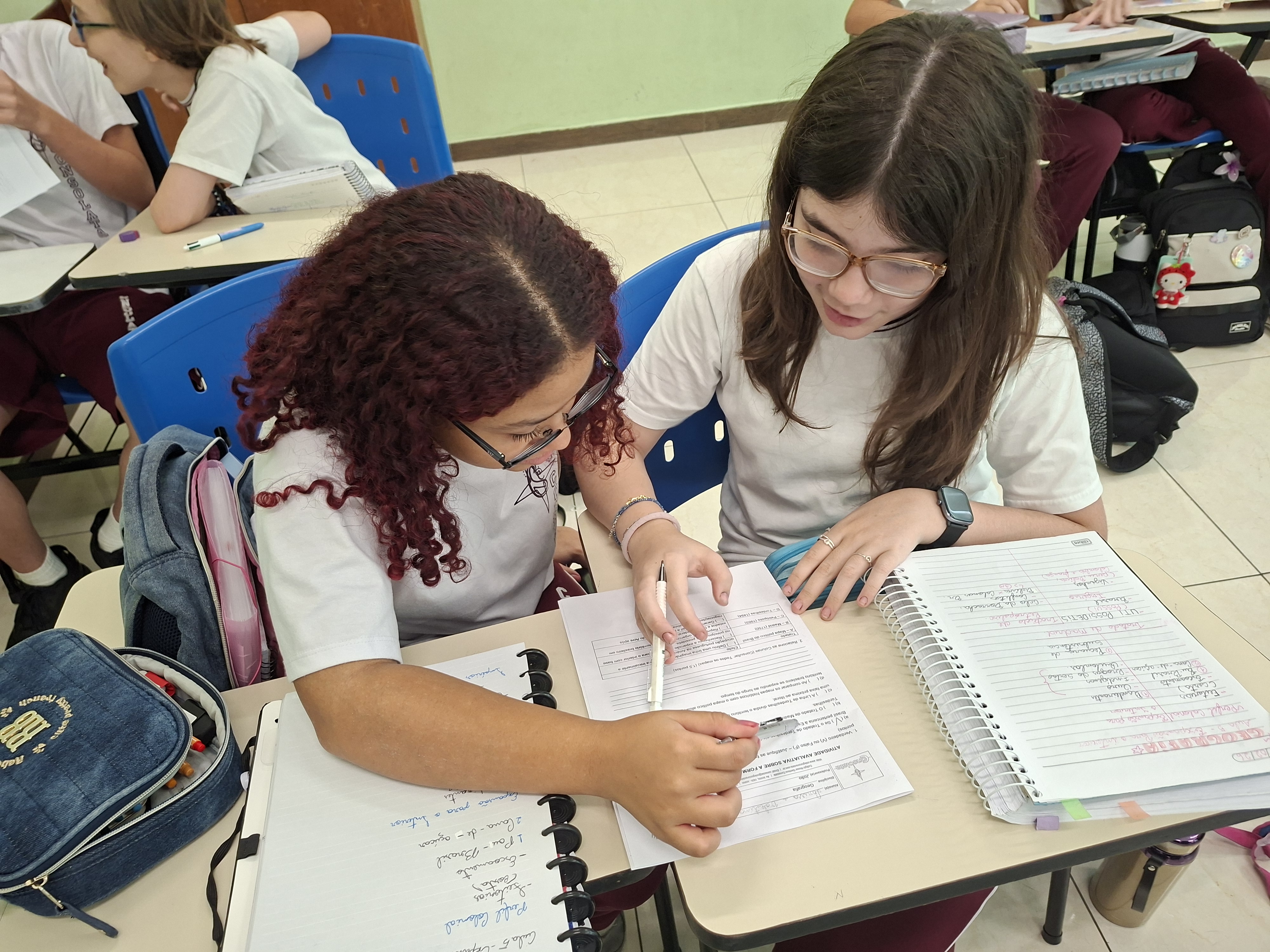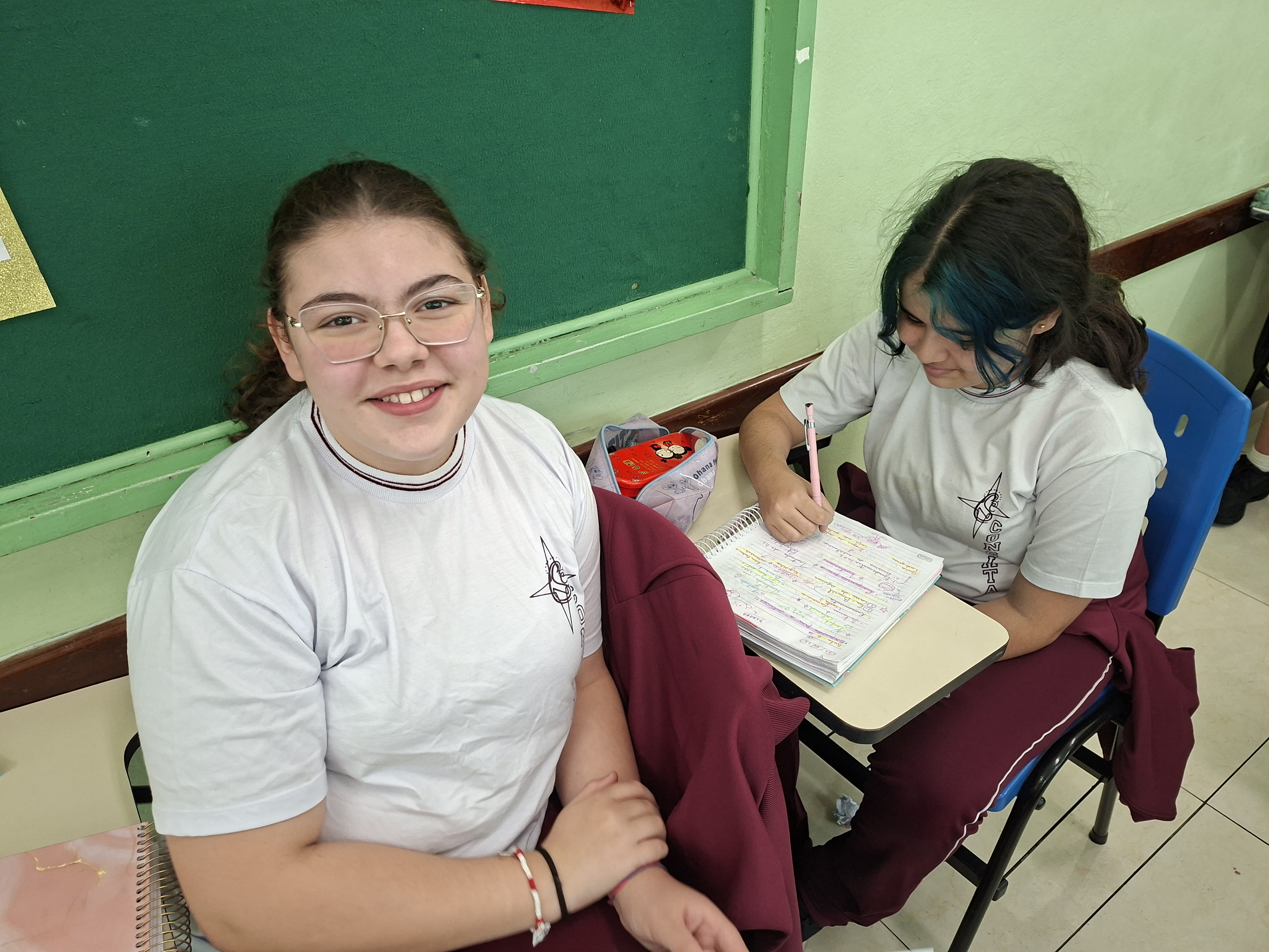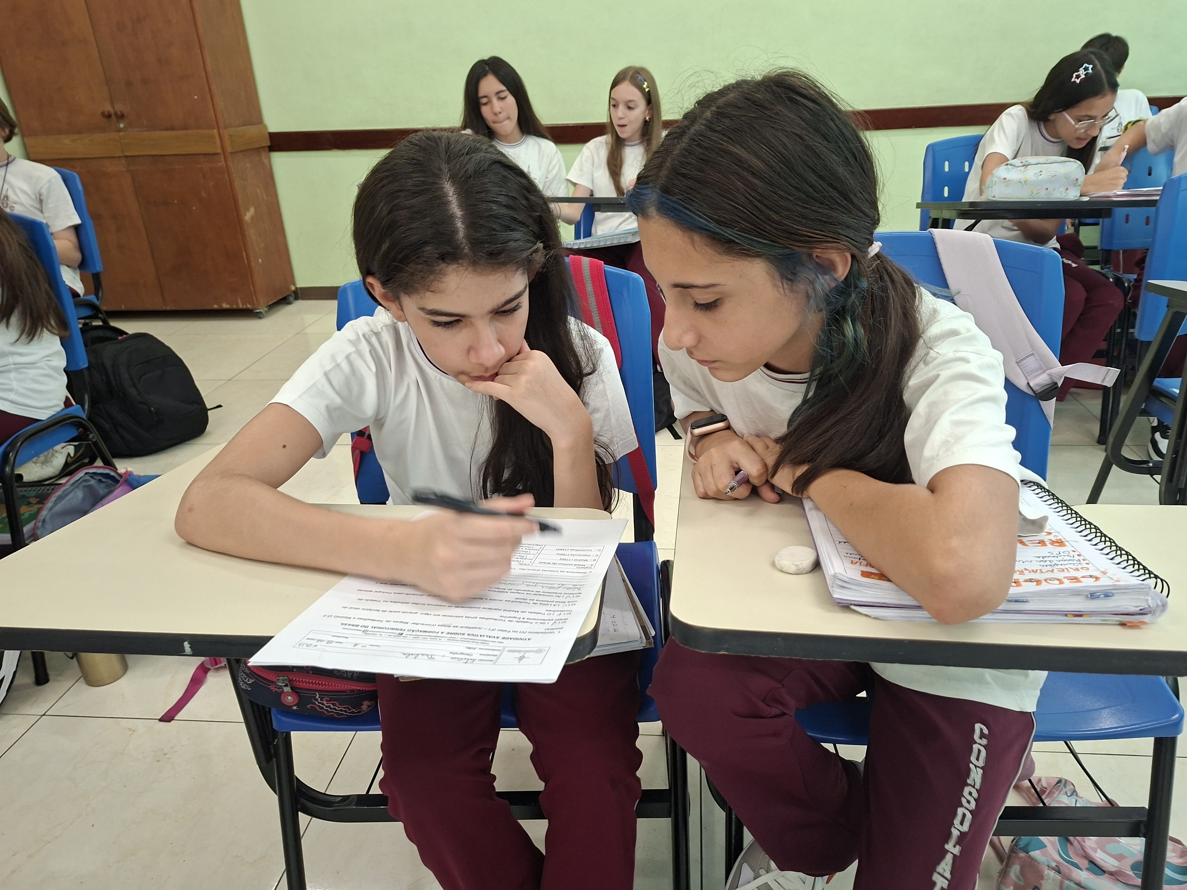 Trabalhando em duplas, nossos alunos se tornaram verdadeiros investigadores das fronteiras. Com o apoio do Professor João (Geografia), eles compararam mapas históricos — desde o Tratado de Tordesilhas até a conquista do Acre — com o nosso mapa político atual projetado na lousa.