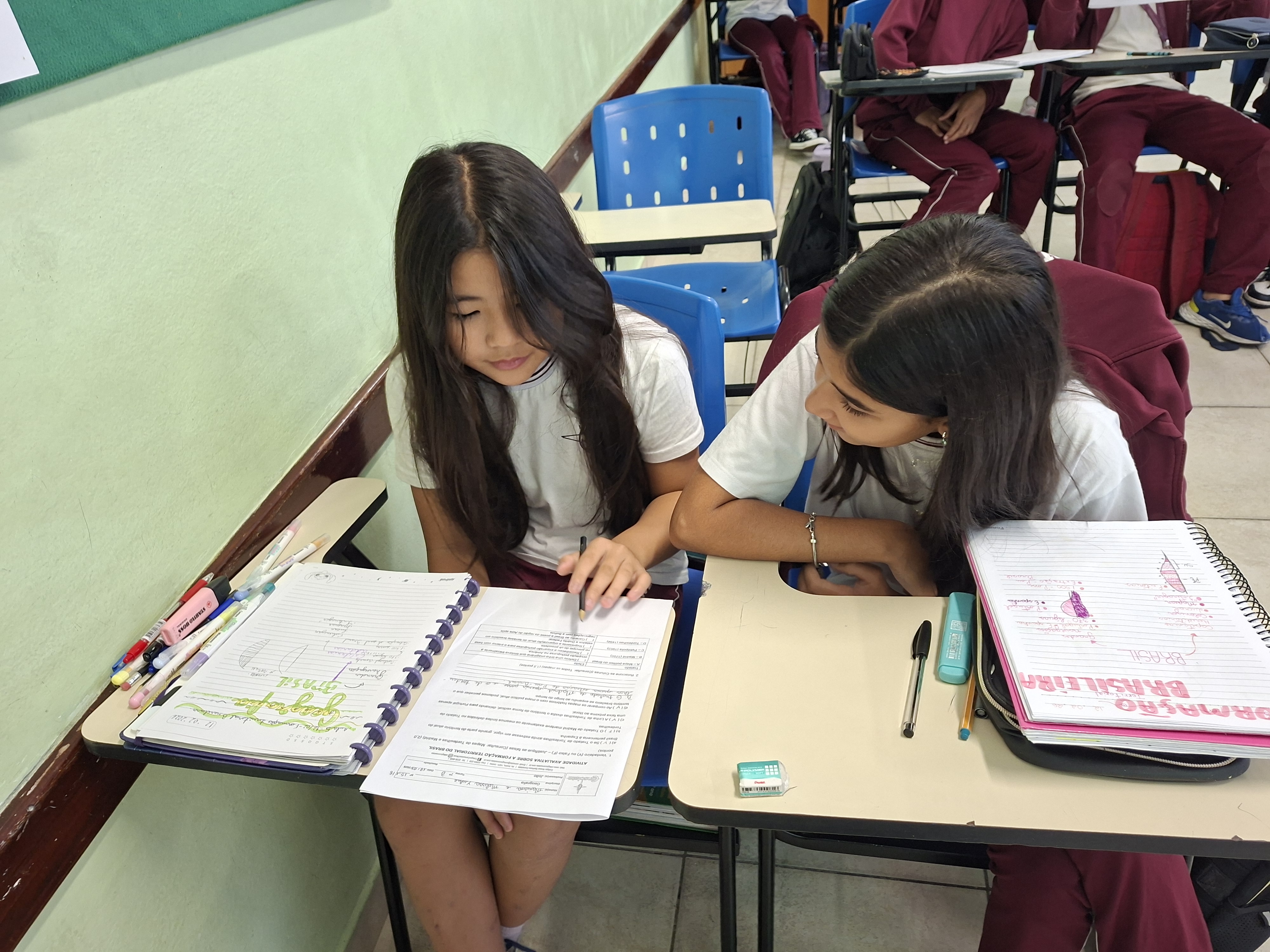 Em duplas, os alunos analisaram as transformações do Brasil: por que o Acre é brasileiro? Como "furamos" a linha de Tordesilhas? Utilizando mapas impressos e o mapa político atual como guia, eles debateram sobre o princípio de Uti Possidetis e o impacto de cada tratado na nossa vida hoje.