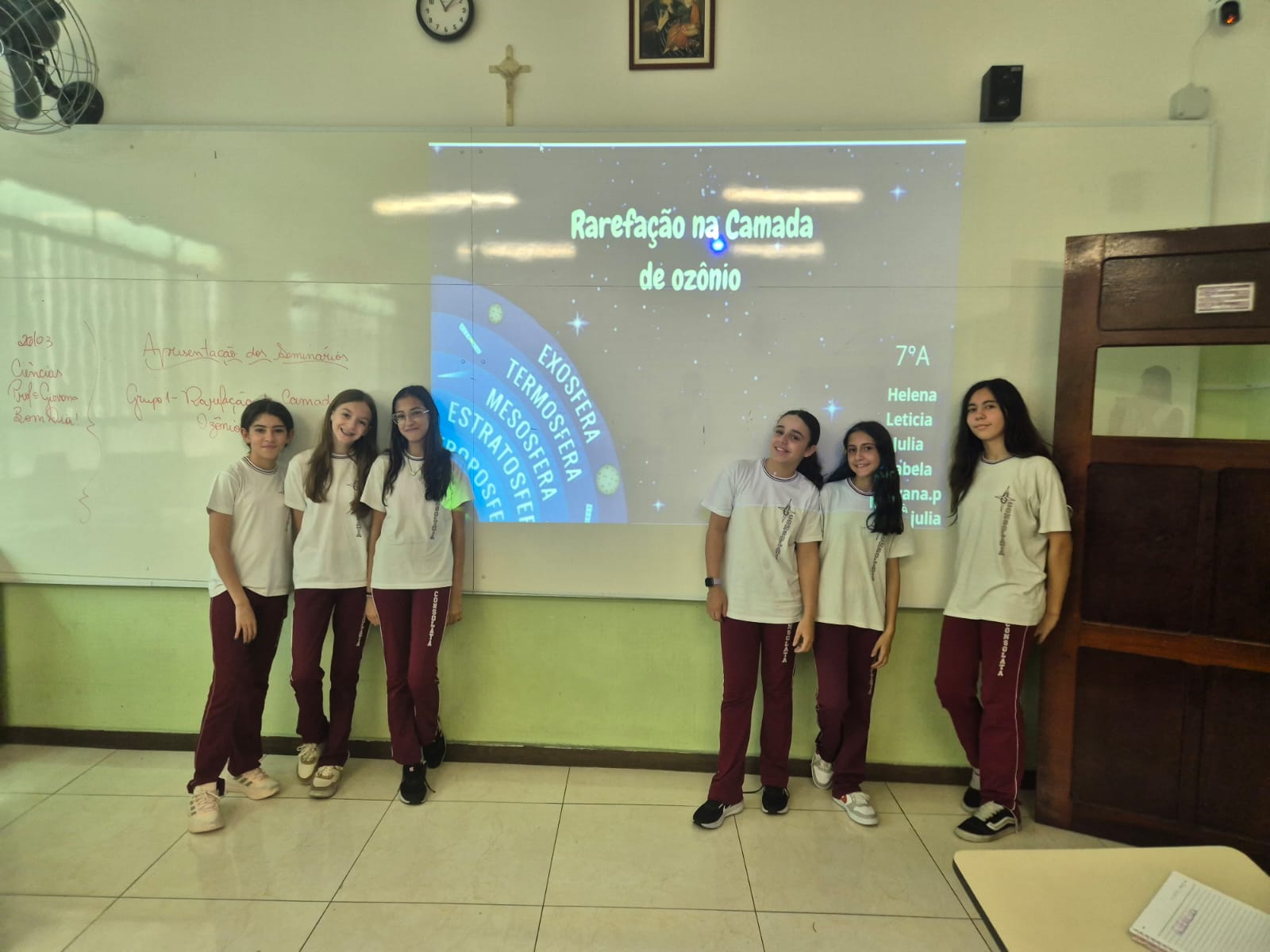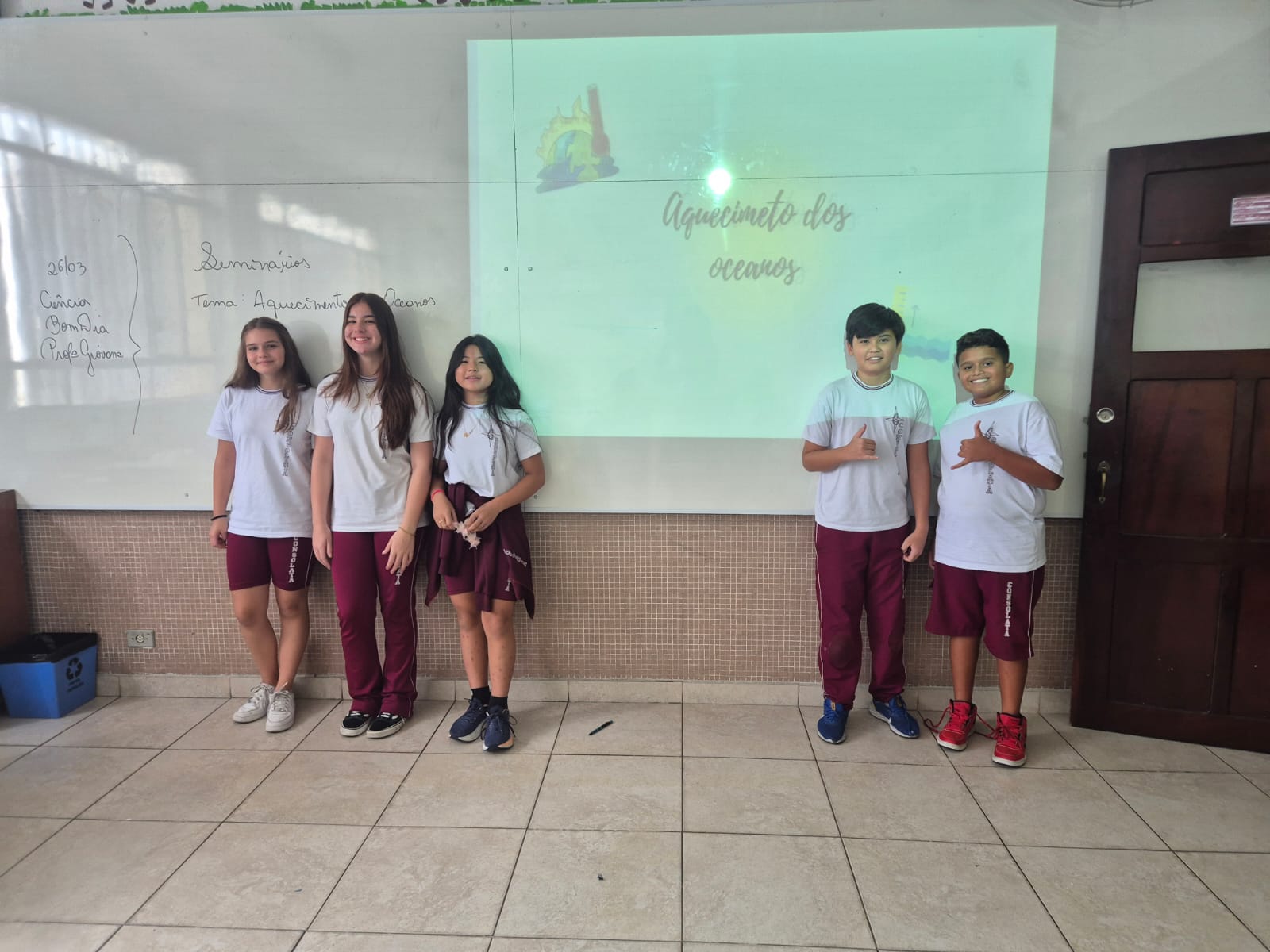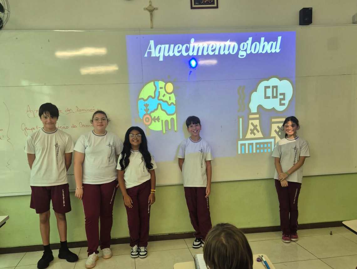 Os alunos dos 7º anos A e B, na disciplina de Ciências, orientados pela professora Giovana, protagonizaram um momento de grande aprendizado ao apresentarem seminários sobre temas atuais e de extrema relevância ambiental, como aquecimento global, aquecimento dos oceanos, desregulação dos fenômenos climáticos e chuva ácida.