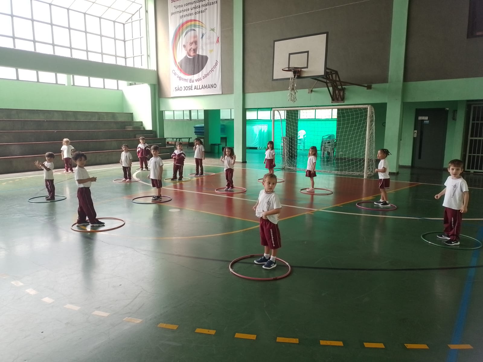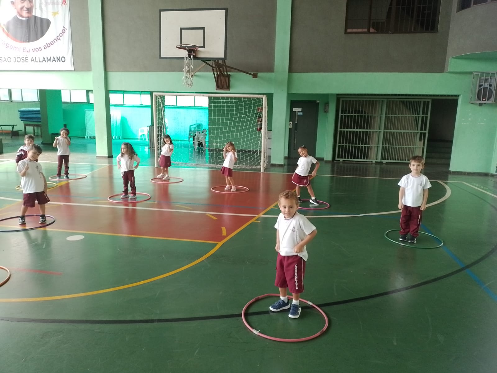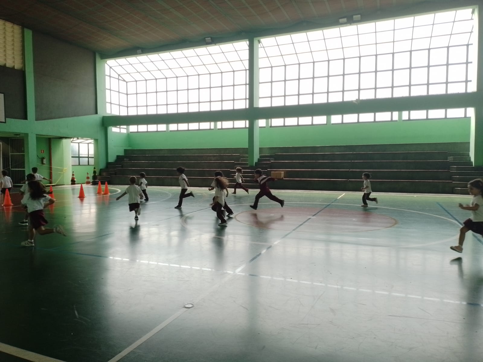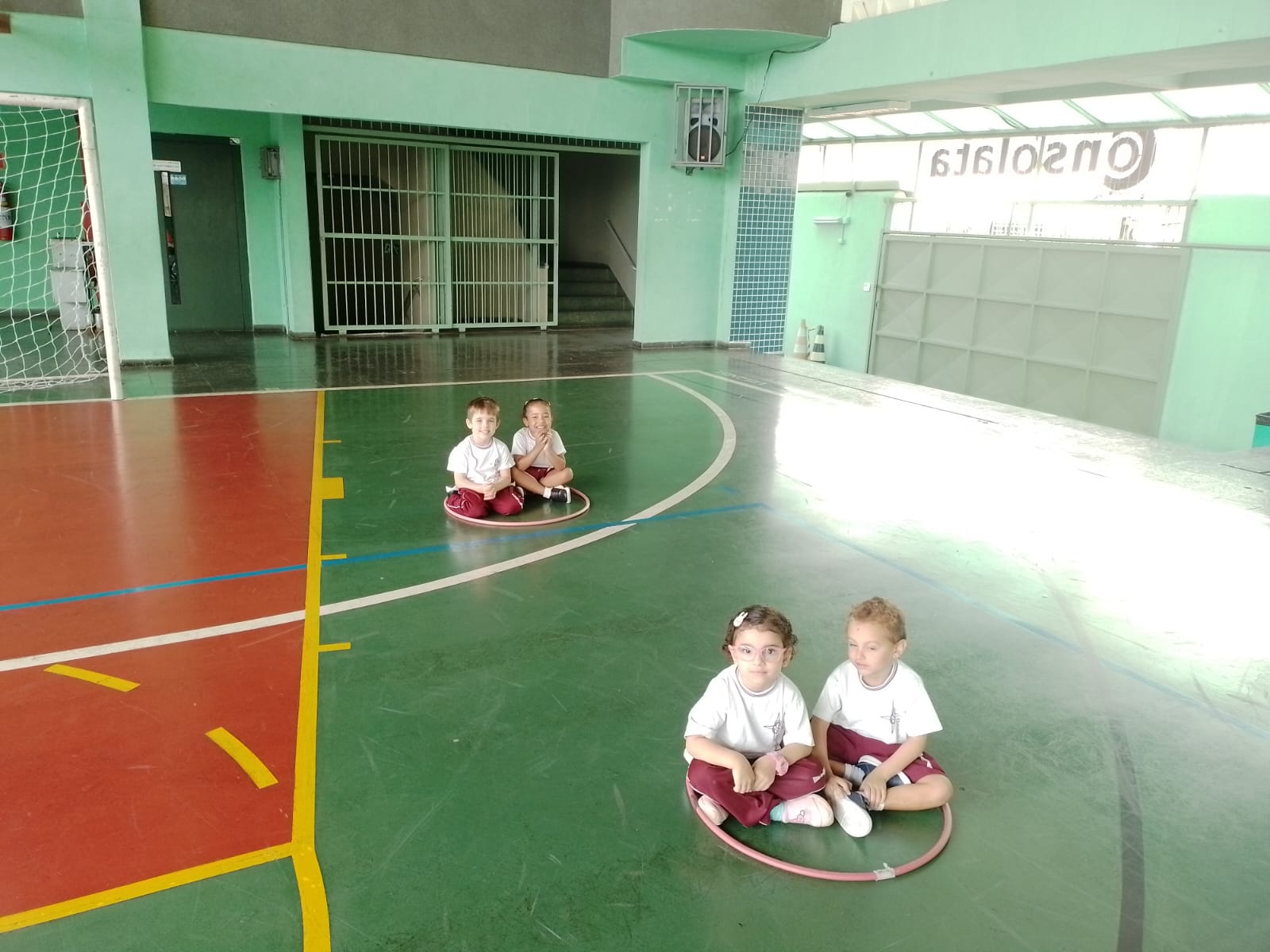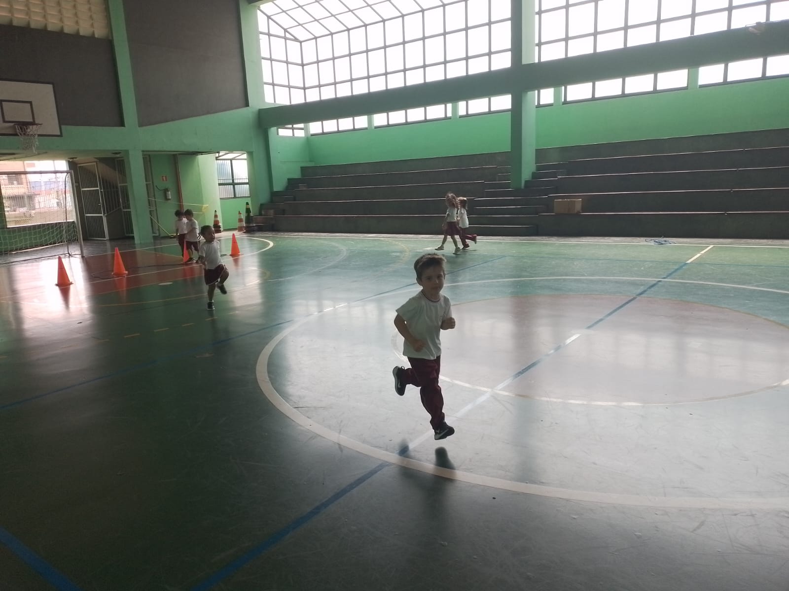 Na aula de Educação Física do Infantil 1 e 2 a professora Patrícia Cajeron realizou uma atividade lúdica, que tem como objetivo desenvolver noção espacial de forma divertida.