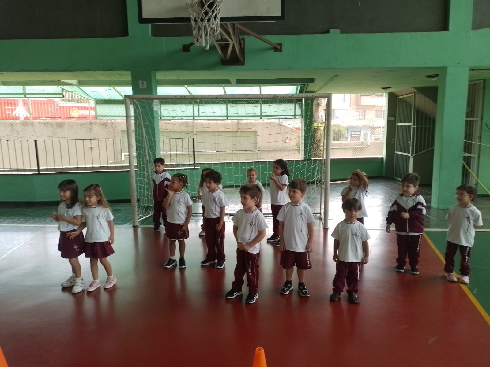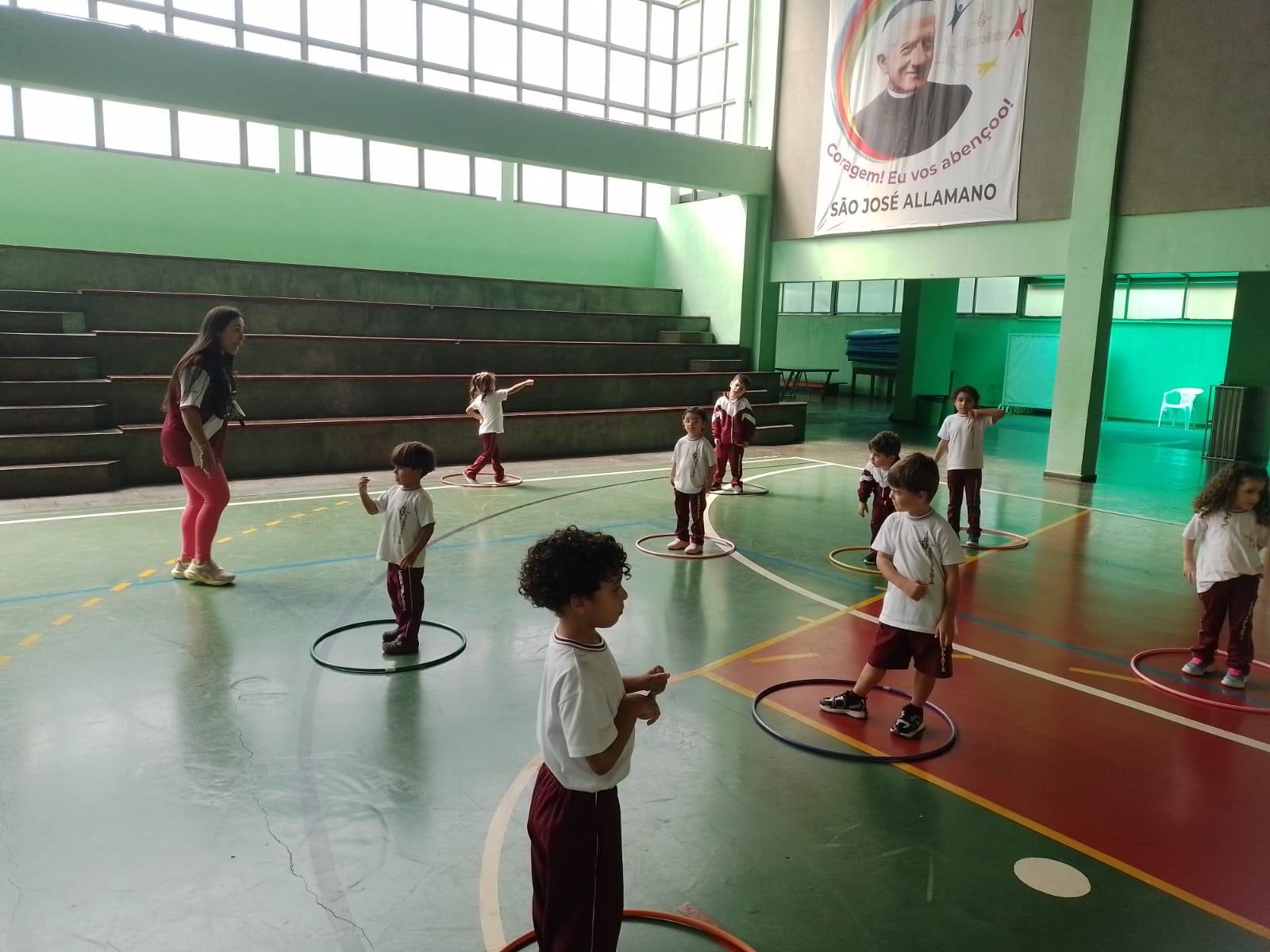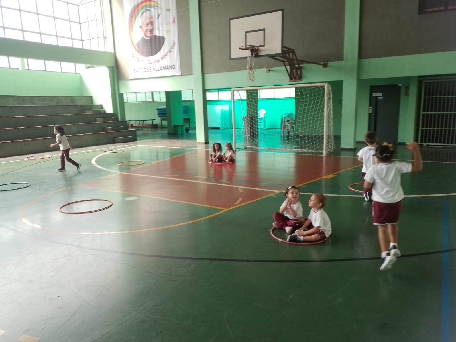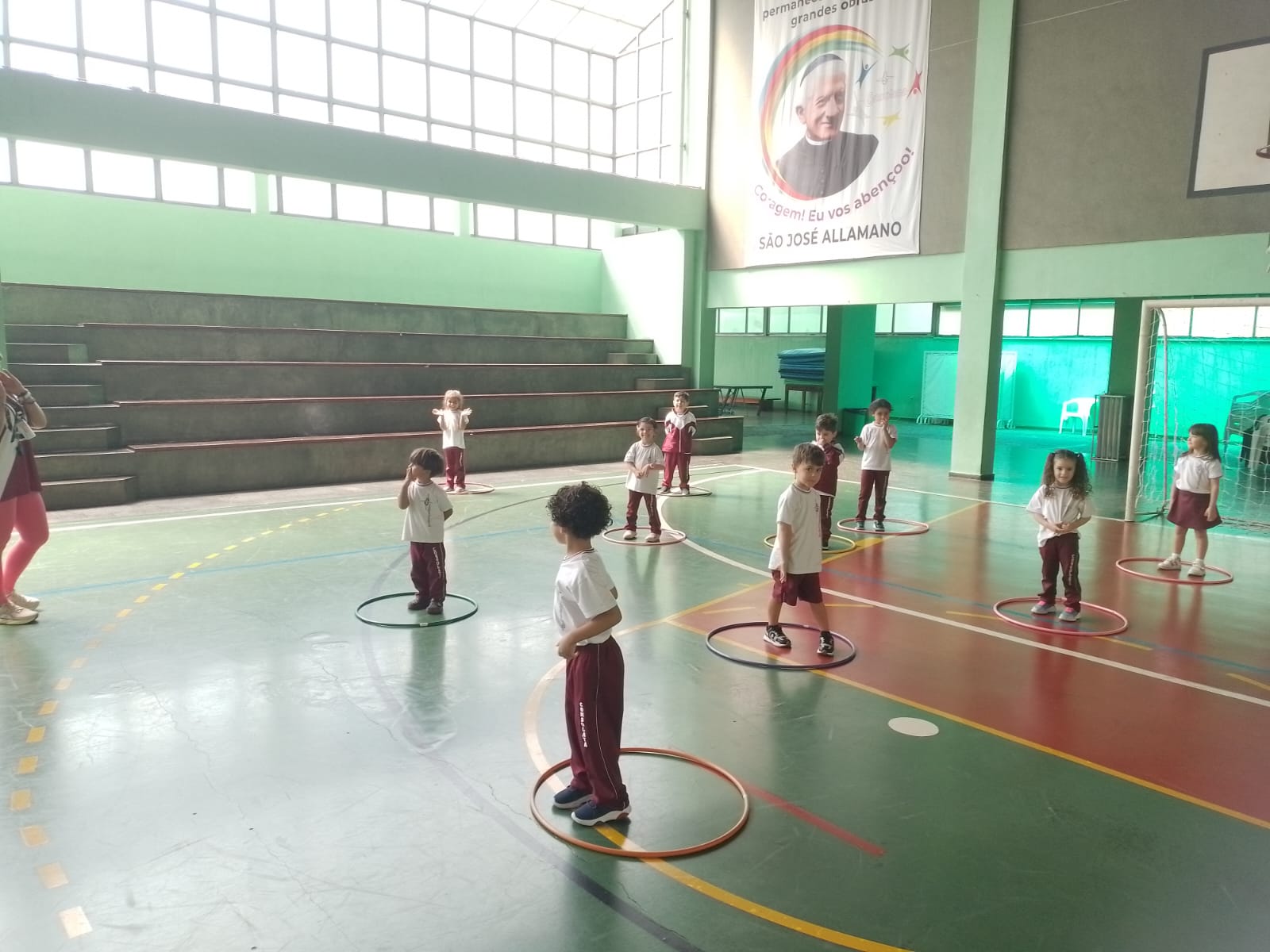 Na aula de Educação Física do Infantil 1 e 2 a professora Patrícia Cajeron realizou uma atividade lúdica, que tem como objetivo desenvolver noção espacial de forma divertida.