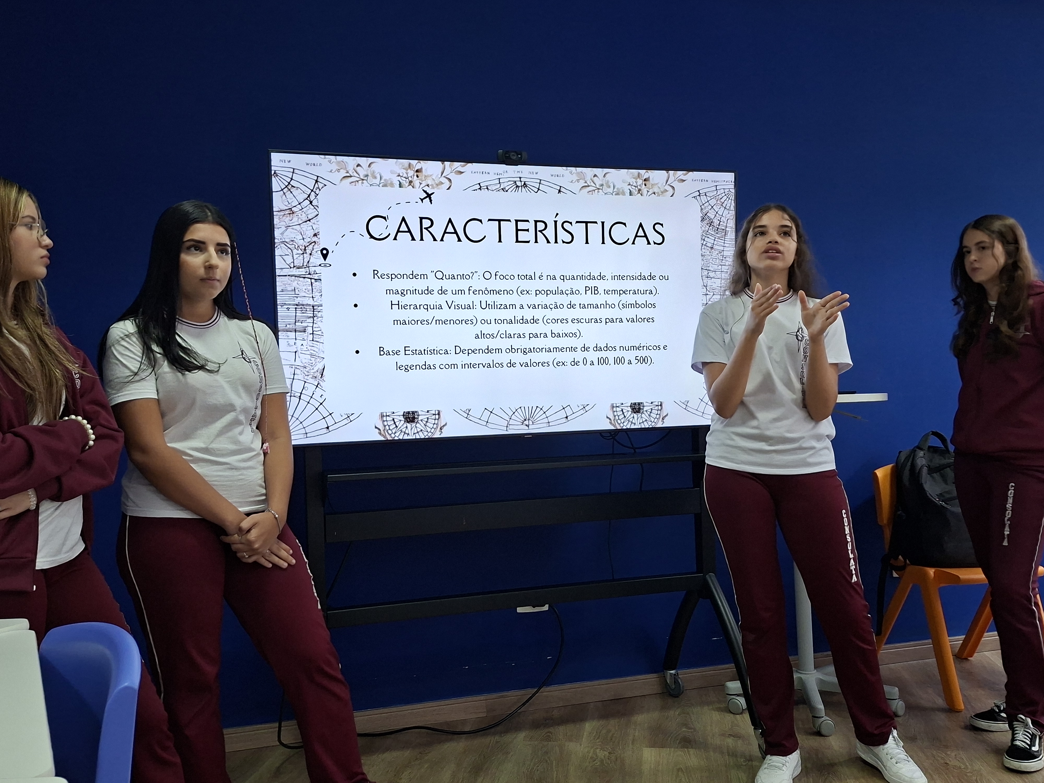 Organizados em grupos, os estudantes exploraram diferentes formas de representação do espaço geográfico, analisando mapas temáticos, representações do relevo, cartogramas e outras linguagens cartográficas utilizadas para compreender a realidade.