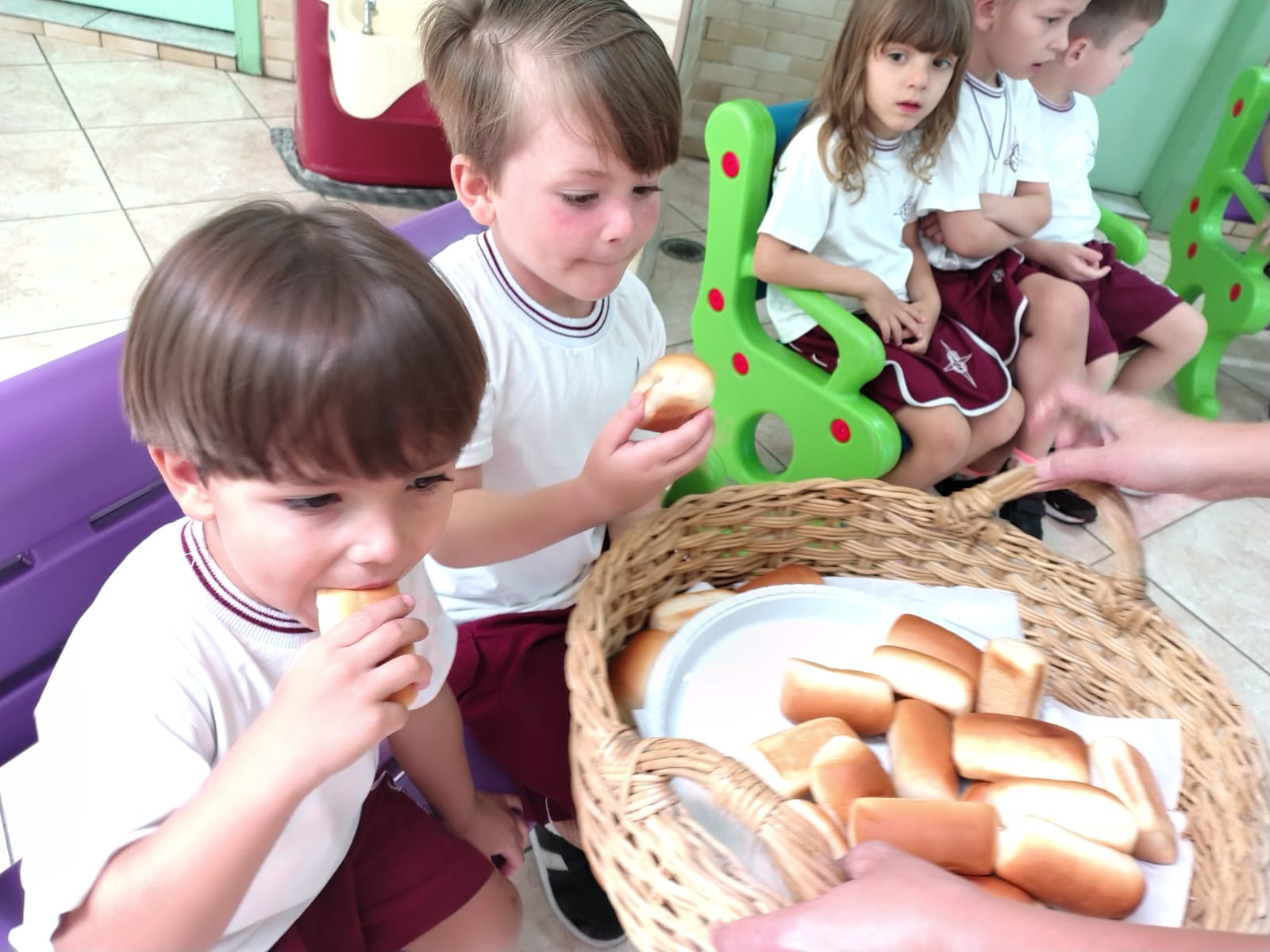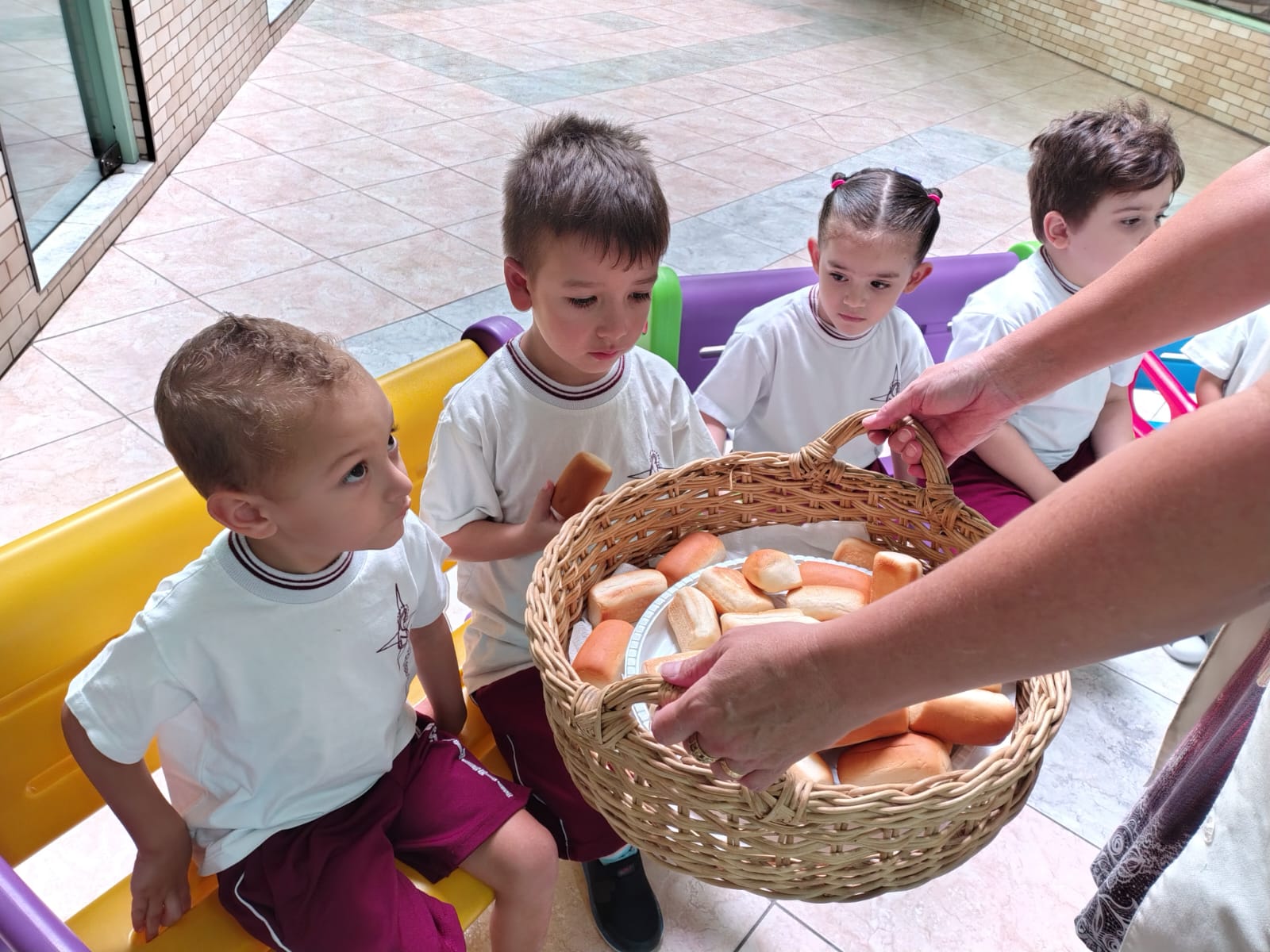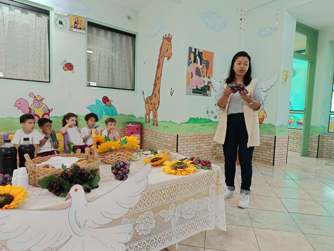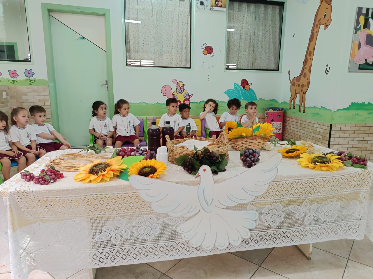 Para enriquecer esse aprendizado, apresentamos os símbolos da Páscoa e contamos a história da Última Ceia, destacando seus significados e ensinamentos. O pão e o vinho, juntamente com os demais símbolos, ajudaram os alunos a compreenderem, de forma simples e sensível, a importância desse momento sagrado.